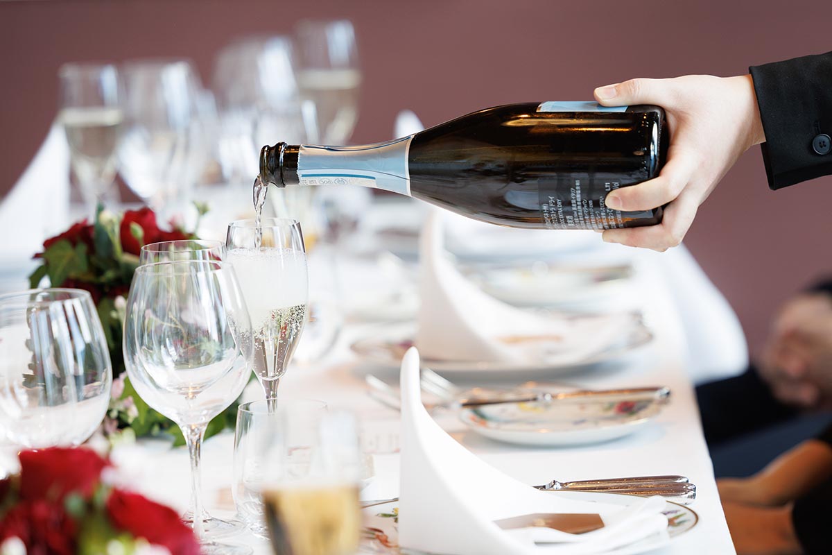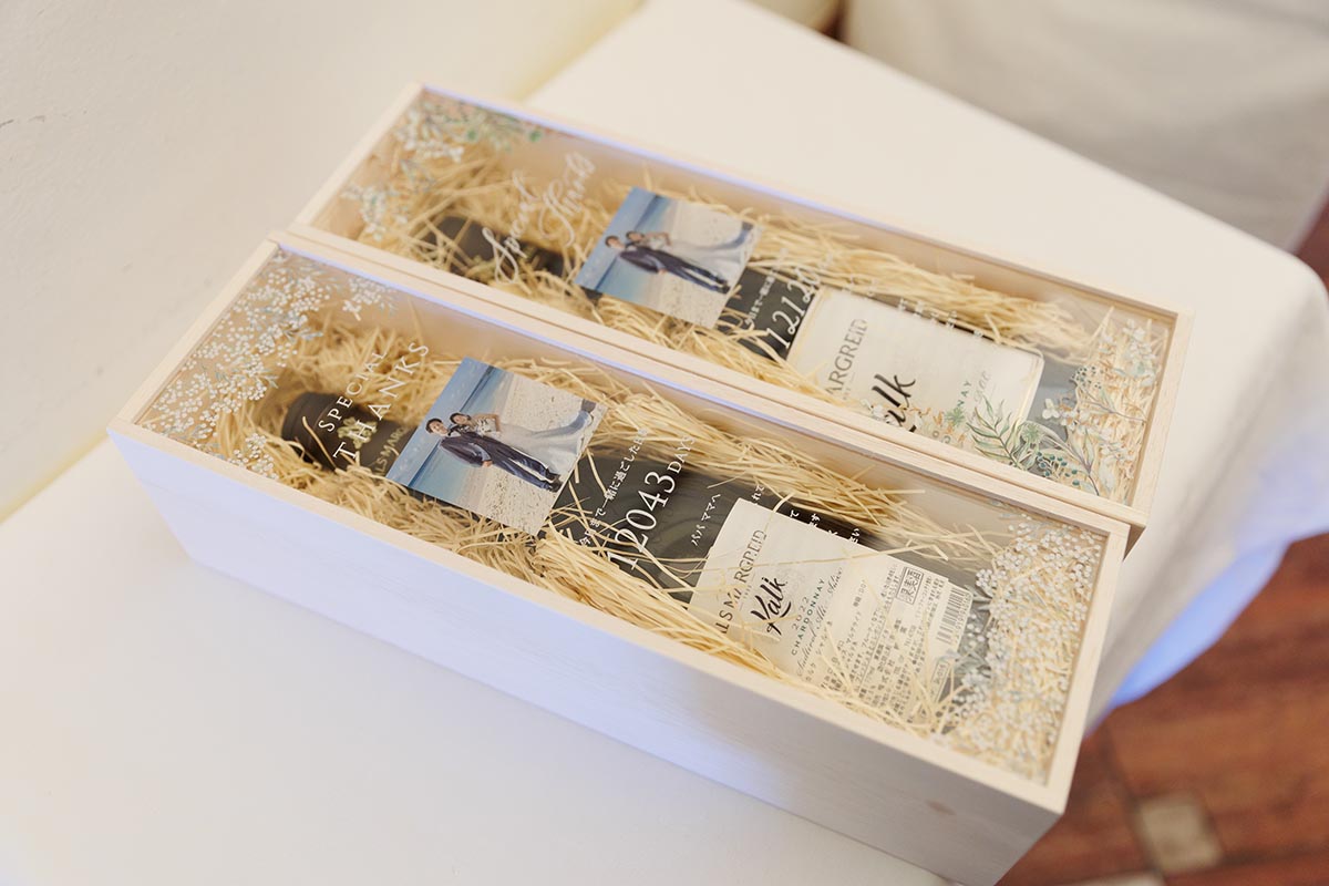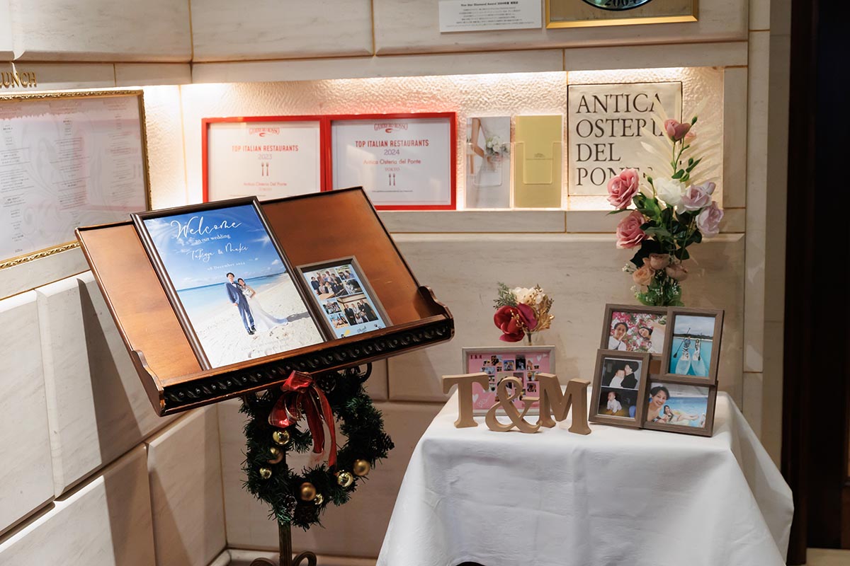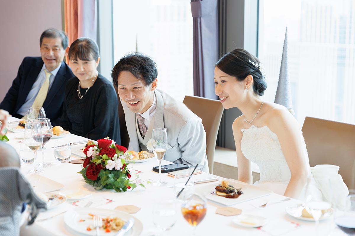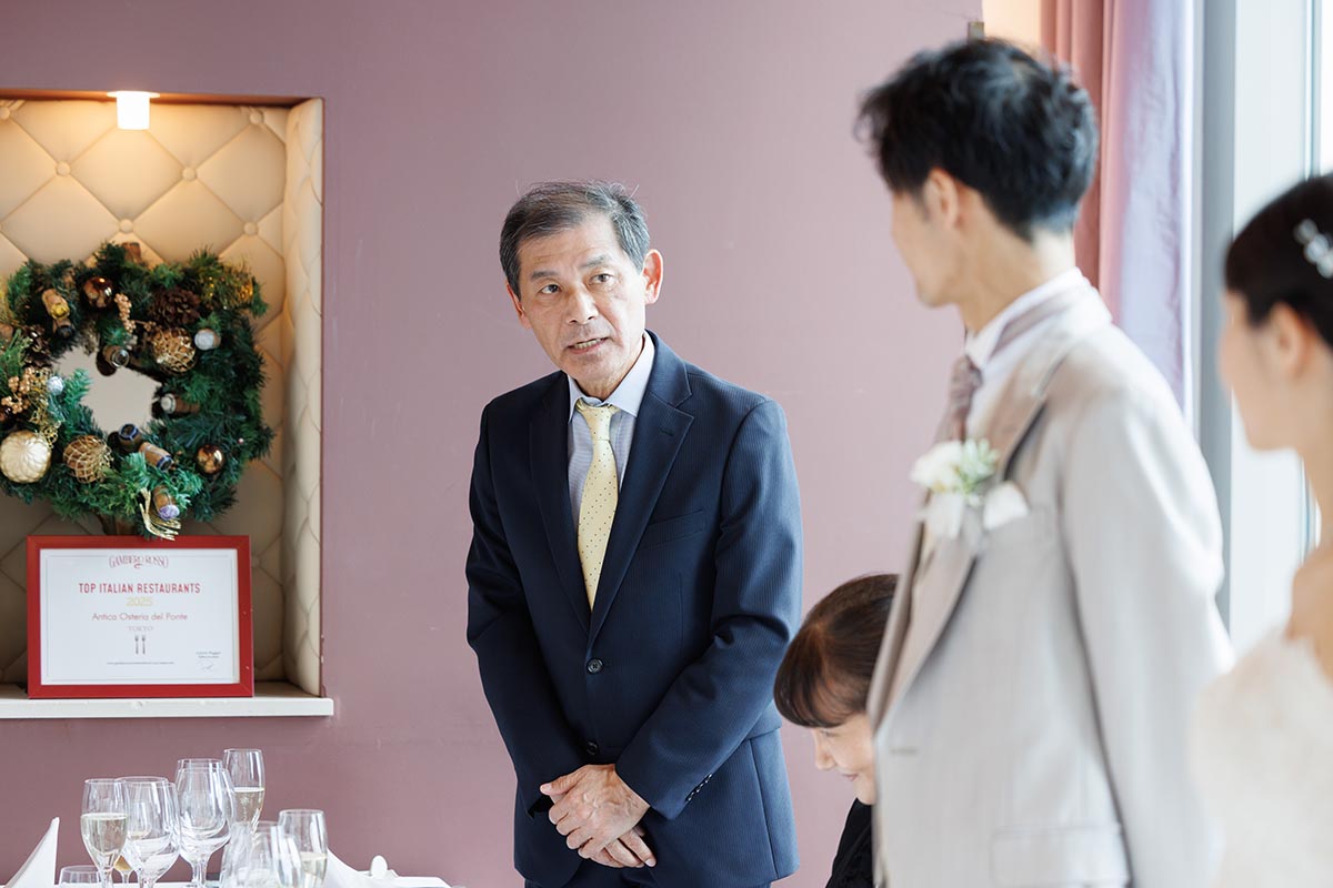 親族のみでの小規模なレストランウェディングとし、お食事を楽しんでもらいながら、親族間で歓談しるアットホームな場にしたかったため、大規模な演出、余興などはあえて取り入れませんでした。1つ行ったのは、産まれてくる子供のジェンダーリビールです。妊娠8ヶ月目でのマタニティウェディングで、既に性別が分かっていたため、くす玉を使ってこの場で発表を行いました。さらに、新郎新婦とも、それぞれ兄弟夫婦の子供(0歳児)がいたため、パパに抱っこしてもらいながら赤ちゃんにくす玉を割ってもらったりと、赤ちゃん達の写真も沢山撮ってもらえるようにしました。