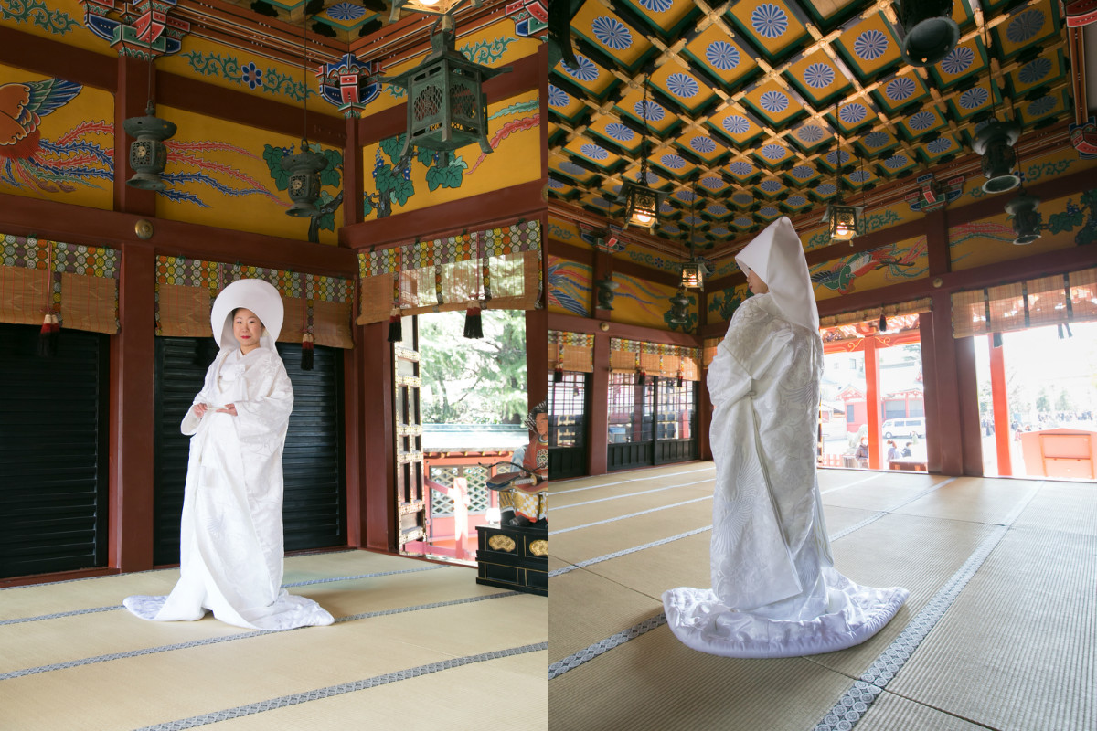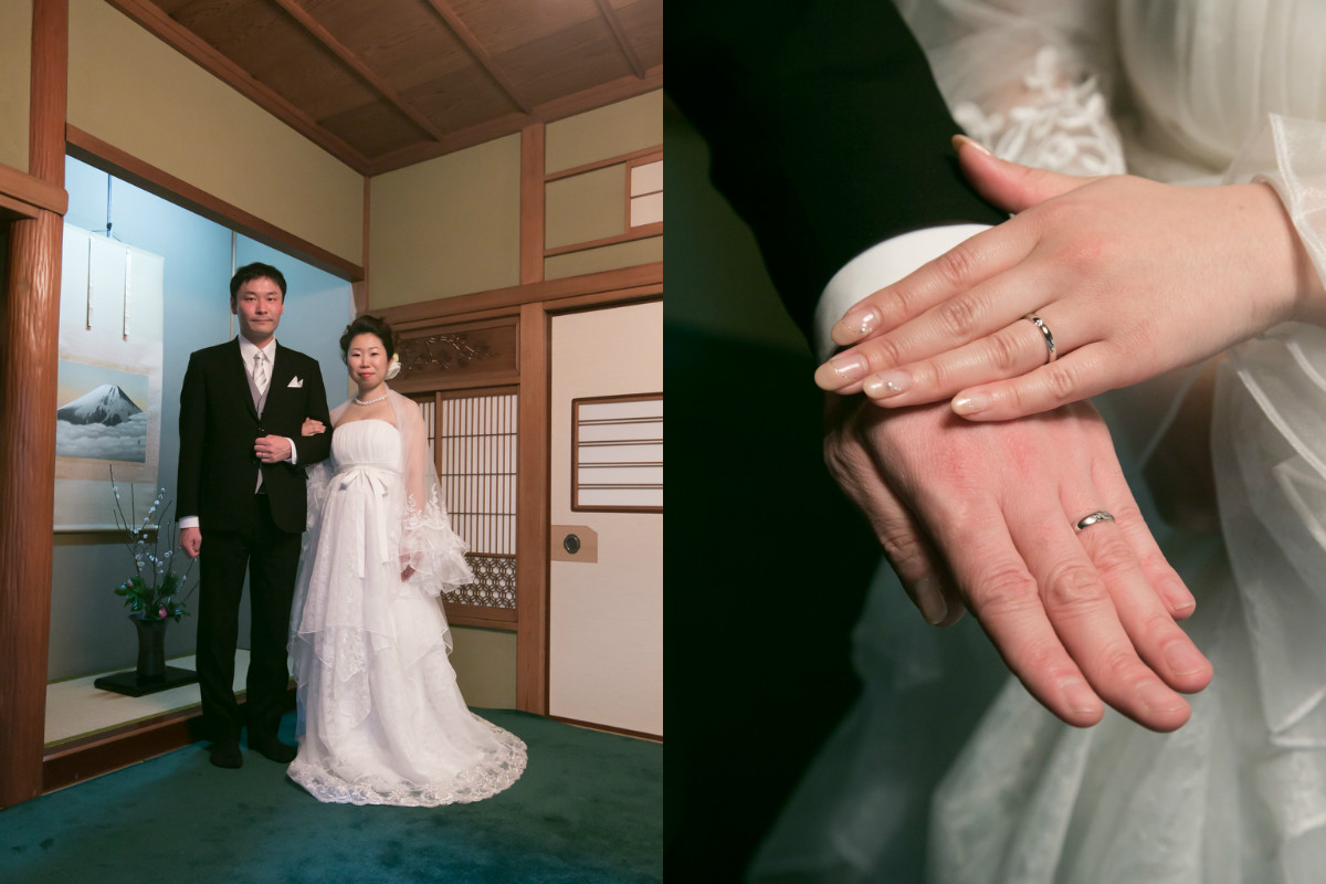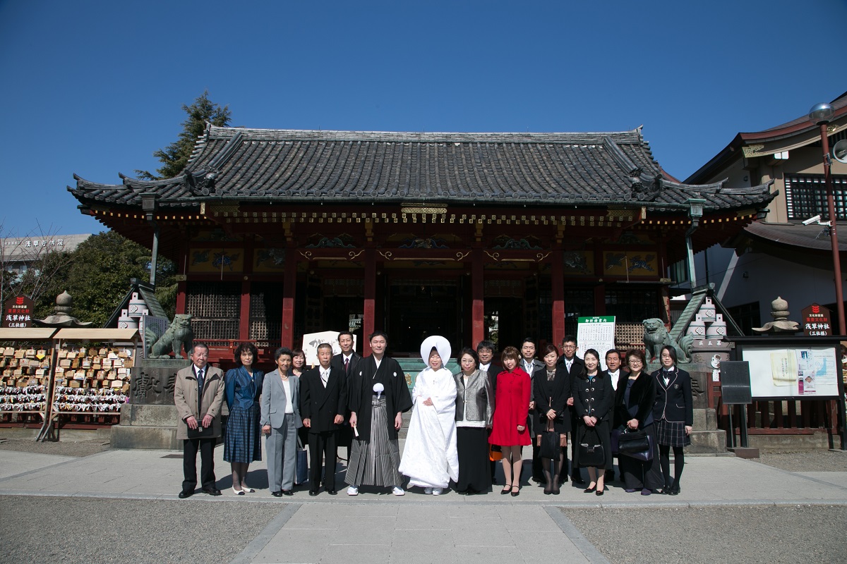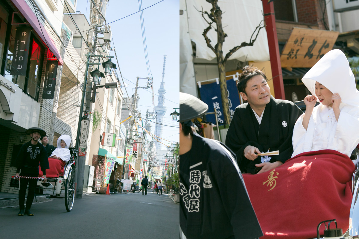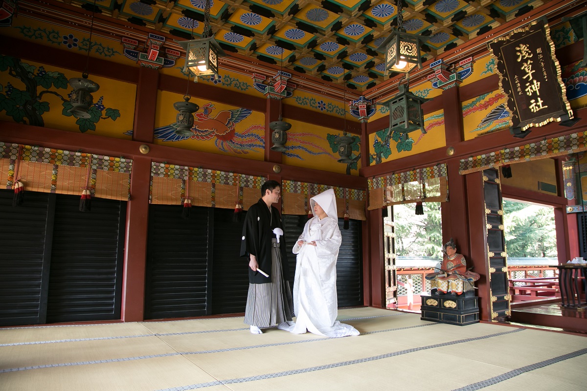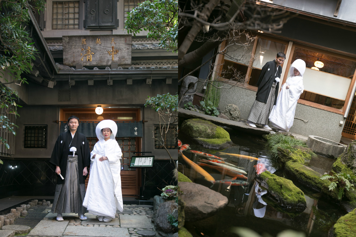 浅草が地元の私(新婦)にとっては、接待や会合に使われそうな敷居の高いイメージがあった「中清」さんでしたが、webサイトで見た中庭の美しさに惹かれました。自分自身がお宮参りの頃からお世話になっている浅草神社でどうしても式を挙げたいと思い、挙式予定まで2か月と少しという短い時間で無理を承知でお願いしたところ、運よく良いお日取りで押さえて頂けました。