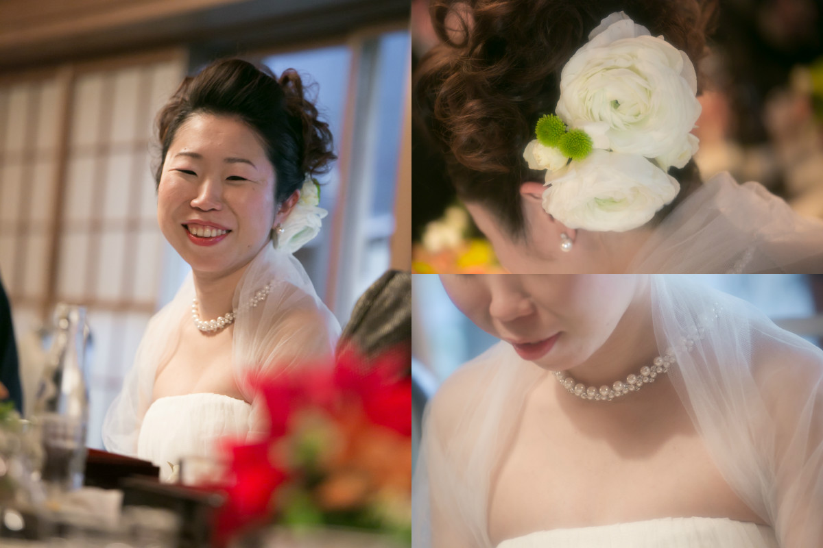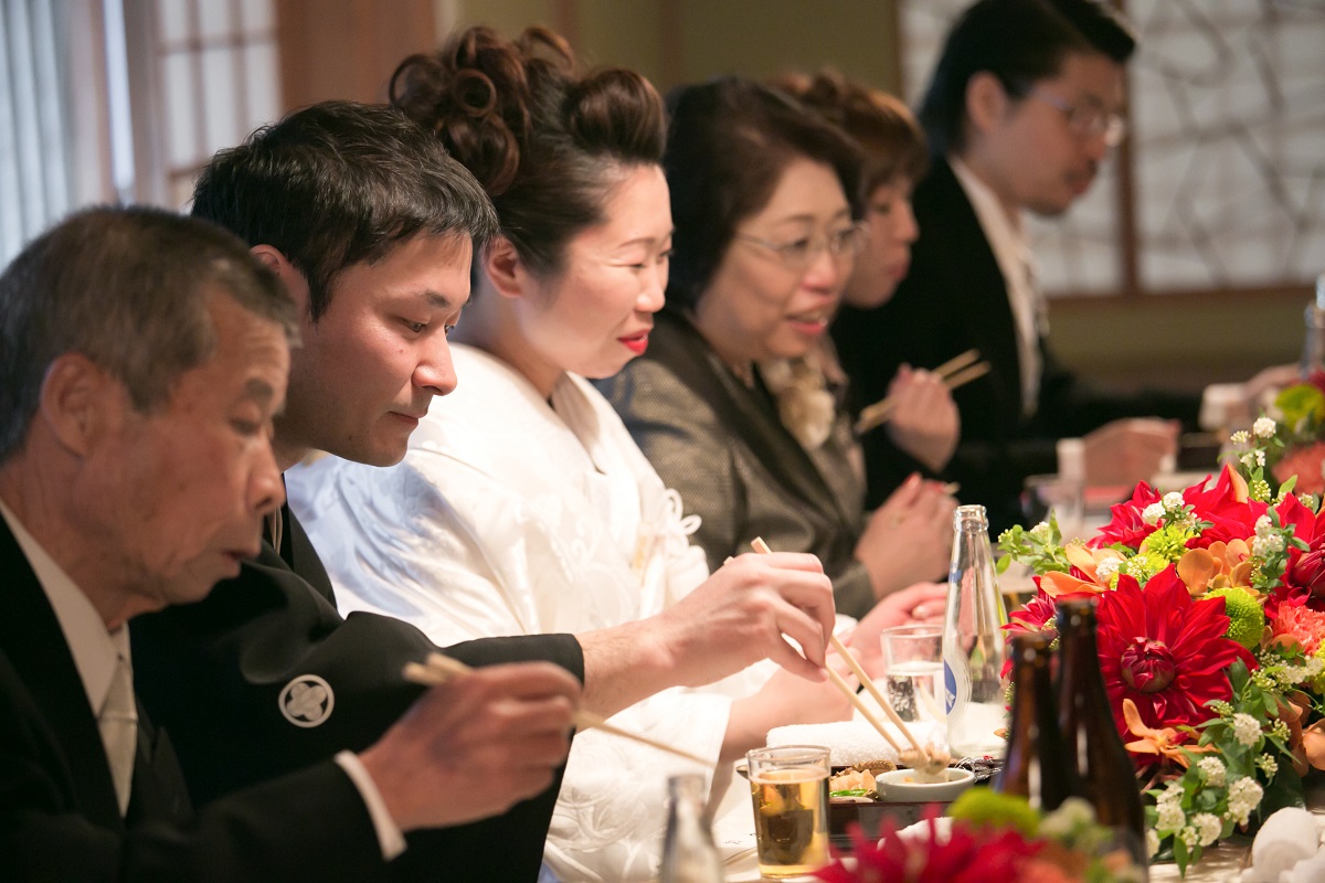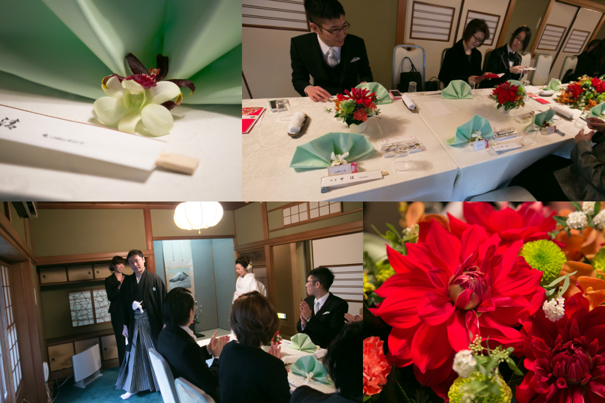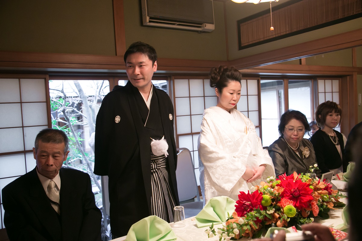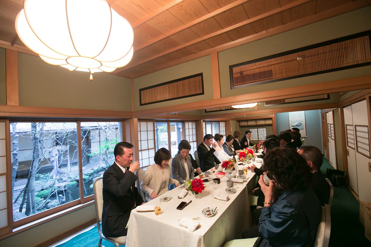 身内の少人数でしたのでテーブルフラワーを華やかに、ナプキンにも小さな花をあしらってもらい、細部までかわいらしさをプラスできました。新郎新婦が来るまでの間にメッセージカードを記入してもらうために、そして式の後にも使ってもらえるよう名入れのボールペンを用意しました。年配者には漢字で、若者には筆記体のローマ字でそれぞれフルネームで彫りました。皆様、記念になったととても喜んでくれました。お店の雰囲気を味わってもらう為、あえてBGMを流しませんでした。かわりに中庭の池の水のせせらぎがとても心地良かったです。老舗の料理一つ一つを集中して味わってもらいたくて、ケーキ入刀などの演出はしませんでした。その分、自分達も料理をゆっくりと味わうことができましたし、時間に余裕ができ、会話も弾みアットホームな披露宴になりました。