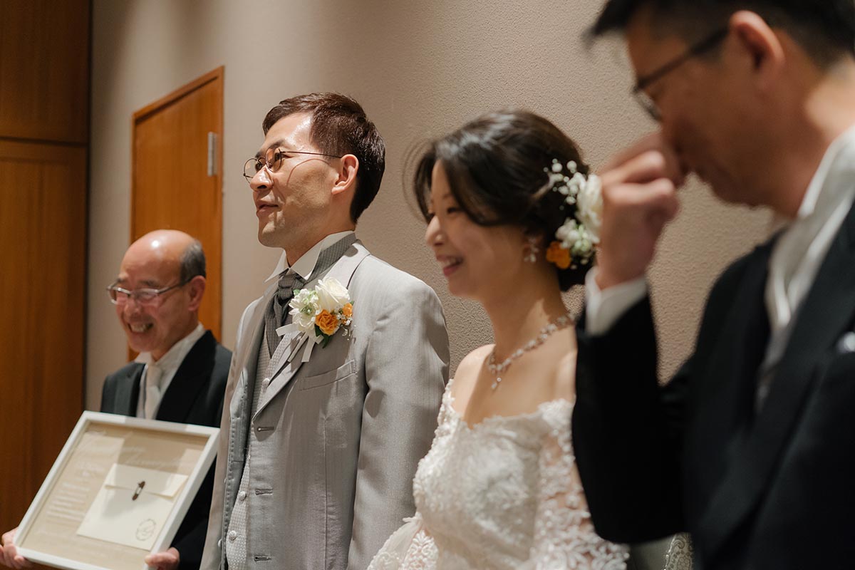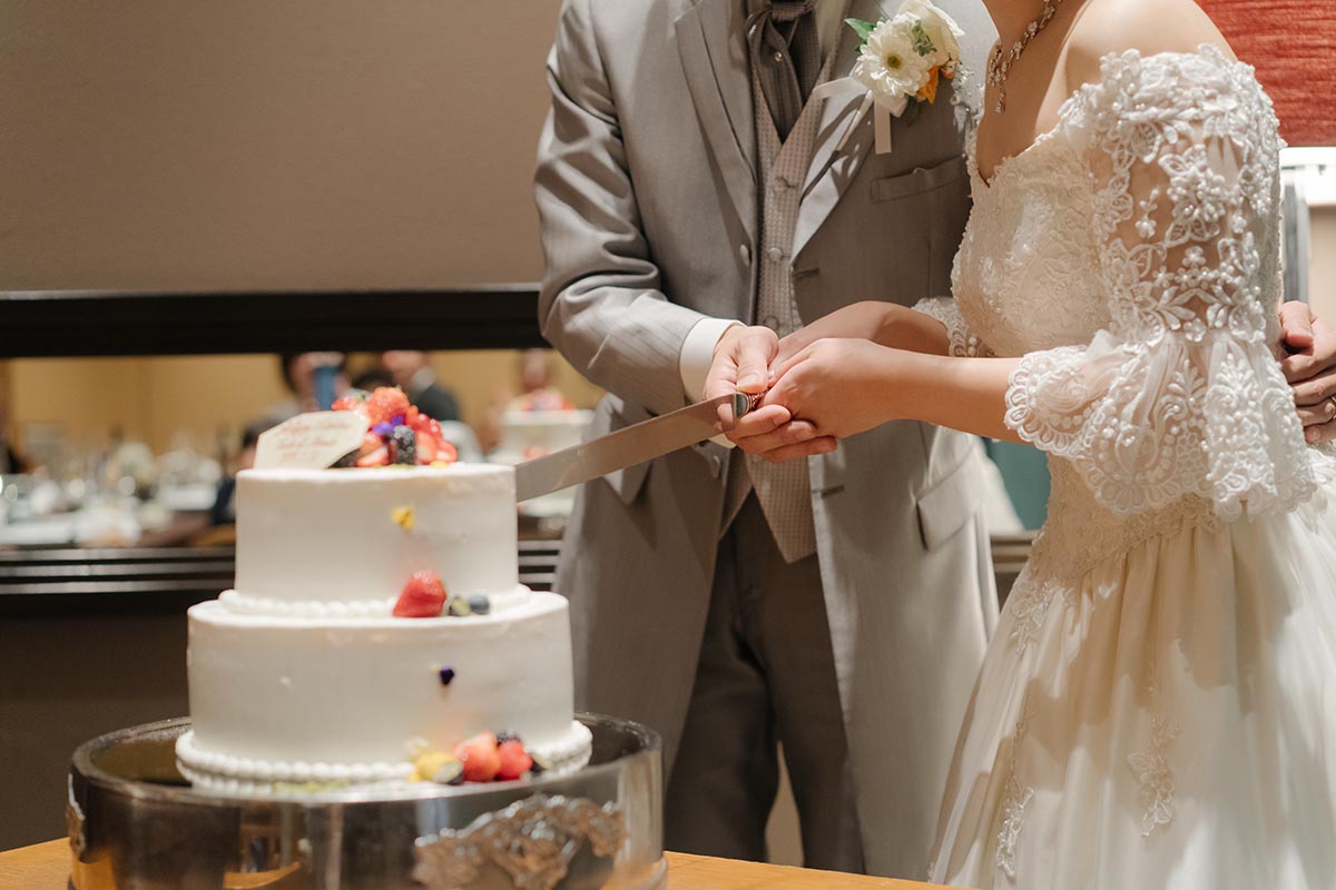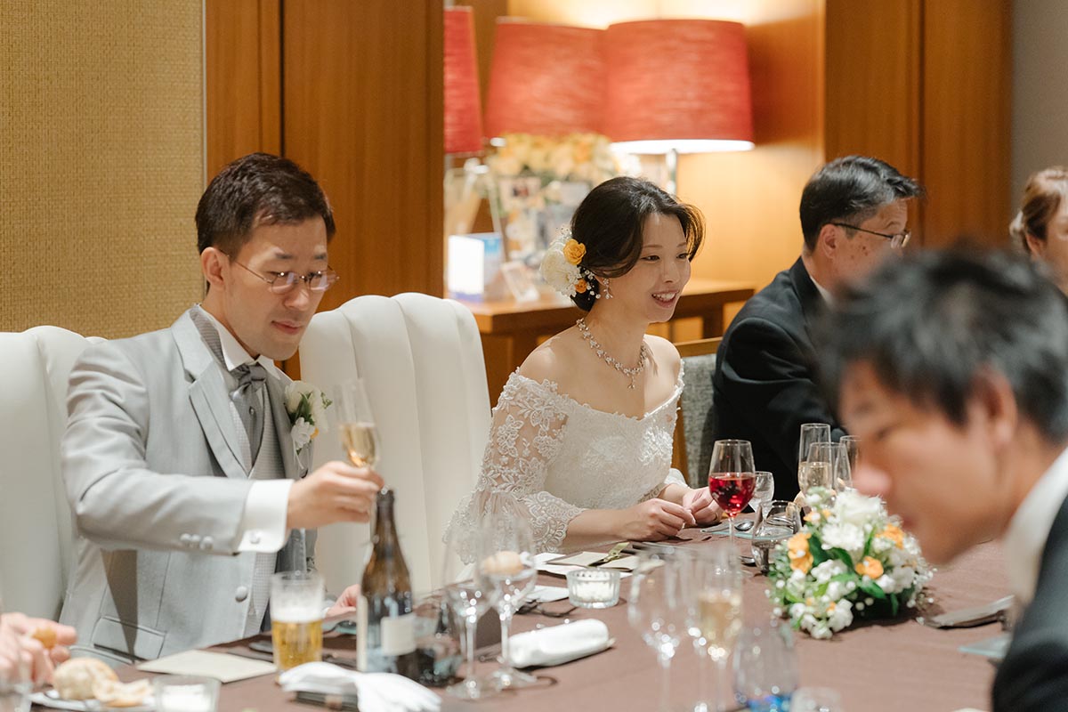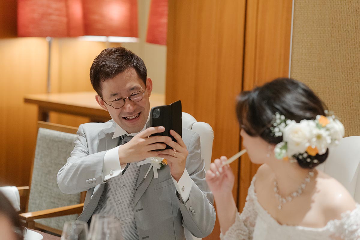 新郎新婦と親族が緊張をせず、リラックスして会食ができることを目的に、演出や余興を決めました。まずは親族紹介ですが、食事をとったりお酒を飲みながら和やかな雰囲気で行いたいと思い、披露宴の最中に行いました。ファーストバイトでは、新郎新婦それぞれの兄弟姉妹が結婚していたため、お手本をやってもらいました。それぞれの家庭の雰囲気が出て、良かったと思っています。プロフィールムービーは、自作のものを上映しました。親族との写真を中心にしたので、喜んでくれました。演出を絞りお色直しも省略したため、新婦もお料理を完食でき大満足でした。