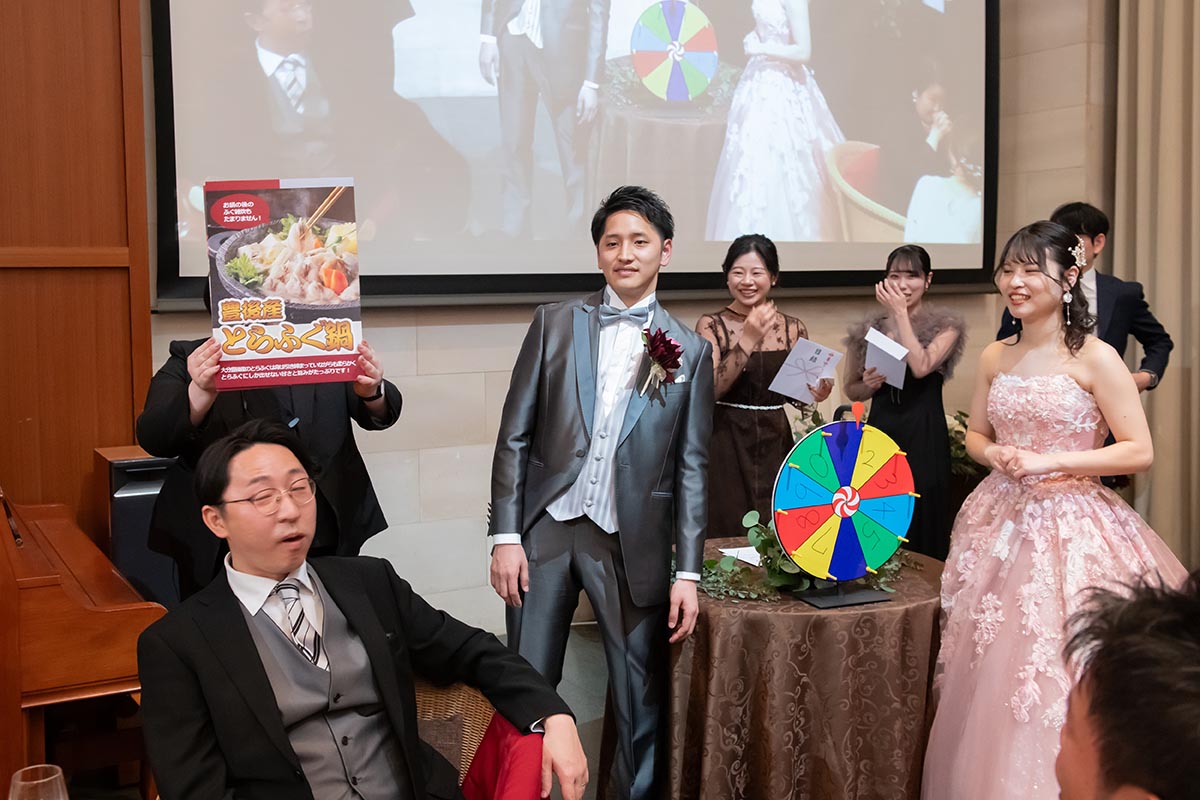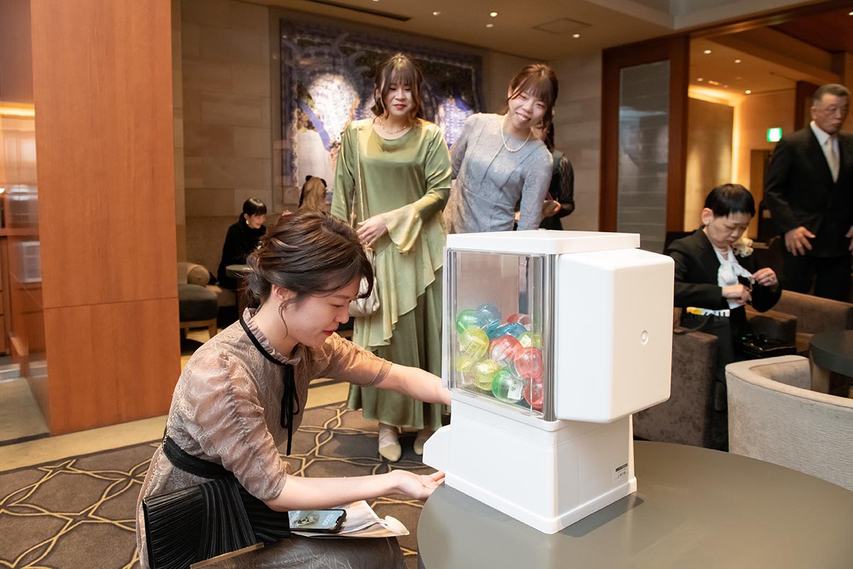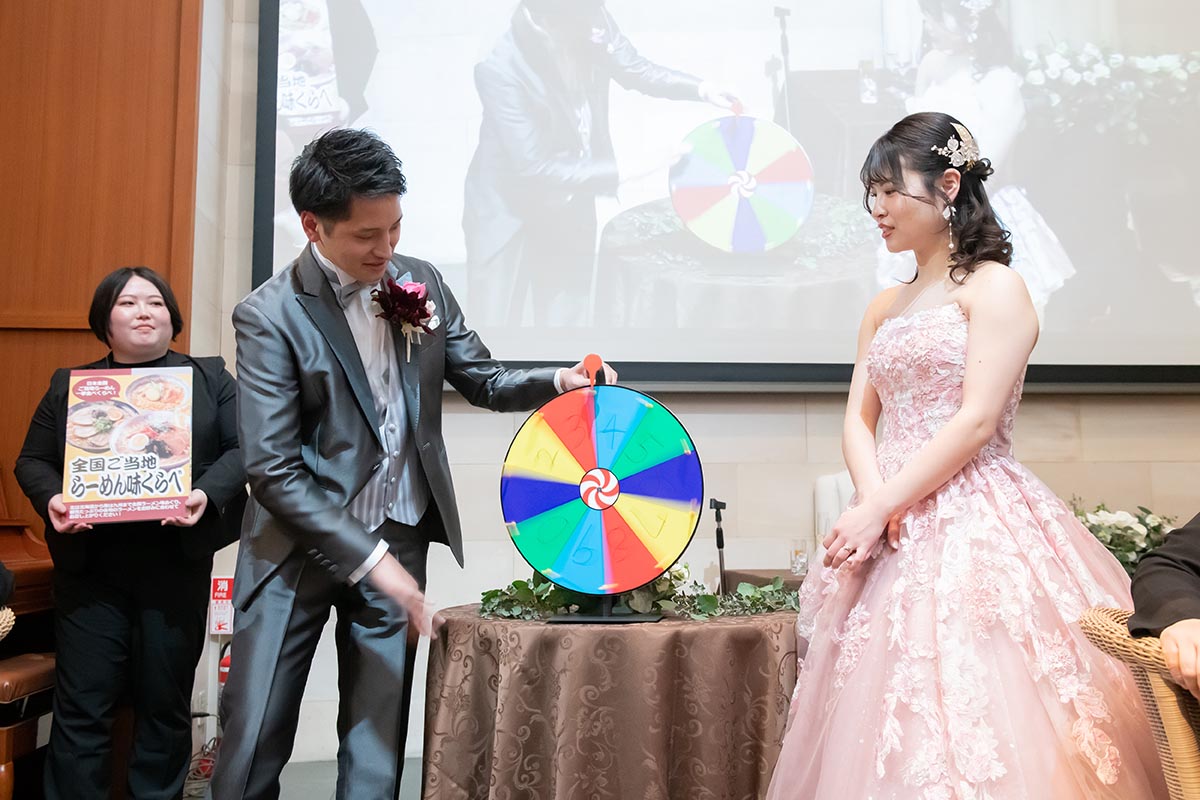 ガチャガチャが好きなので、ガチャガチャをレンタルして設置し、中に入っているおみくじの番号で抽選会をしました。当日の変更点もありましたが、司会の方とプランナーさんが柔軟に対応くださいました!ゲストの方の反響も良く、私たちらしい結婚式ができました。
