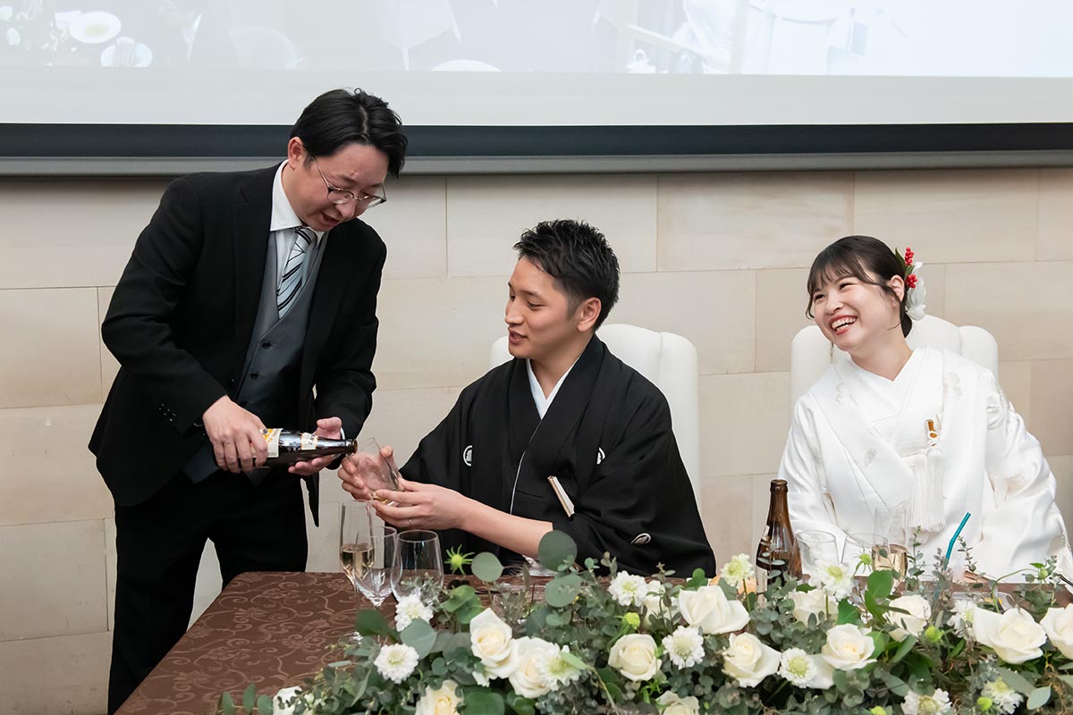 お料理は、ゲストの皆さんに喜んでいただける一番のチャンスなので、妥協しないように心がけました。当日のコースも全て試食させていただきましたが、どのお料理も絶品で「これは喜んでいただける!」と確信しました。メインは牛肉に変更しましたが、そのまま変更せずに豚肉でも十分美味しかったです。飲み物は、種類を増やしたかったので、変更しました。そのままのプランだとお酒の種類が少なかったので、変更して正解だったと思います。シャンパンも飲み放題に含まれていたので、ゲストの皆さんに喜んでいただけました。