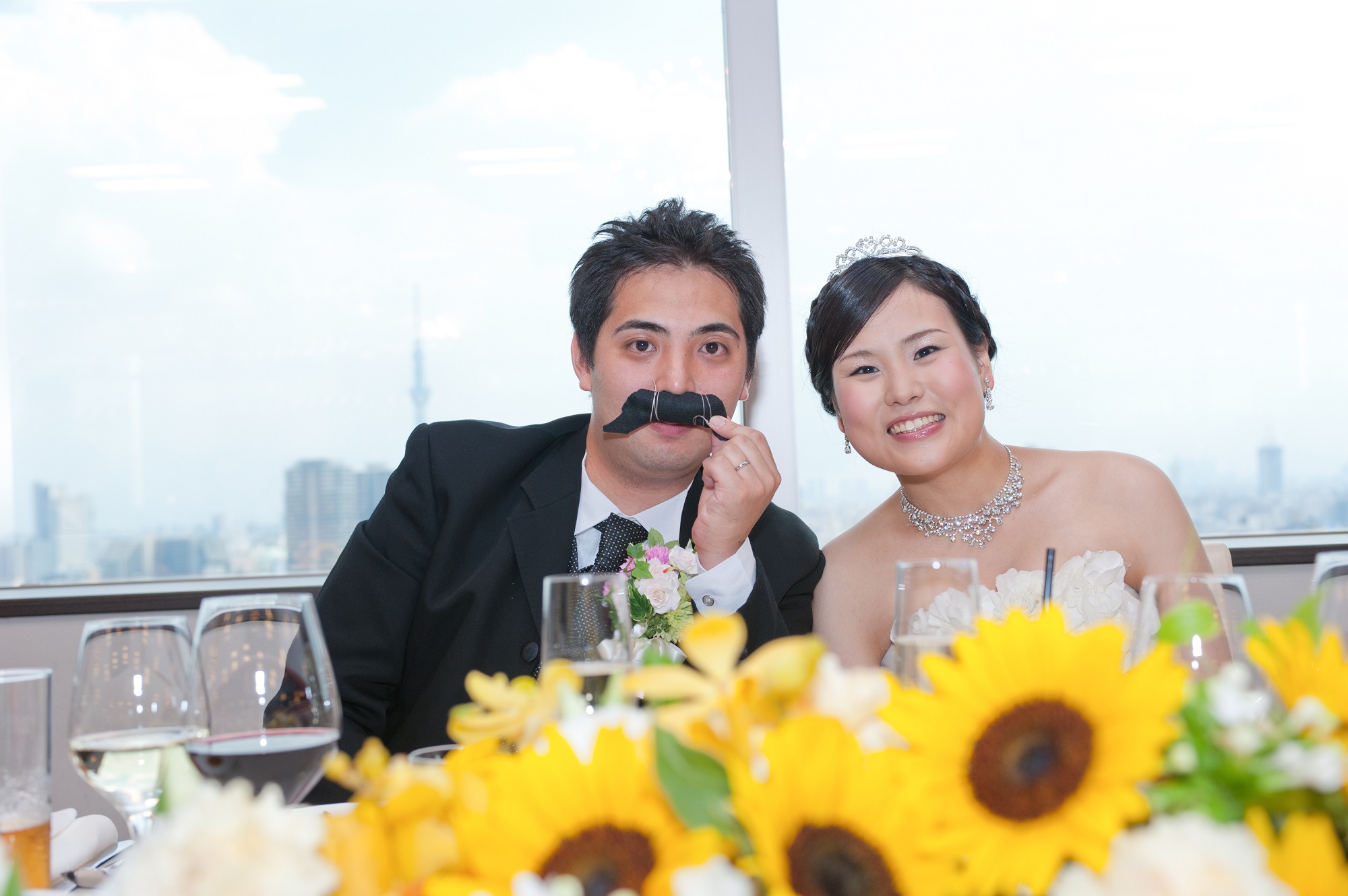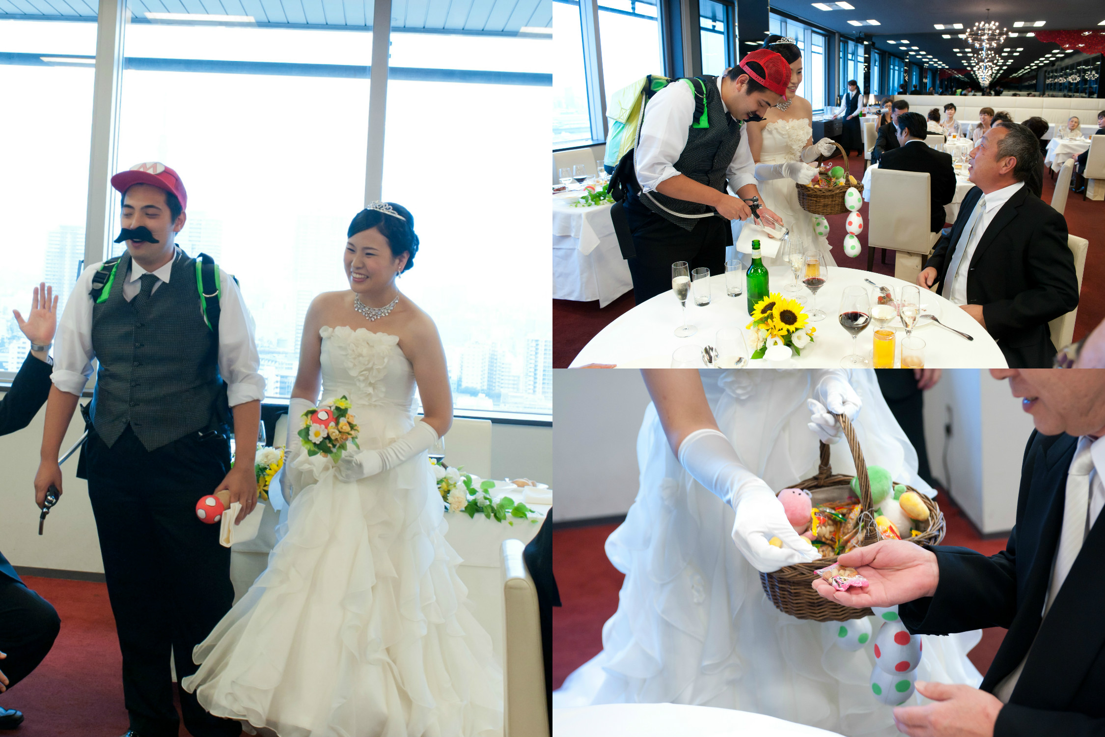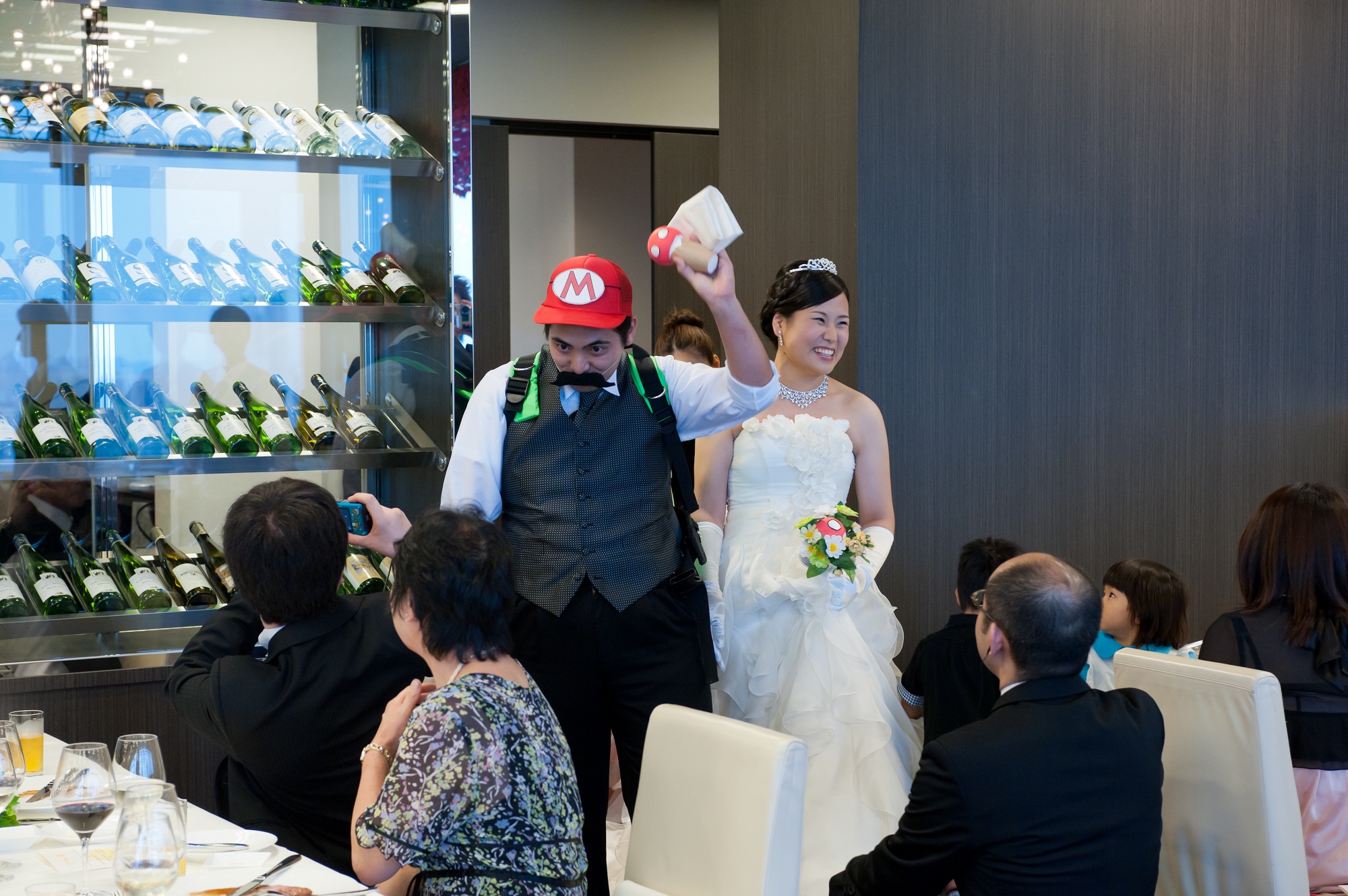 ゲストに楽しんでもらえる結婚式にしたかったので、そこに重点を置きました。自分たちでプロフィールDVDを作るという点以外にも何か出来ないかな?と思っていたのですが、プランナーの浅木さんの提案のもと、お色直し後のテーブルラウンドで新郎がビアサーバを背負って注ぎながら回るというのをやりました。お色直しのドレスチェンジもしなかったので、さすがにちょっと寂しいかな?と思い、自分たちで手作りした小物を使い、最終的には新郎がマリオに仮装してのテーブルラウンドとなったわけですが、これが思った以上にゲストの方に好評で、思い切ってやって良かったです!会場が盛り上がった中で、その後の友人の余興にもいい感じで繋げられたと思います。