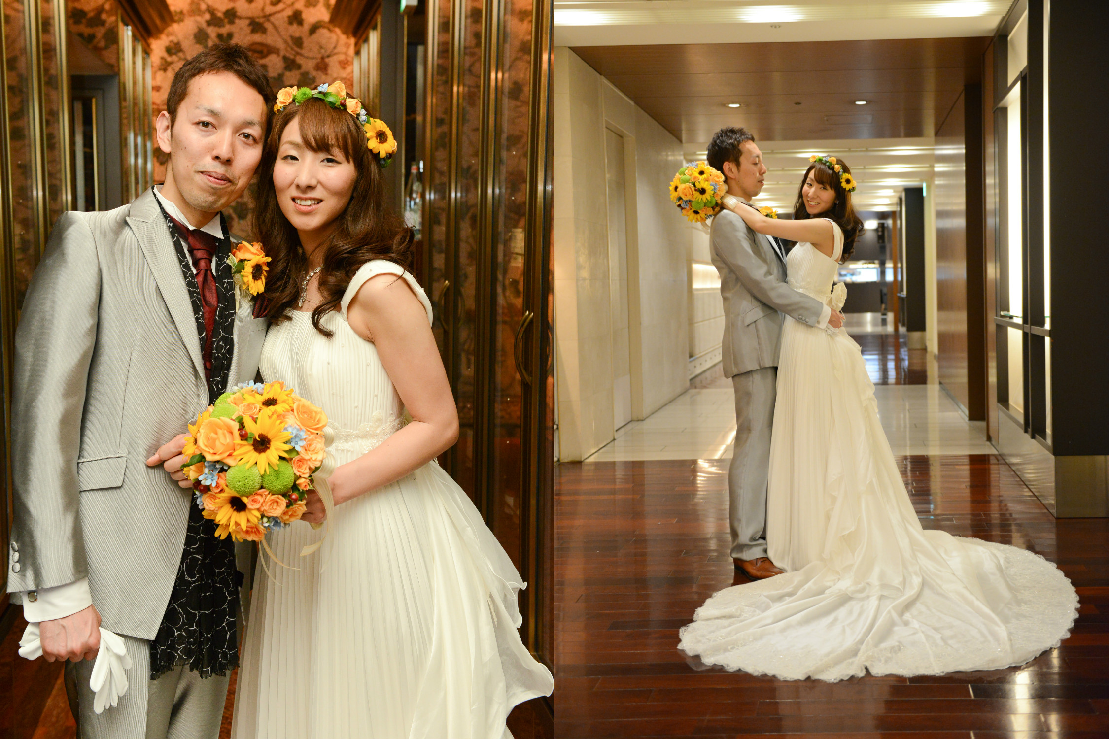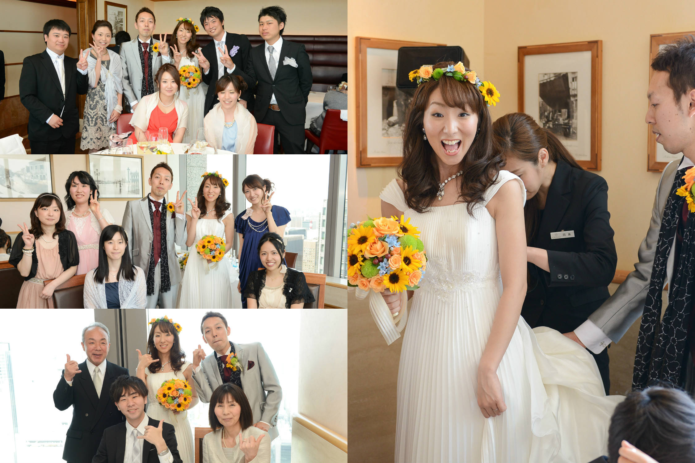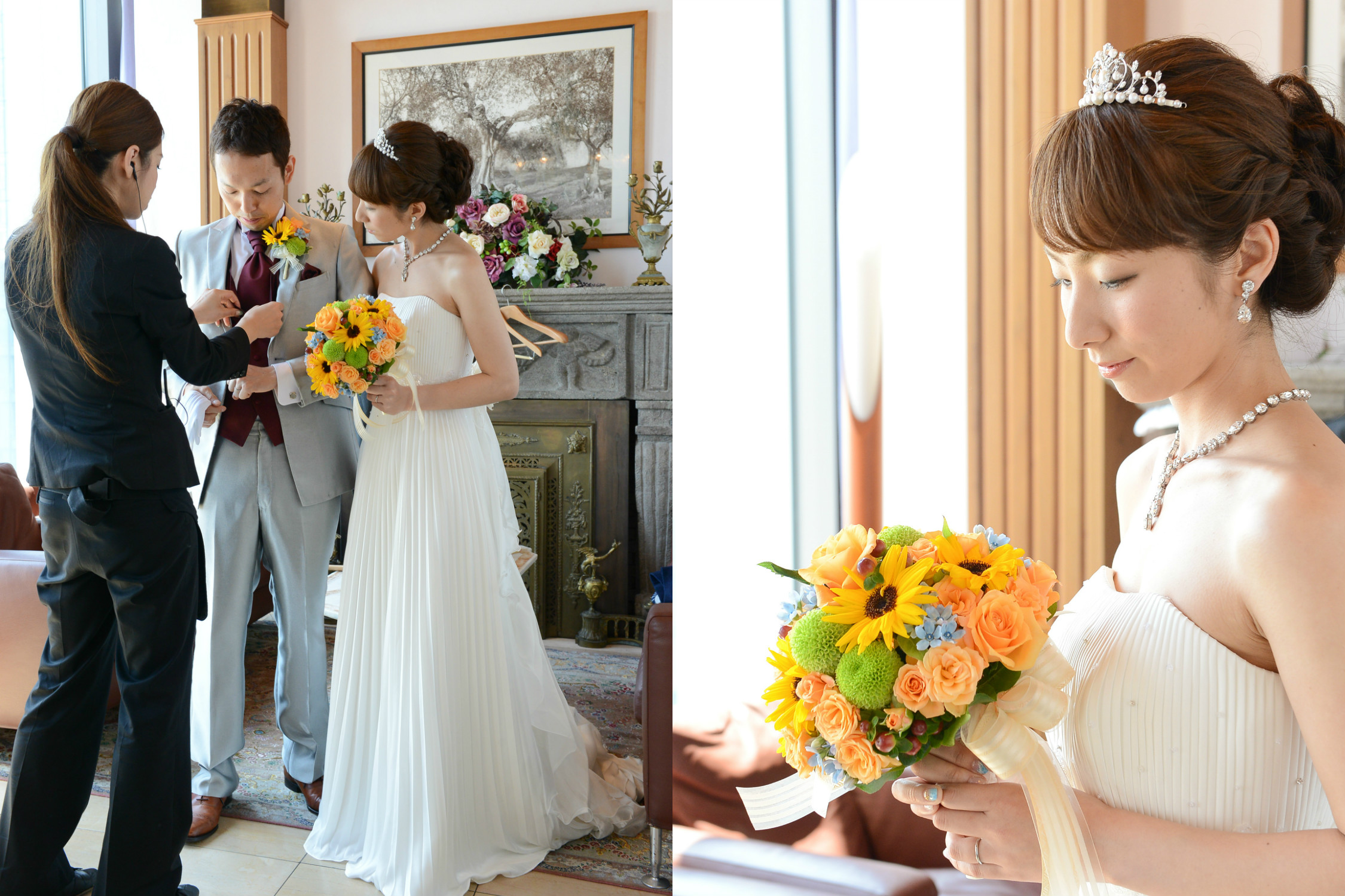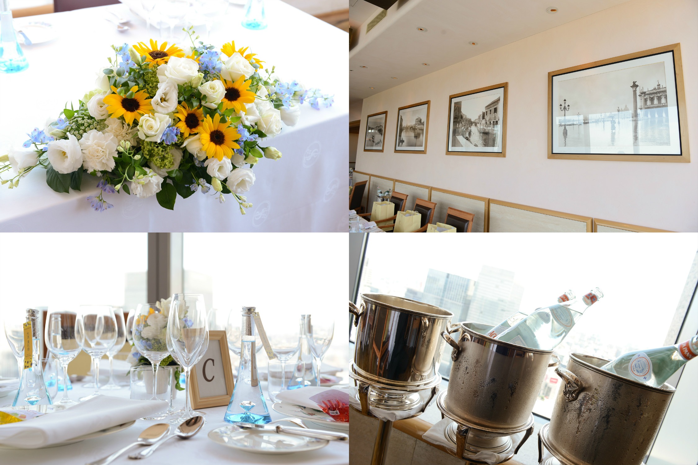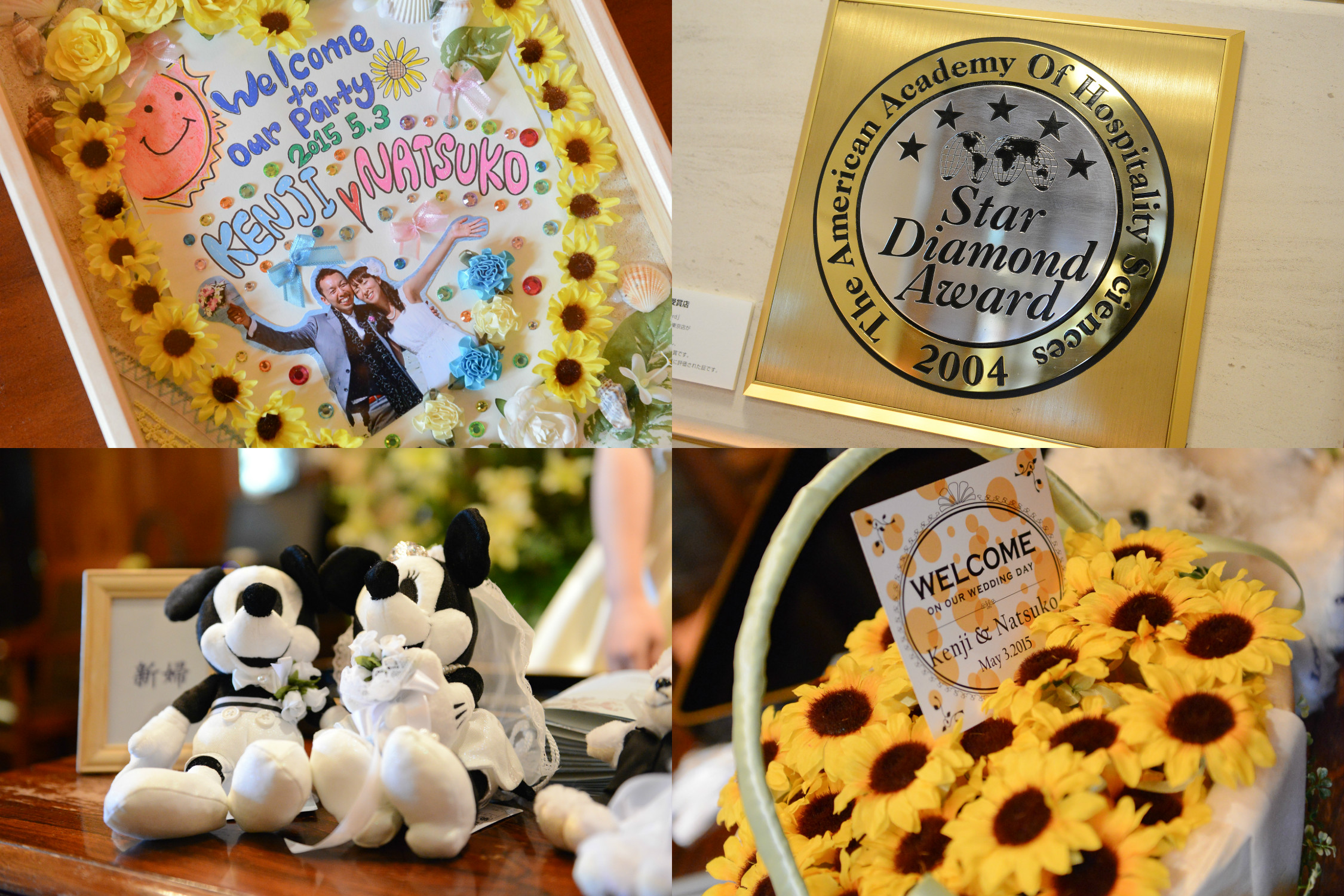 私たちはグアムで結婚式を挙げているので、グアムの雰囲気も感じてもらえるよう、海をイメージできる水色を多く取り入れたり、夏を象徴する花「ひまわり」をたくさん使用し、明るい会場作りに力を注ぎました。