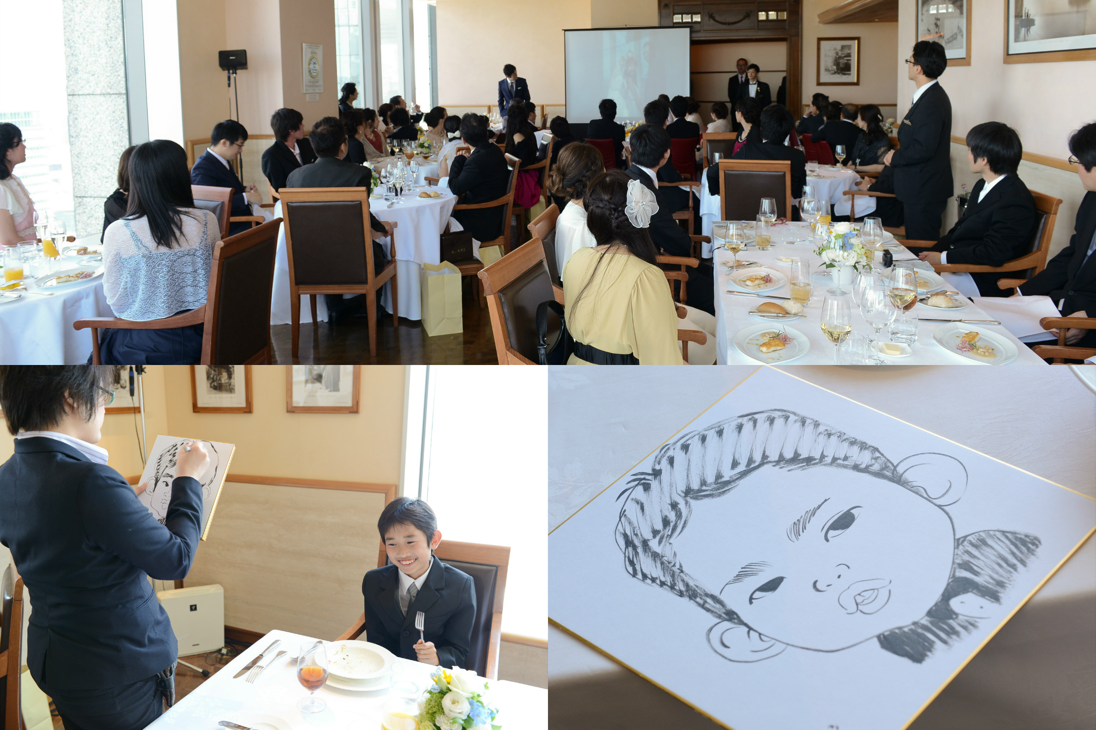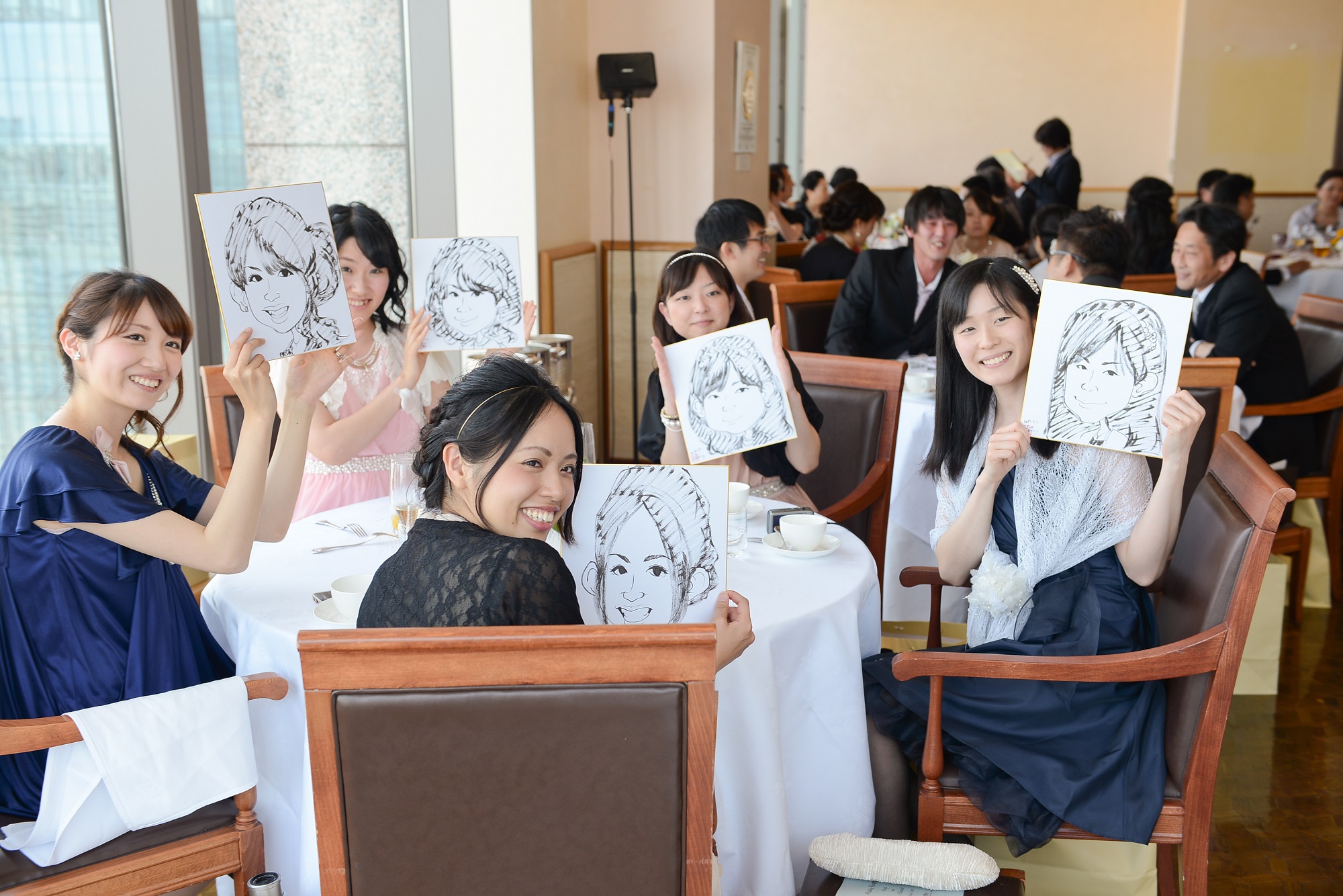 ラリアンスで行っているウェディングフェアに参加した際、ゲストへのサプライズプレゼントとして、似顔絵を描いてくれる絵師さんがいることを知り、おもしろい演出があるなぁと、お願いをしました。