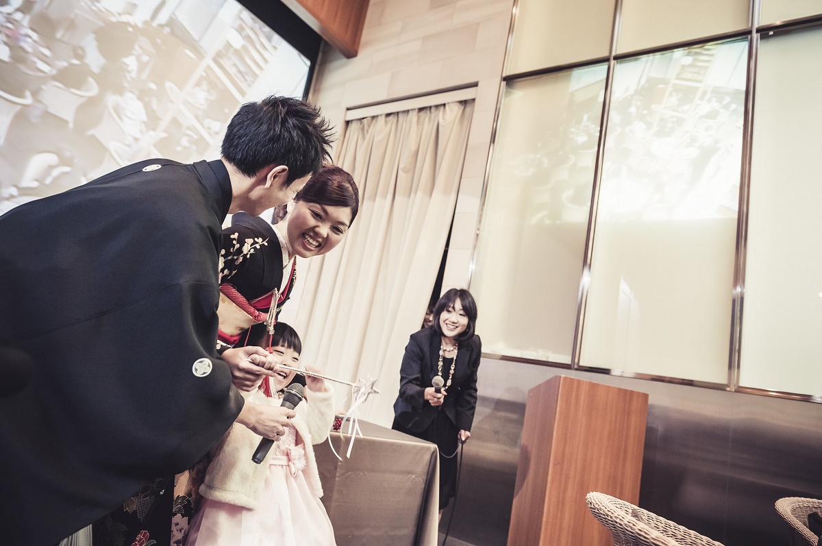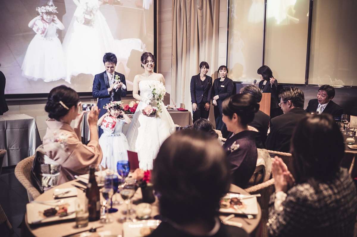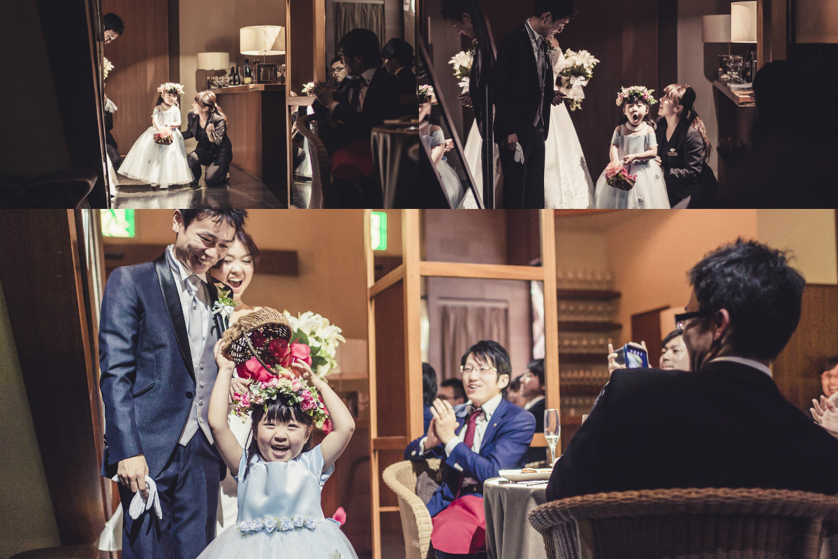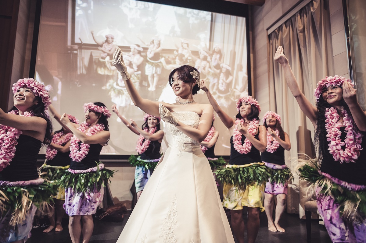 姪にフラワーガールをしてもらうこと、友人たちと一緒にフラダンス・タヒチアンダンスを踊ることが披露宴の演出のポイントでした。4歳の姪に魔法をかけてもらいキッチンオープンをしたり、お色直しの再入場時には私たちが手作りした花冠をつけて先導してもらいました。途中で花びらの入ったバスケットをひっくり返してしまったハプニングもありましたが、会場内を笑顔いっぱいにしてくれました。また友人たちとのダンスでは、テンポの速い曲から始め、途中からは新婦もドレスのまま踊り、ゲストの皆さんが大変盛り上がりました。ゲストの皆さんを飽きさせることなく、披露宴の2時間があっという間だと感じてもらうことが出来ました。