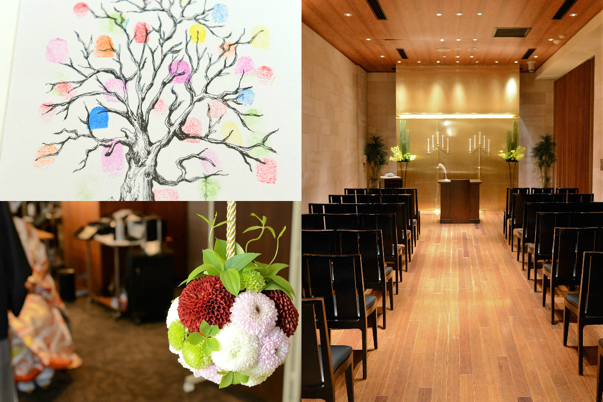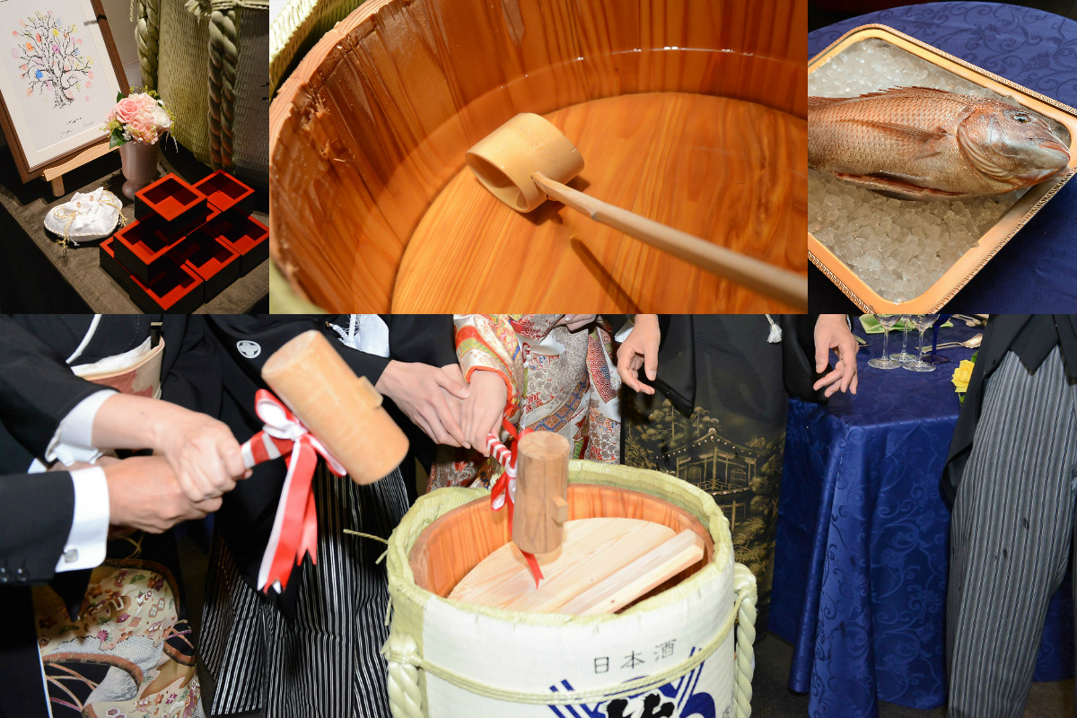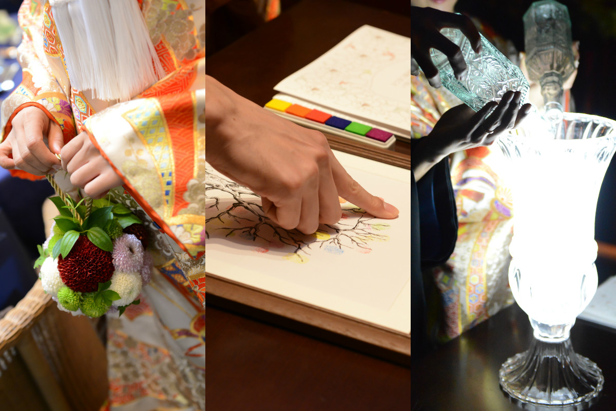 ありきたりな感じにはしたくなかったです。いつか親戚で集まった際の「面白い式だった、よく覚えているよ」という会話を期待しながら(笑)演出を考えました。まずは挙式。チャペルの人前式を、和装で行いました。チャペルで和装!?という感じですが、問題ありません。装花の力は凄いもので、チャペルを和モダンな空間に変身させることができるのです。そんな中で、自分たちで考えた誓いのことばを読みました。水合わせの儀も、「光る器」を使いました。水を入れると光り輝きます。式場を暗転して、水を入れたのが一目瞭然!というような演出をしました。神社は暗転しないですからね(笑)。目でも楽しんでほしいという思いからです。そして、披露宴ではケーキではなく鯛に入刀したり、共通の趣味であるピアノ演奏をしたり、父の故郷のお酒やジュースをメニューに加えていただいたり、ゲスト参加型の鏡開きを行ったり…自由にやらせていただきました!