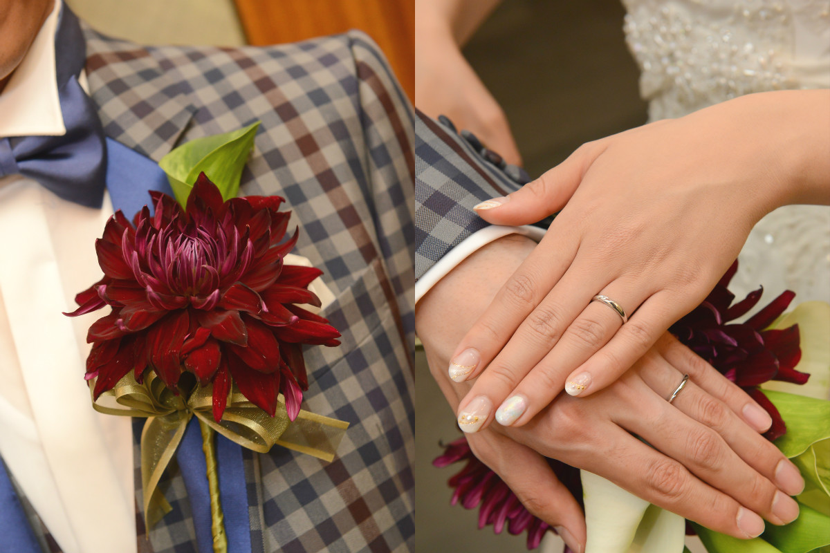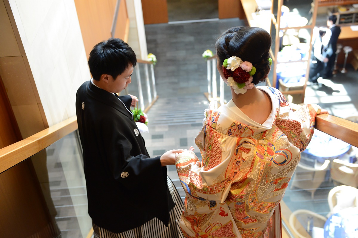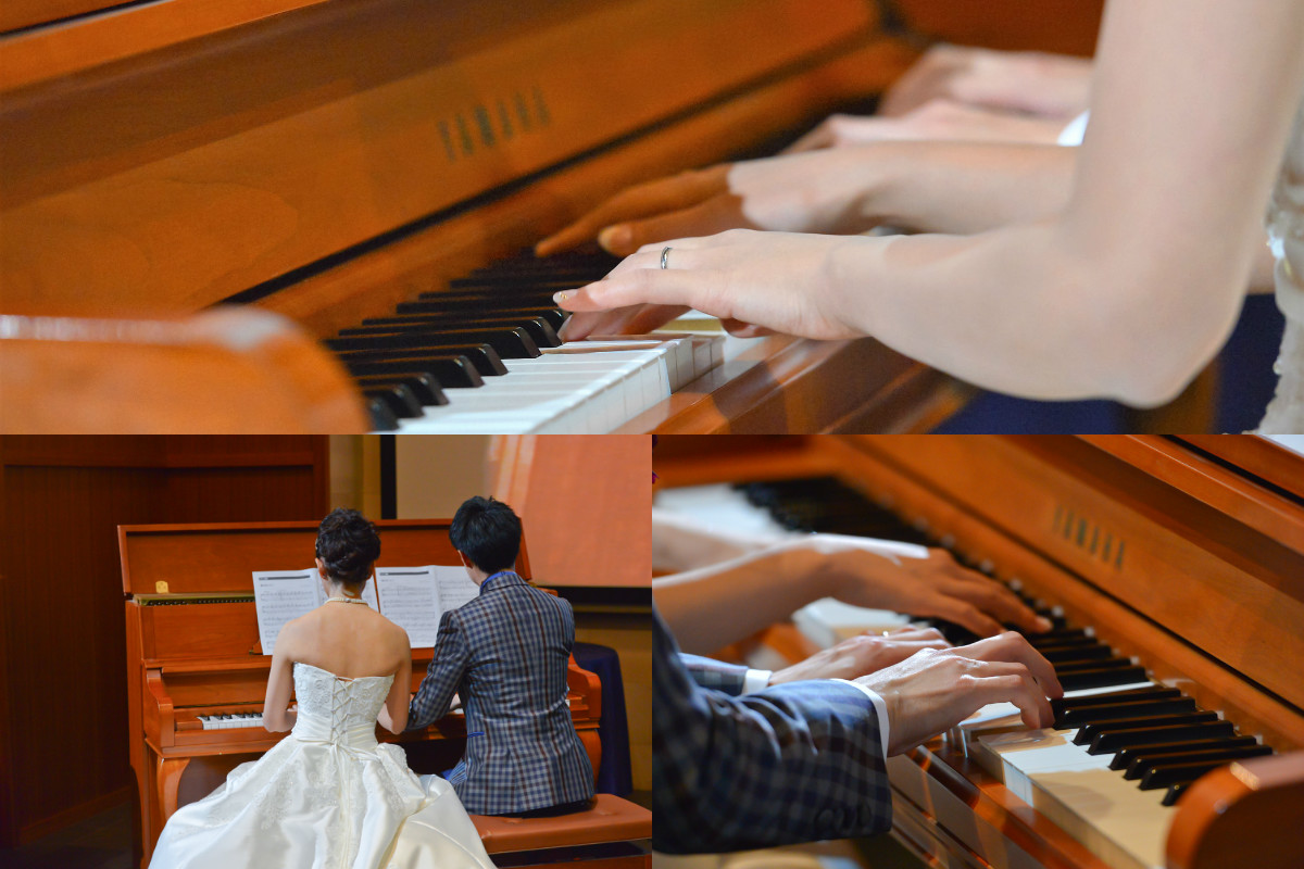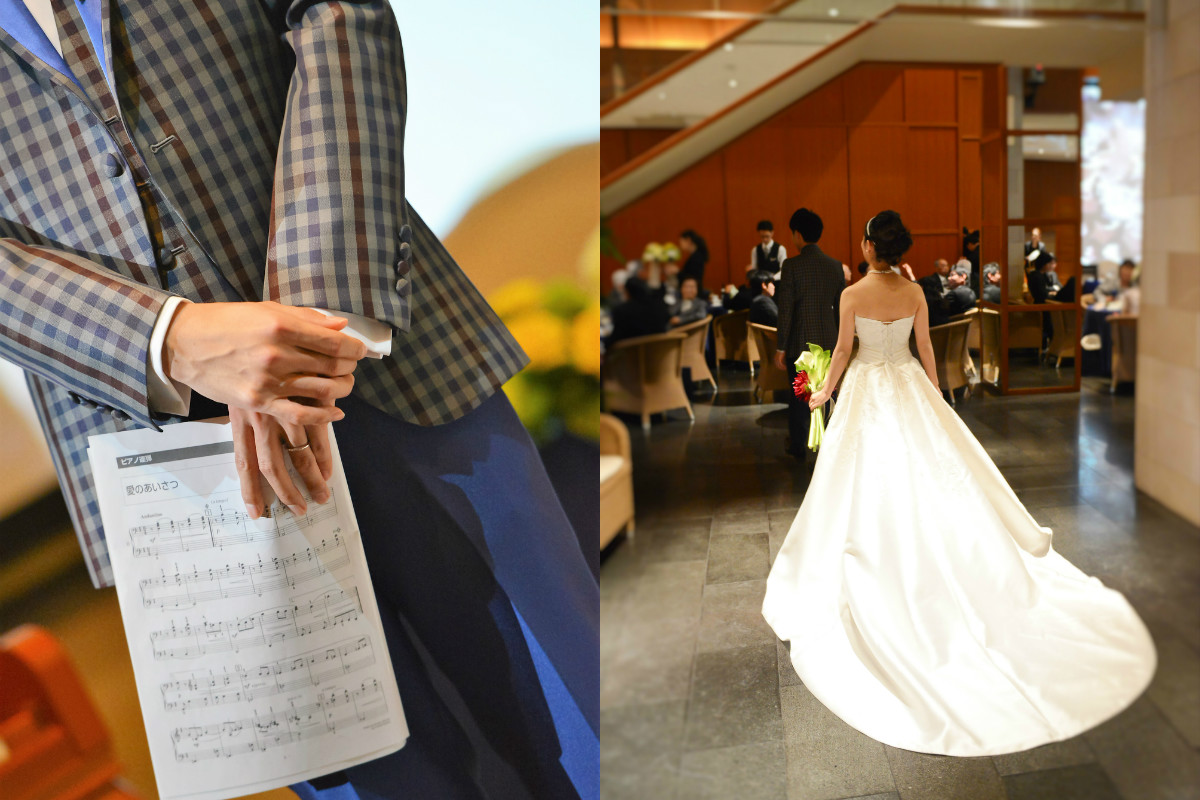 ありきたりな感じにはしたくなかったです。いつか親戚で集まった際の「面白い式だった、よく覚えているよ」という会話を期待しながら(笑)演出を考えました。まずは挙式。チャペルの人前式を、和装で行いました。チャペルで和装!?という感じですが、問題ありません。装花の力は凄いもので、チャペルを和モダンな空間に変身させることができるのです。そんな中で、自分たちで考えた誓いのことばを読みました。水合わせの儀も、「光る器」を使いました。水を入れると光り輝きます。式場を暗転して、水を入れたのが一目瞭然!というような演出をしました。神社は暗転しないですからね(笑)。目でも楽しんでほしいという思いからです。そして、披露宴ではケーキではなく鯛に入刀したり、共通の趣味であるピアノ演奏をしたり、父の故郷のお酒やジュースをメニューに加えていただいたり、ゲスト参加型の鏡開きを行ったり…自由にやらせていただきました!