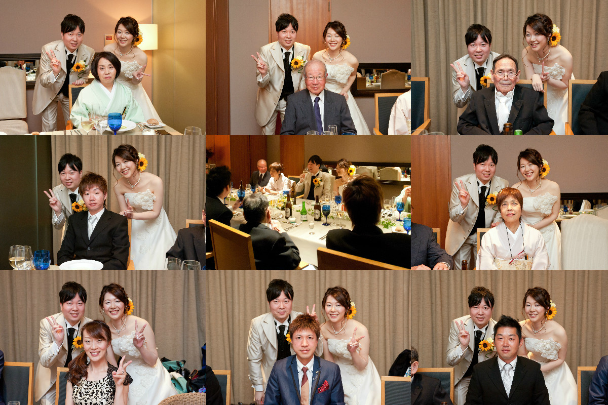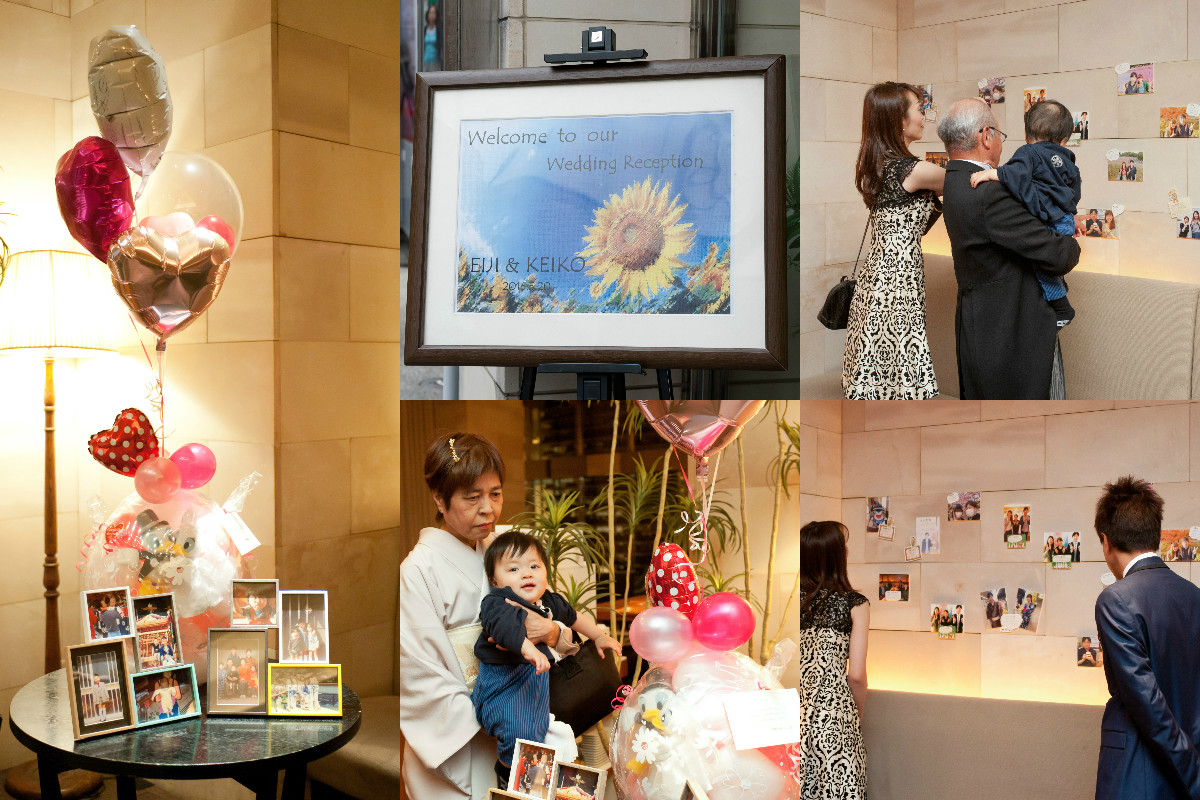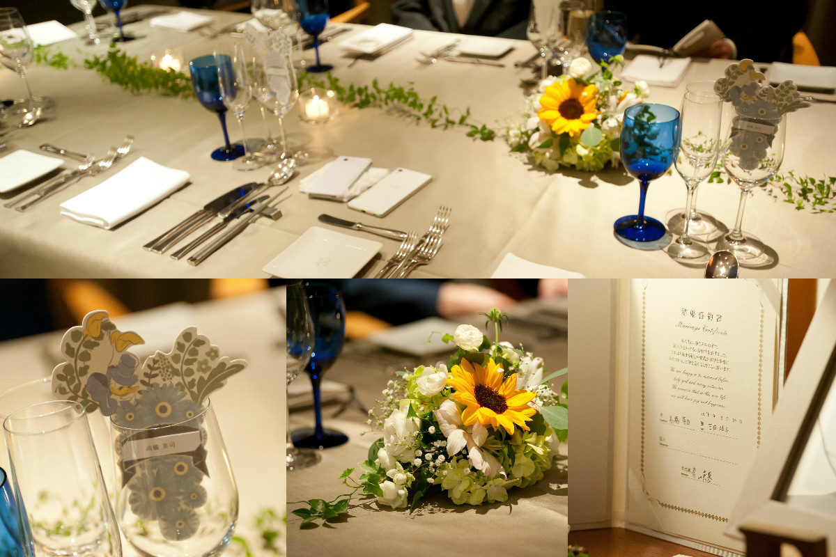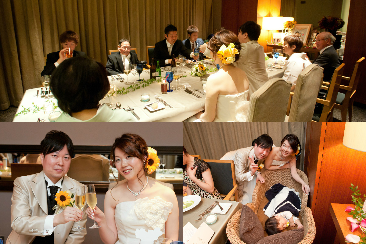 挙式+会食のプランだったので、披露宴や余興はやっていませんが、家族だけだったので、お互いの家族写真、二人の幼少期の写真、付き合っている時の思い出の写真、挙式をするにあたってお世話になった方々(プランナーさん、ドレスショップ、エステ関係)に事前に一緒に写真を撮らせていただき、写真をフォトスタンドに入れたり、パネルにして飾らせていただきました。私(新婦)が夏生まれでひまわりを使いたかったのもあり、小さめのひまわりをブーケに入れてほしいとお願いをしていましたが、季節的に入荷するか微妙なところと打ち合わせで言っていたのですが、当日ブーケを見て一気にテンションが上がりました!ひまわりも入っていたし、イメージ通りのブーケとブートニアでした♡