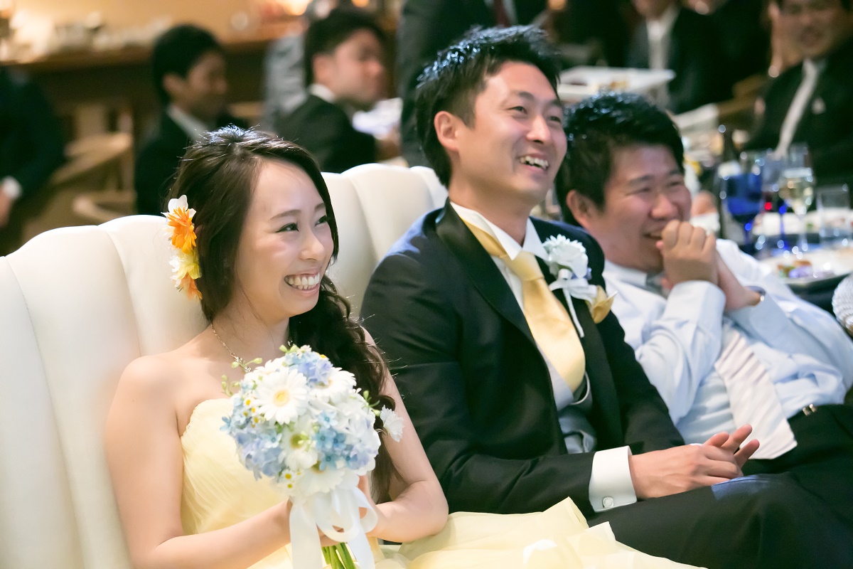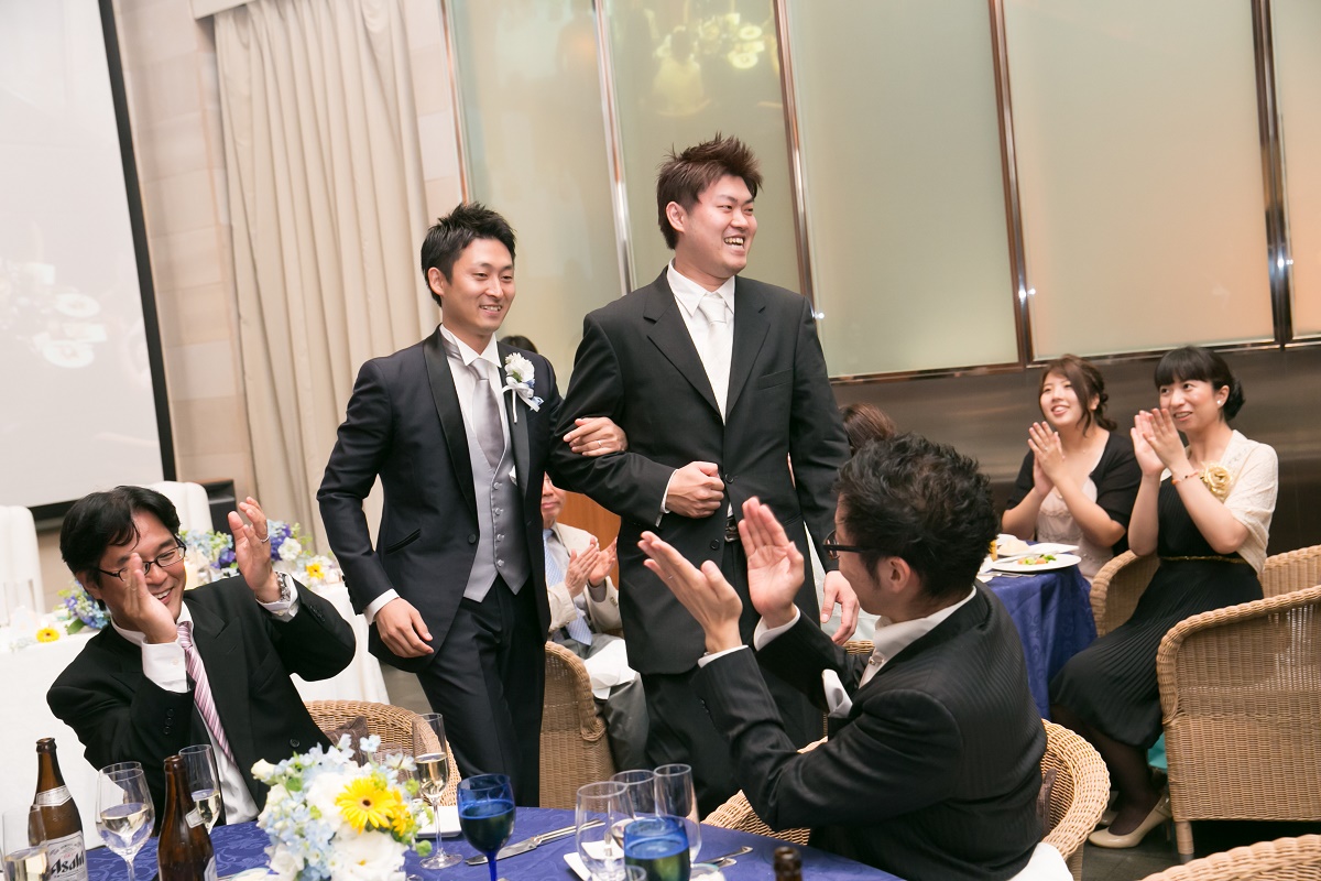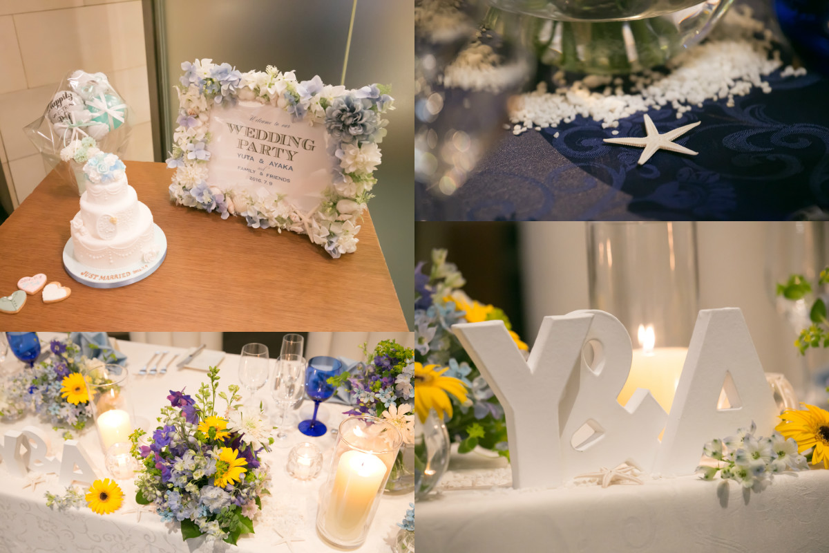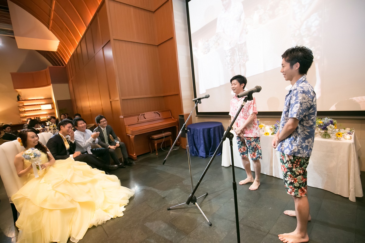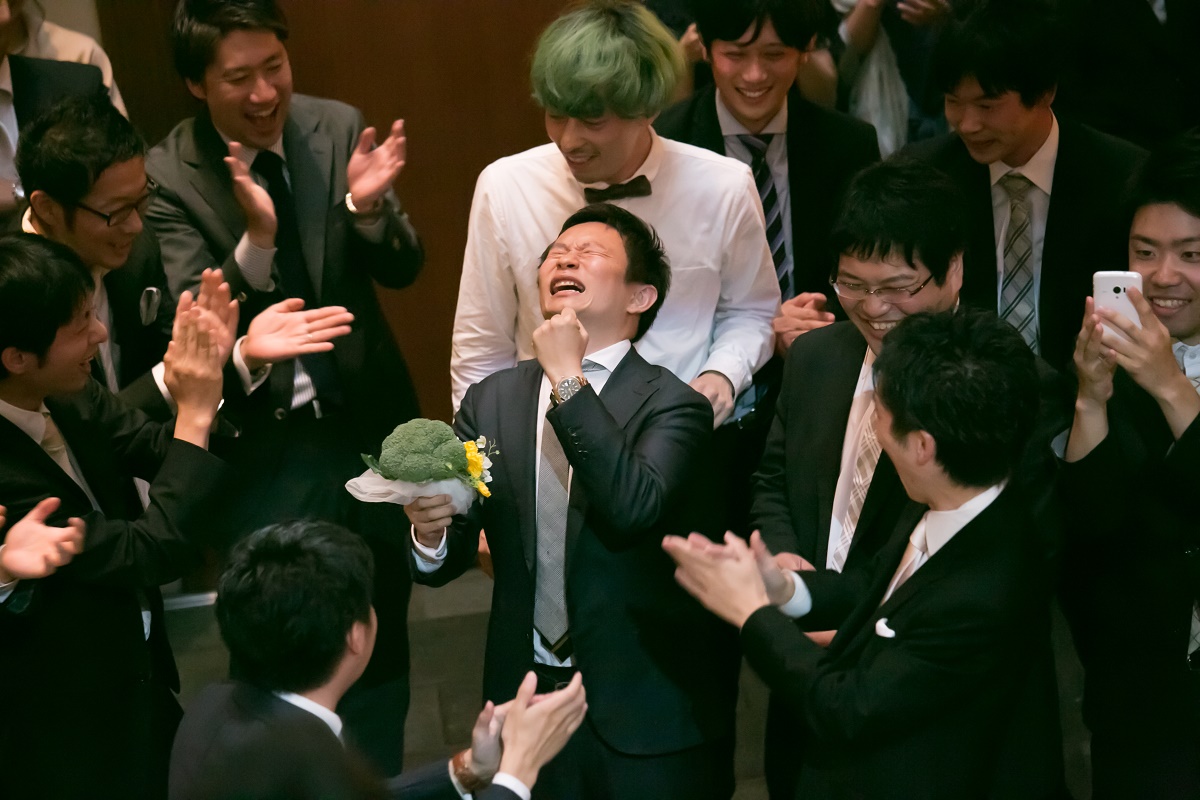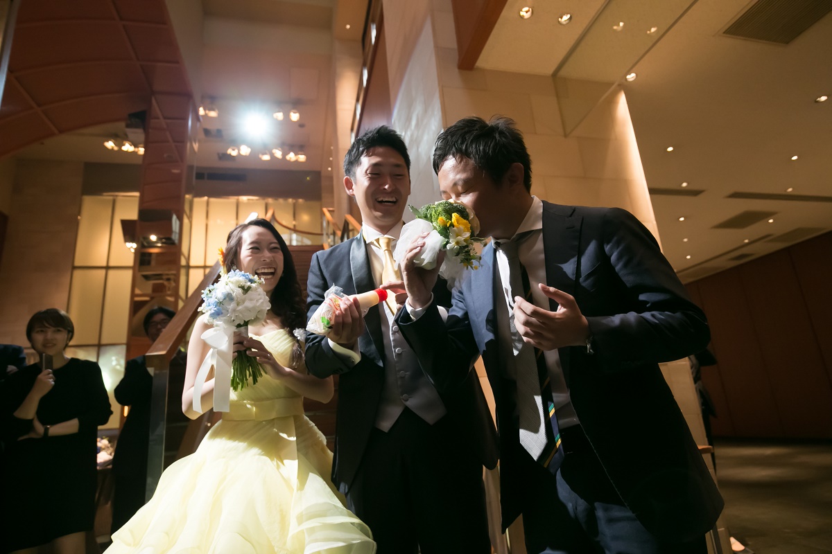 共通の友人も多く、「二人の披露宴」というより、「友人たちと楽しめる明るい披露宴」にしたいと考えていました。そこで、まずウェルカムスペースは友人たちの手作りのものでいっぱいにしてもらいました。演出としては、「ブロッコリートス」を行いました。ゲストの中にパートナーのいない女性陣は少ないというのと、独身男性陣でわいわい盛り上がりたい!と思い行いました。本番は、予想以上に盛り上がり楽しい演出になったと思います。