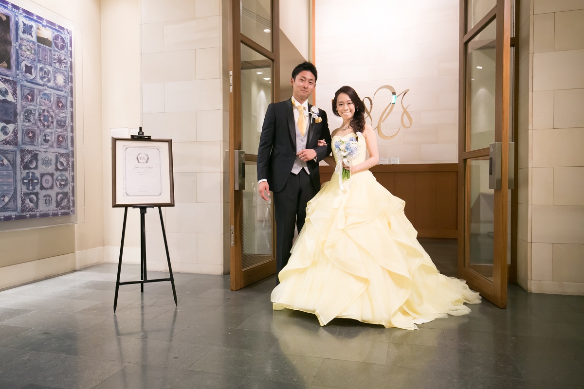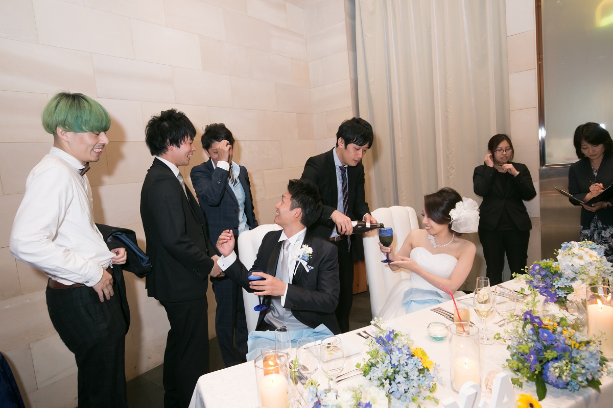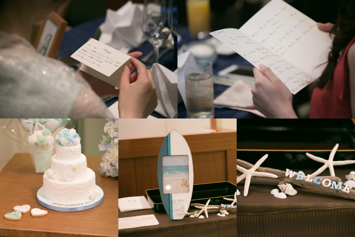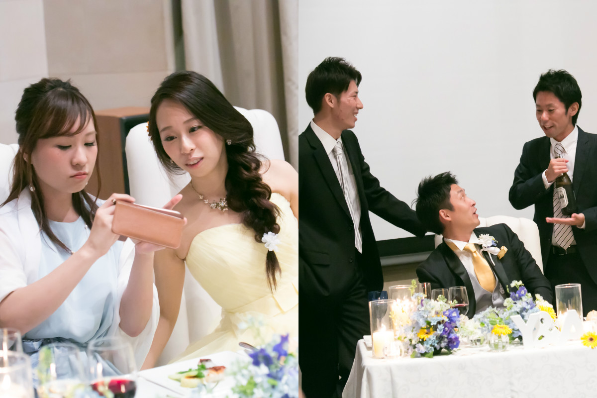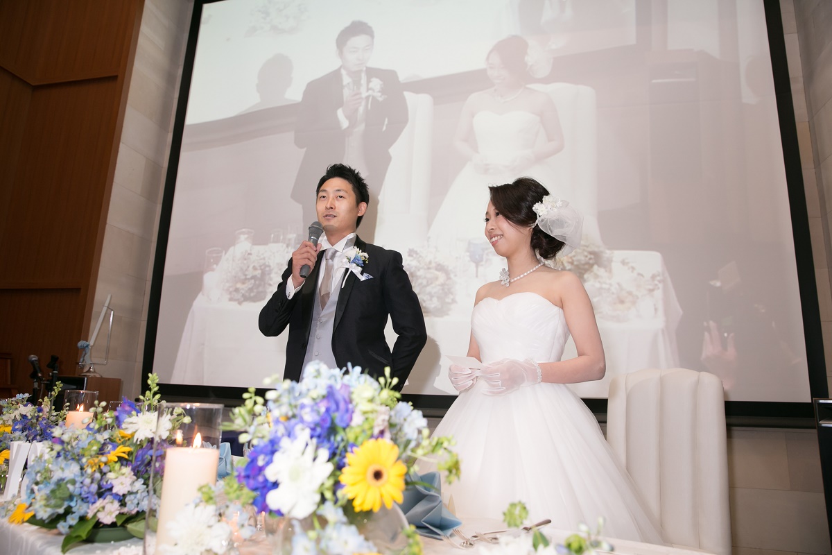 共通の友人も多く、「二人の披露宴」というより、「友人たちと楽しめる明るい披露宴」にしたいと考えていました。そこで、まずウェルカムスペースは友人たちの手作りのものでいっぱいにしてもらいました。演出としては、「ブロッコリートス」を行いました。ゲストの中にパートナーのいない女性陣は少ないというのと、独身男性陣でわいわい盛り上がりたい!と思い行いました。本番は、予想以上に盛り上がり楽しい演出になったと思います。