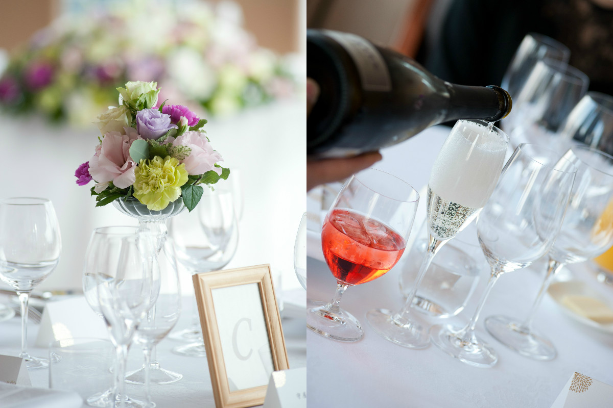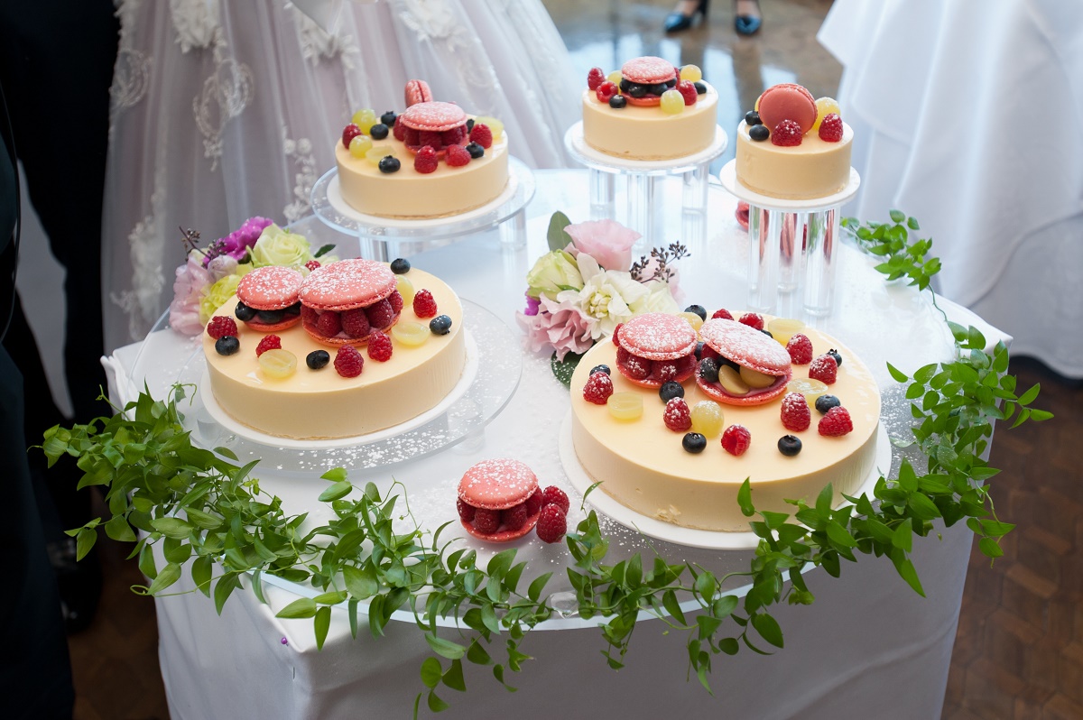 美味しく、彩りも美しいお料理で、ゲストの方にも好評でした。特にメインのお肉料理がとろけるほどに柔らかかく美味しかったです。また、前菜に玉ねぎを使ったお料理が出たのですが、とても甘く、玉ねぎが苦手なゲストにも、美味しく召し上がっていただけたそうです。また、ウェディングケーキはマカロンをあしらったベリー系のムースケーキで、見た目にも可愛らしく、非常に美味しかったです。食器類も繊細な花柄で、一枚一枚職人さんが手書きをされているとのことです。