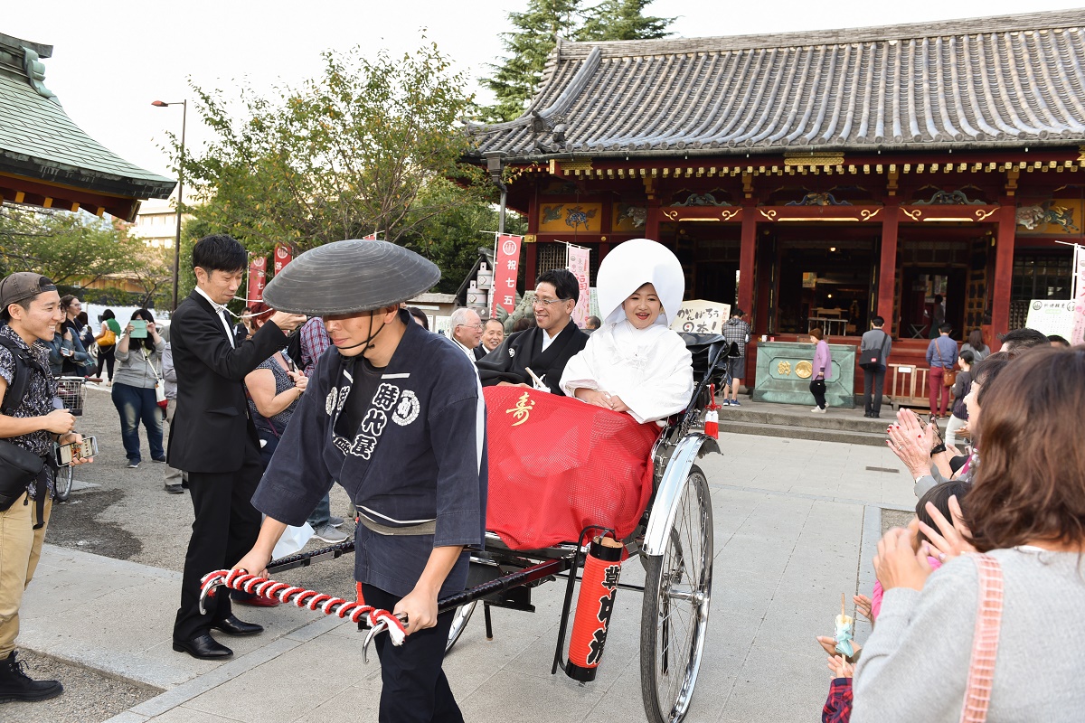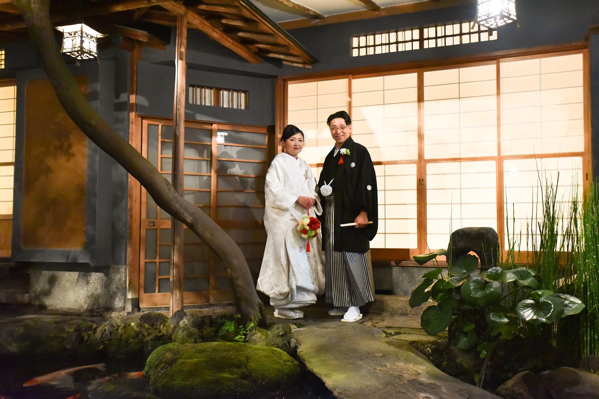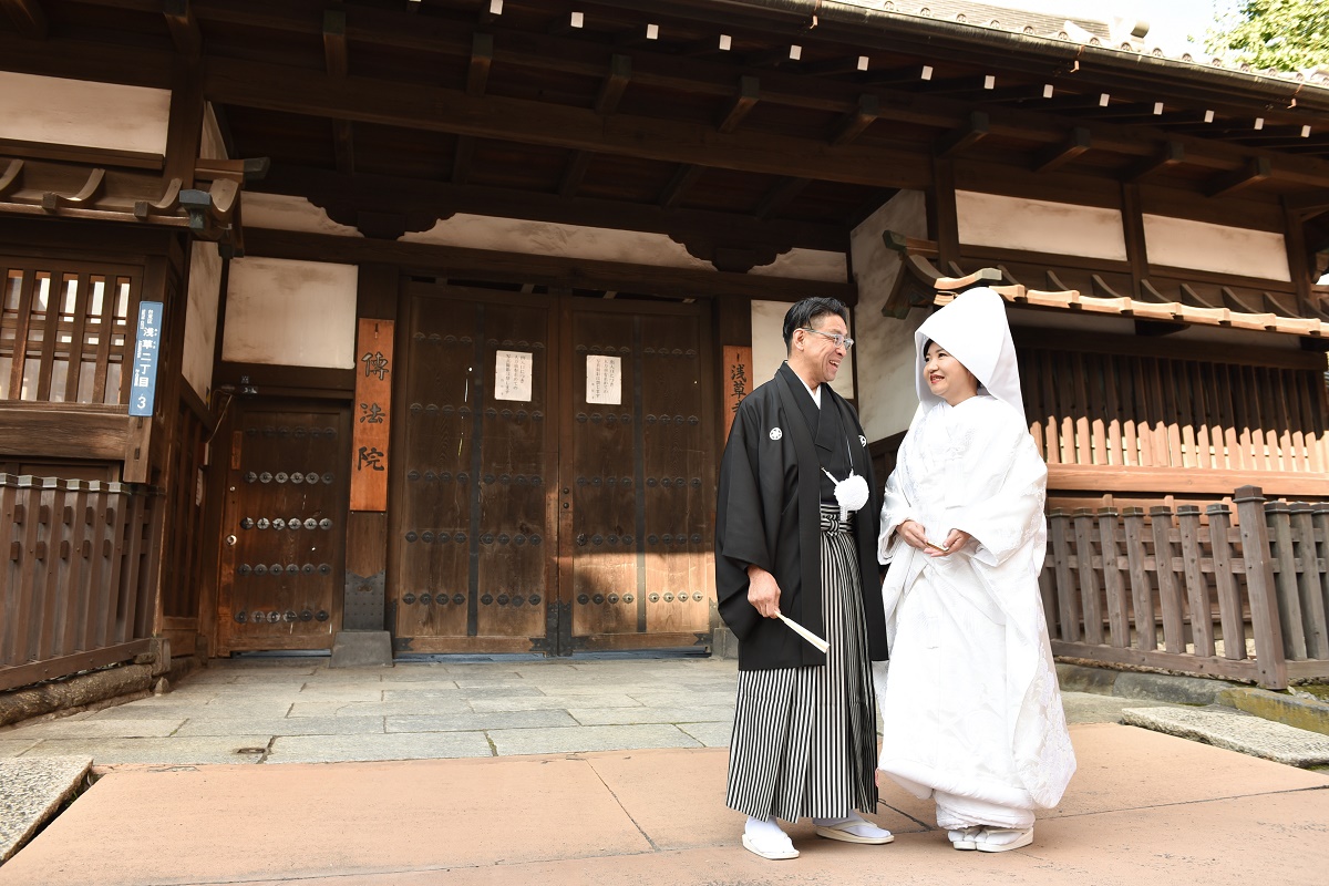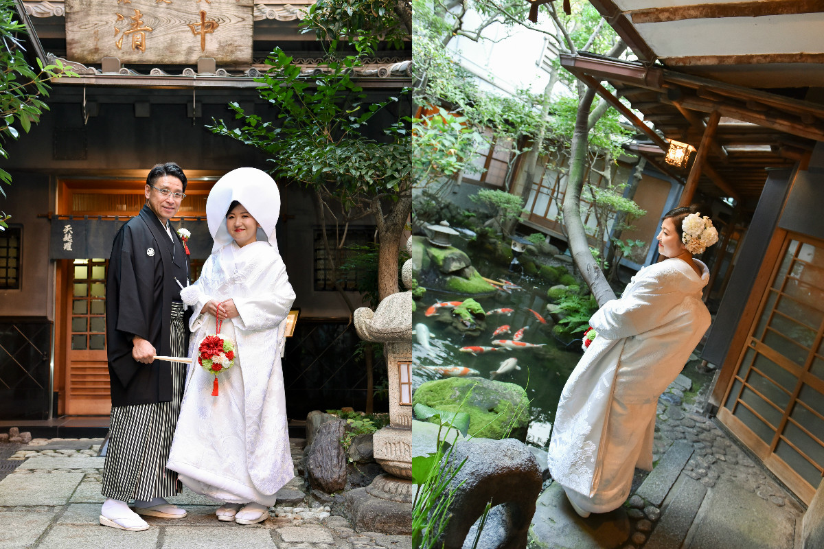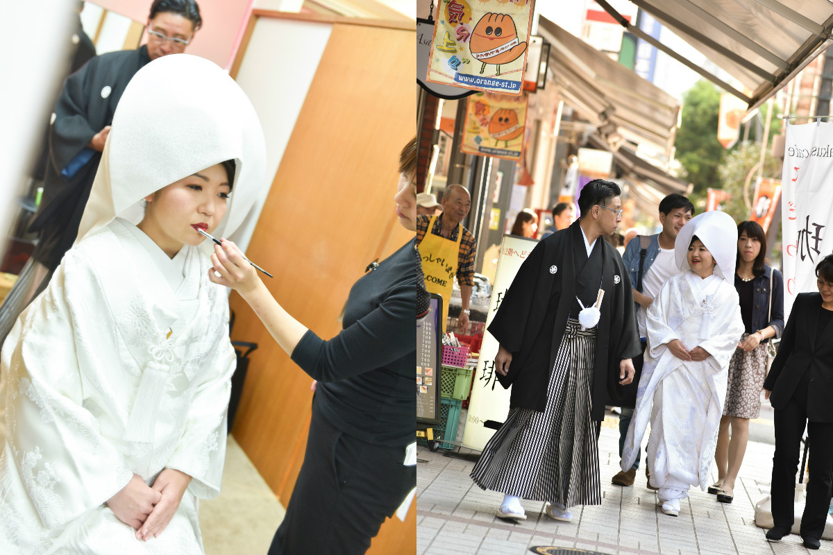 お店の入り口や中庭で、白無垢姿でお写真もたくさん撮らせていただき、より浅草の雰囲気を含んだアルバムができると思います。