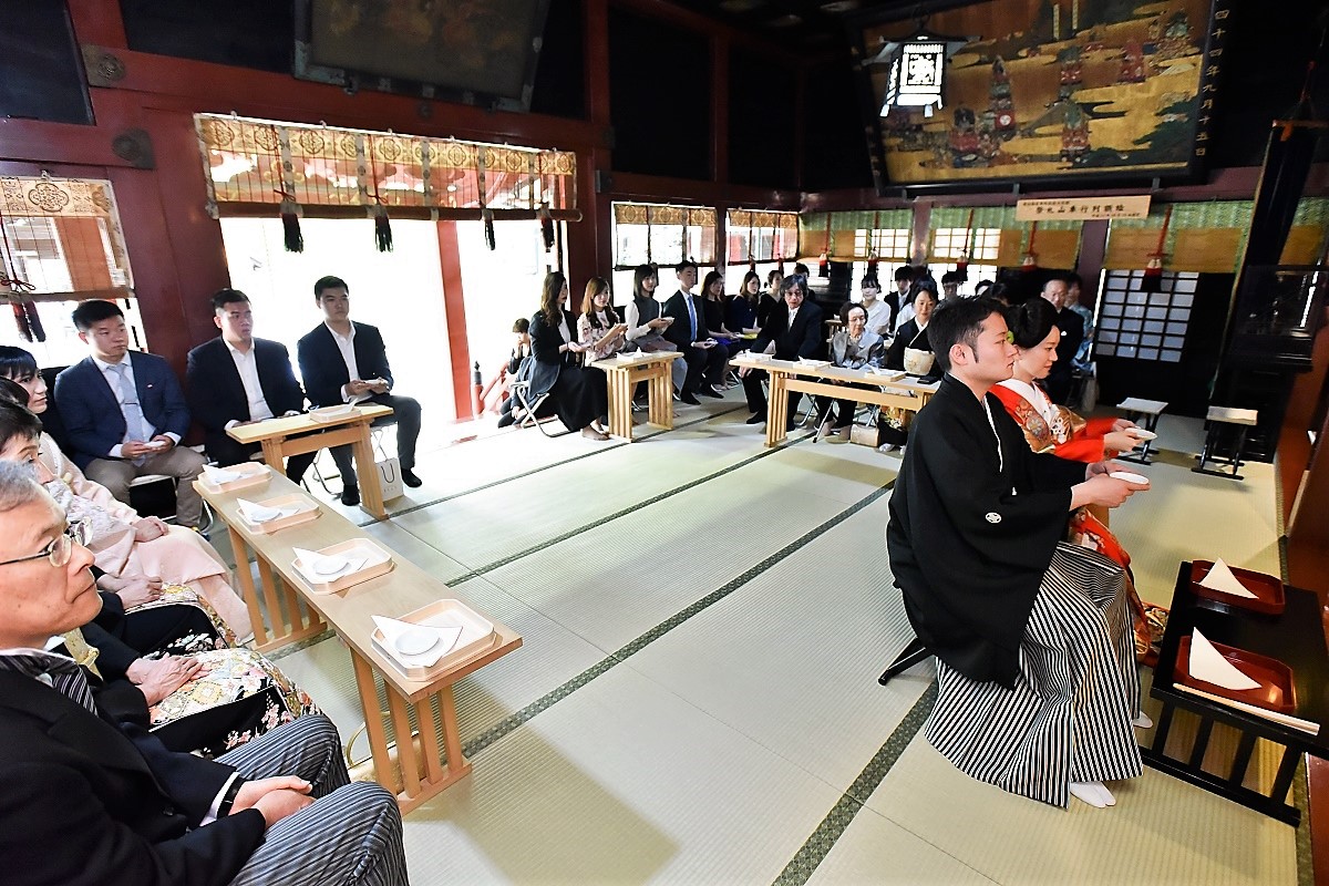 1つ目は雰囲気がスタイリッシュなところです。一般的な式場とは異なり内装がモダンかつ上品で憧れました。また、テーブルやイスもバックにある紅の壁画ととてもマッチしていて、当時想定していた衣装(紅色打掛&紋服、ウェディングドレス&白タキシード)の綺麗さもより引き立つと想像がつきました。