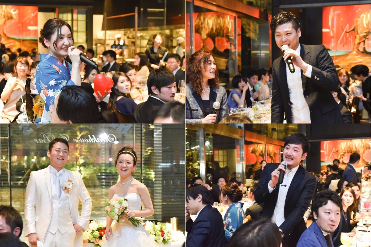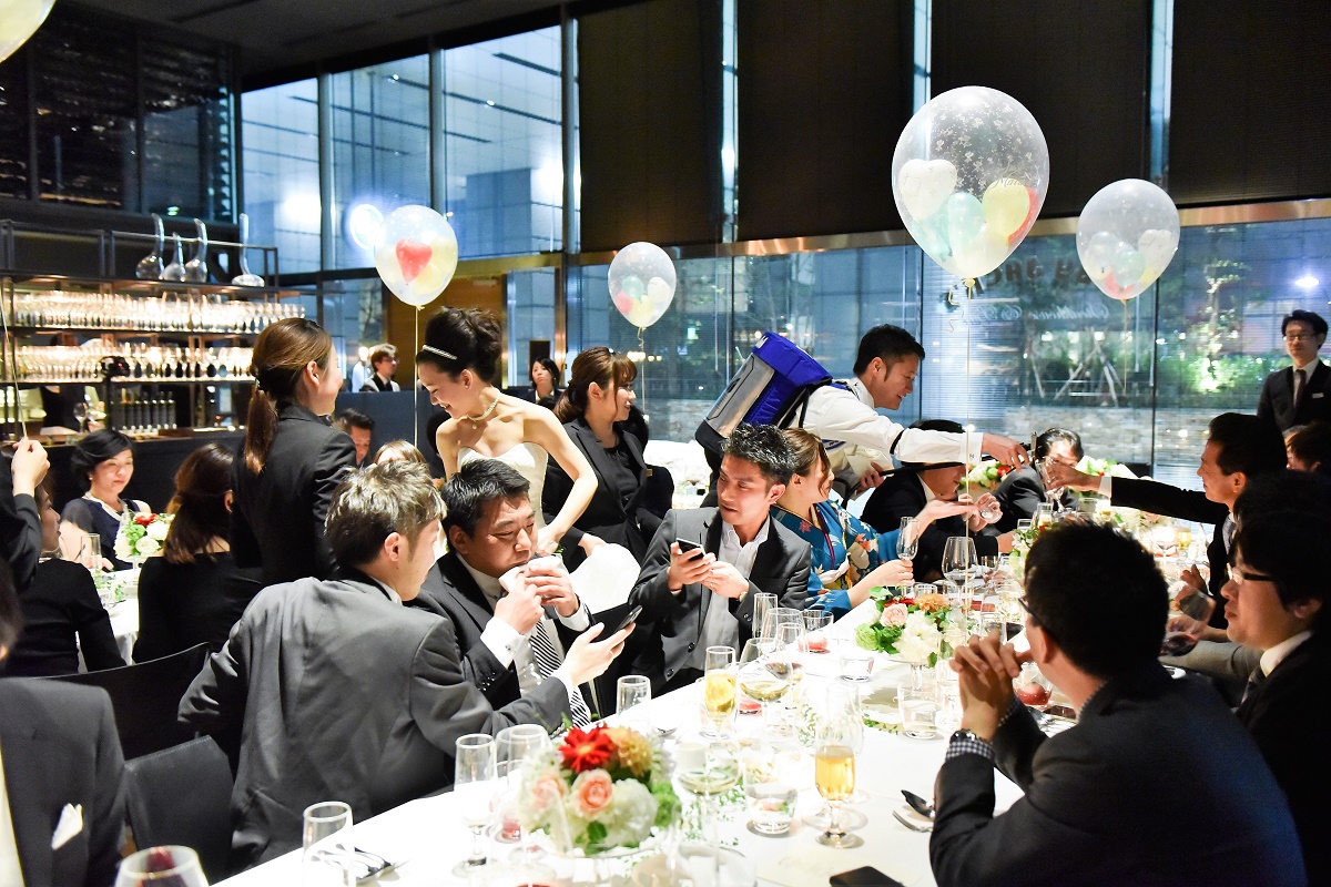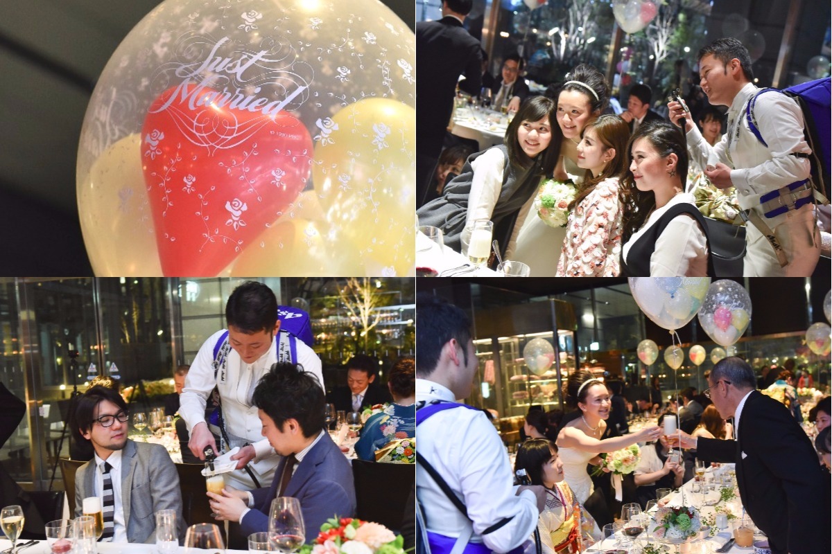とにかく最初から最後まで全員参加型で楽しい雰囲気にしたい!視覚的に誰でも楽しめる演出にしたい!という気持ちが強かったです。外国から参加するゲスト(日本語がわからない方々)が多かったため、司会は日英Bilingualの方にお願いし適宜通訳を通してゲストみんなに状況が伝わるようにしました。ケーキカットではBGMにMaroon 5の「Sugar」を採用、踊り出すゲストも現れ、とても盛り上がりました(これはやはり鉄板!!)また海外から参加してくれた友人カップルにサプライズでサンクスバイトを仕掛けました。ビアサーバを担いで行なったテーブルラウンド、全員タイミングを合わせて行うスパークバルーンではプレゼントの他にドッキリスピーチを仕掛けるなど、国籍、年齢、性別関係なく全員が楽しめるプログラムを選びました。結果、ゲストのみなさまも終始笑顔だったので大成功でした!