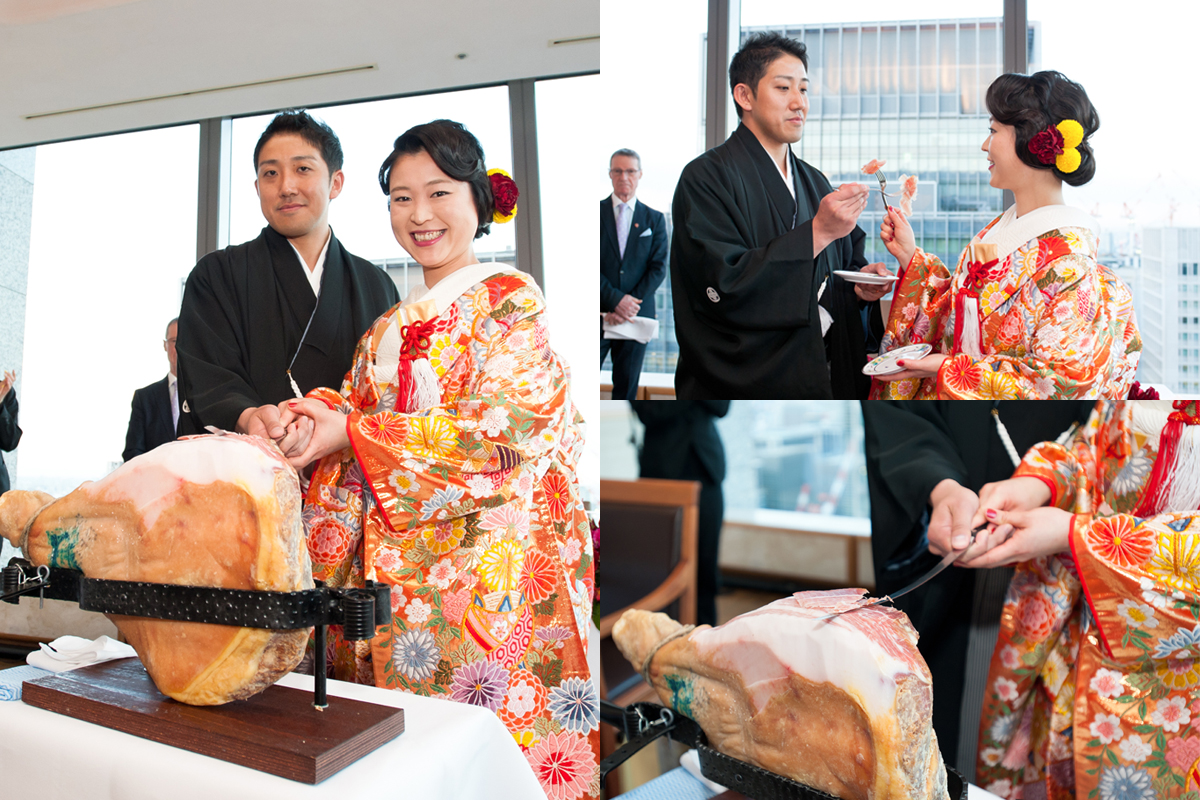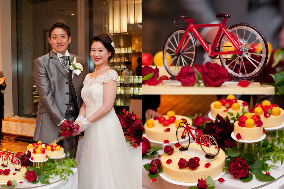 あまり派手なことは好まず、ゲストの人数も多くないためクオリティーにこだわり、来ていただいた一人一人に満足していただけるように心がけました。イタリアンクラシカルのイメージを想像しており会場のイメージに合った花選びをしました。落ち着いた赤を基調とし、よりクラシカルになるようアンティーク調の花瓶を使用しました。もともとかわいらしい食器や、大きく座りやすい椅子、イタリアにいるように思わせくれる内装があったのでお花だけで十分な演出ができたと思います。ただ余興に関しは、食いしん坊な私たちのイメージにぴったりであり、同じく美味しものが大好きなゲストも大勢いたため生ハムカットでゲストに喜んでもらいたいと思い選びました。