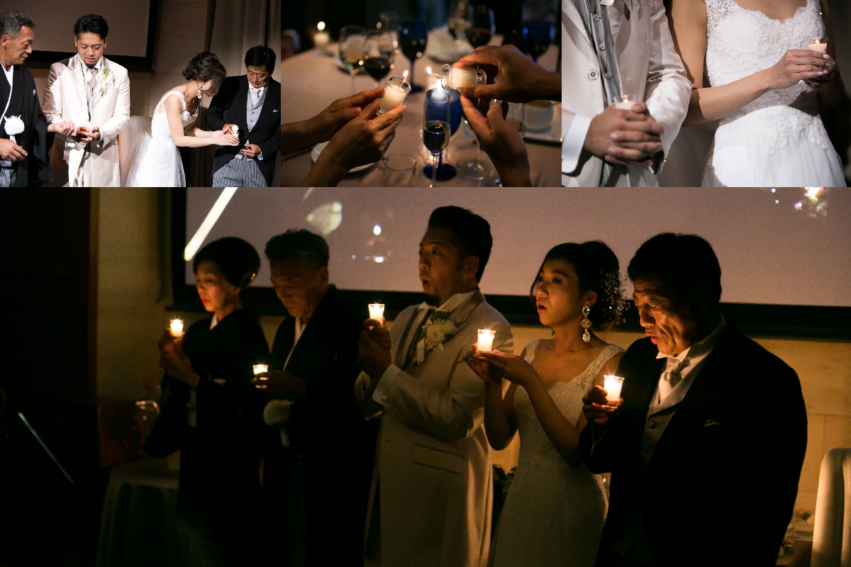 落語家さんの司会は父のこだわりですがよかったです。テーブル装花やクロス、席札とメニュー表をラリアンスさんの素敵な空間に合わせナイトウウェディングという時間帯を考えキャンドルを多く取り入れたり、ゲストが時間、空間、食事、雰囲気に違和感なく楽しめるようお花担当の方に相談しました。雰囲気やワインの格付けなど洋風な内容でしたがゲストの年齢層が高かったため、落語家さんの司会やエントランスの和装写真にあわせ引き出物と引菓子や縁起物など和風のものを取り入れました。