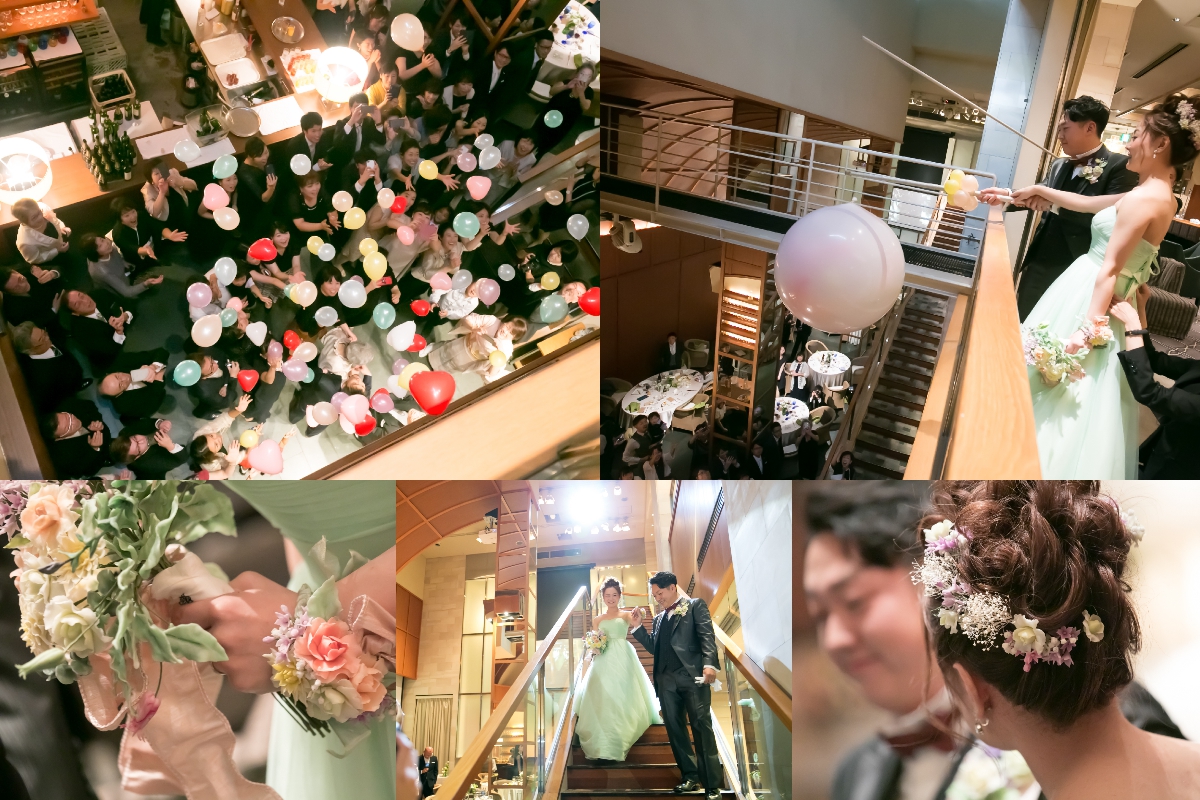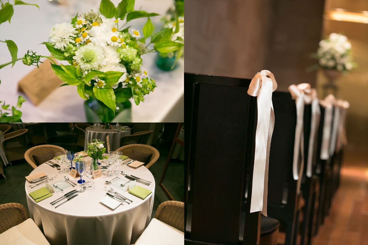 こだわりのポイントは、自分たちらしい手作り感のあるアットホームなアイテムを盛り込むことが出来ました。席次表やプチギフト、ブーケ・ブートニア、招待状何か何まで、自分たちで作ることができました。中でも、フラワーシャワーをリボンで作り、リボンシャワーにしました。リボンシャーはとは、縁を結ぶという意味があり、こだわって作りました。当日は、挙式でリボンが舞うと、とても鮮やかで、白いウエディングドレスに、いくつもの色のリボンが付き、とても印象的な演出になりました。