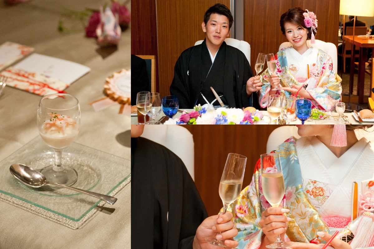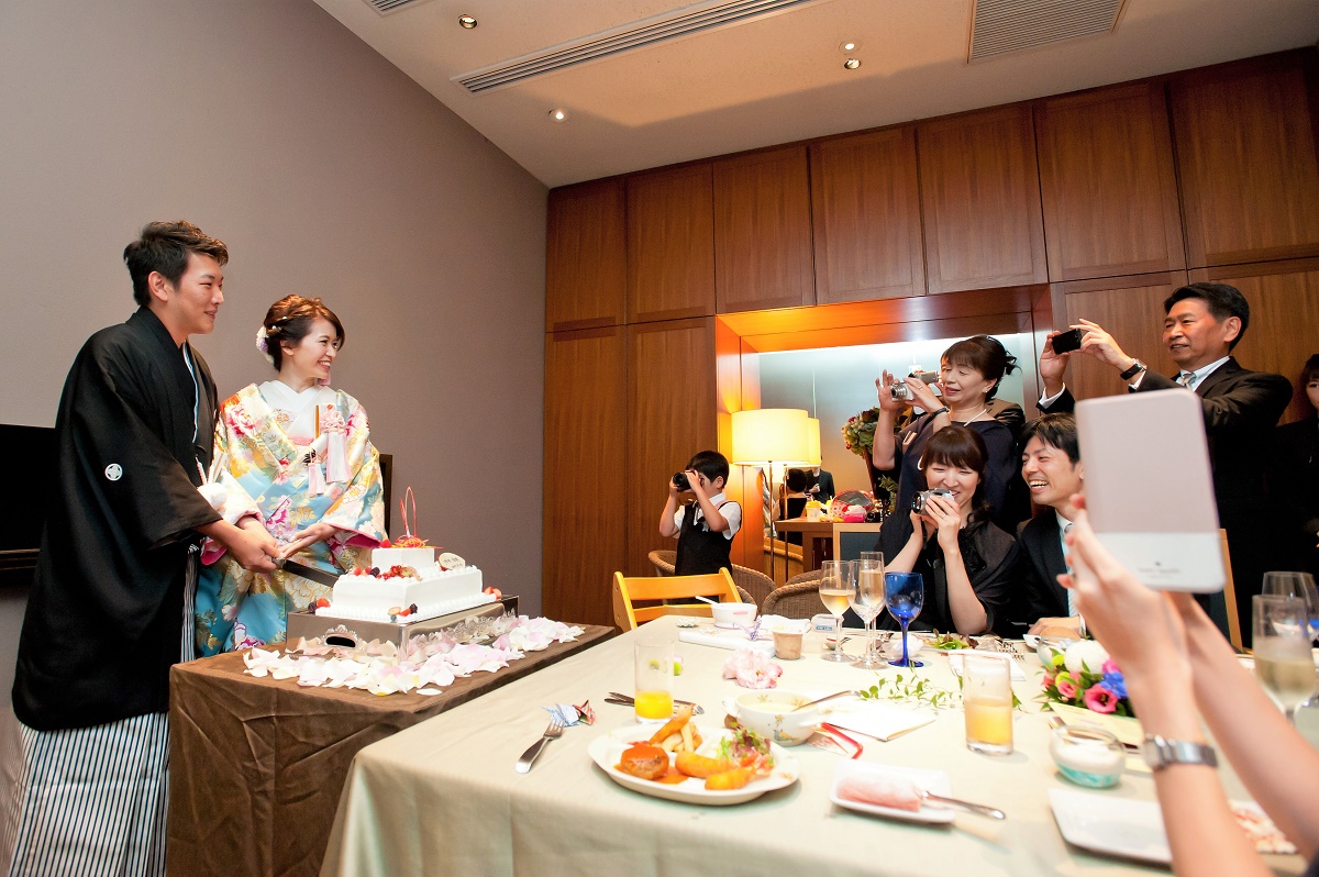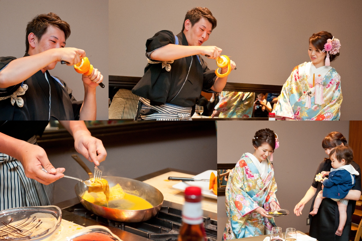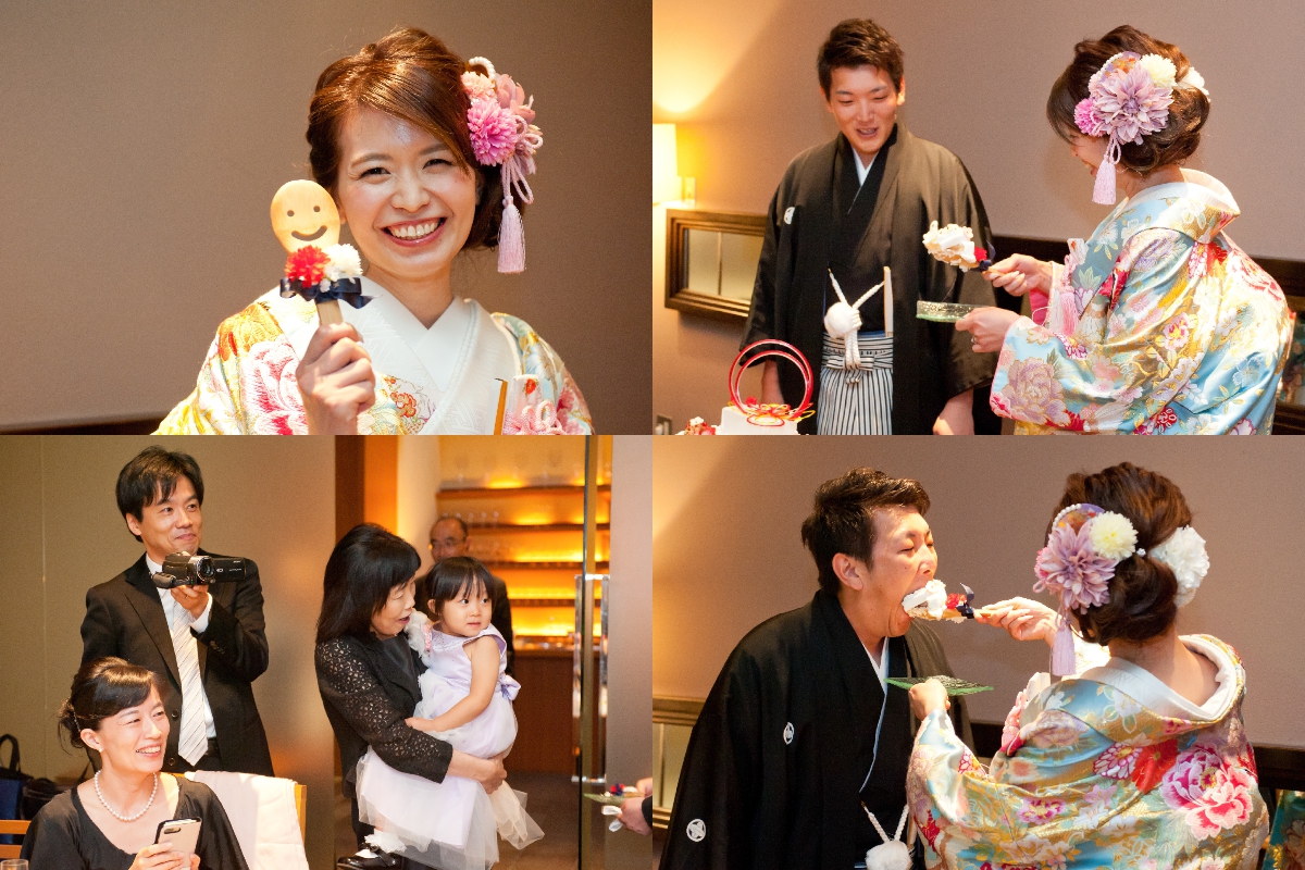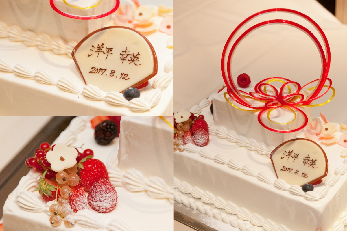 少人数での披露宴でしたが、ケーキ入刀、プロフィールムービーの上映なども行いました。ウエディングケーキ入刀はやりたかったことのうちの一つだったので、プランナーの林田さんにケーキのイメージを伝え、和婚がテーマだったので、飴細工を使って水引を作っていただくことになりました。わたしのつたないイメージを一生懸命形にしてくださり、本当にありがとうございました!おかげで素敵なケーキでファーストバイトができました☆また、新郎にはクレープシュゼットの演出をしてもらい、甘いもの好きの女性陣にはすごく喜んでもらいました。普段料理をしない新郎の姿をみているのはわたし自身とても楽しかったです。また、ブライダルフェアのときにいただいた、ラリアンスのショコラがおいしく、どうしても忘れられなかったため、コーヒーと一緒に追加で出していただいたことも満足しています。本当にありがとうございました!