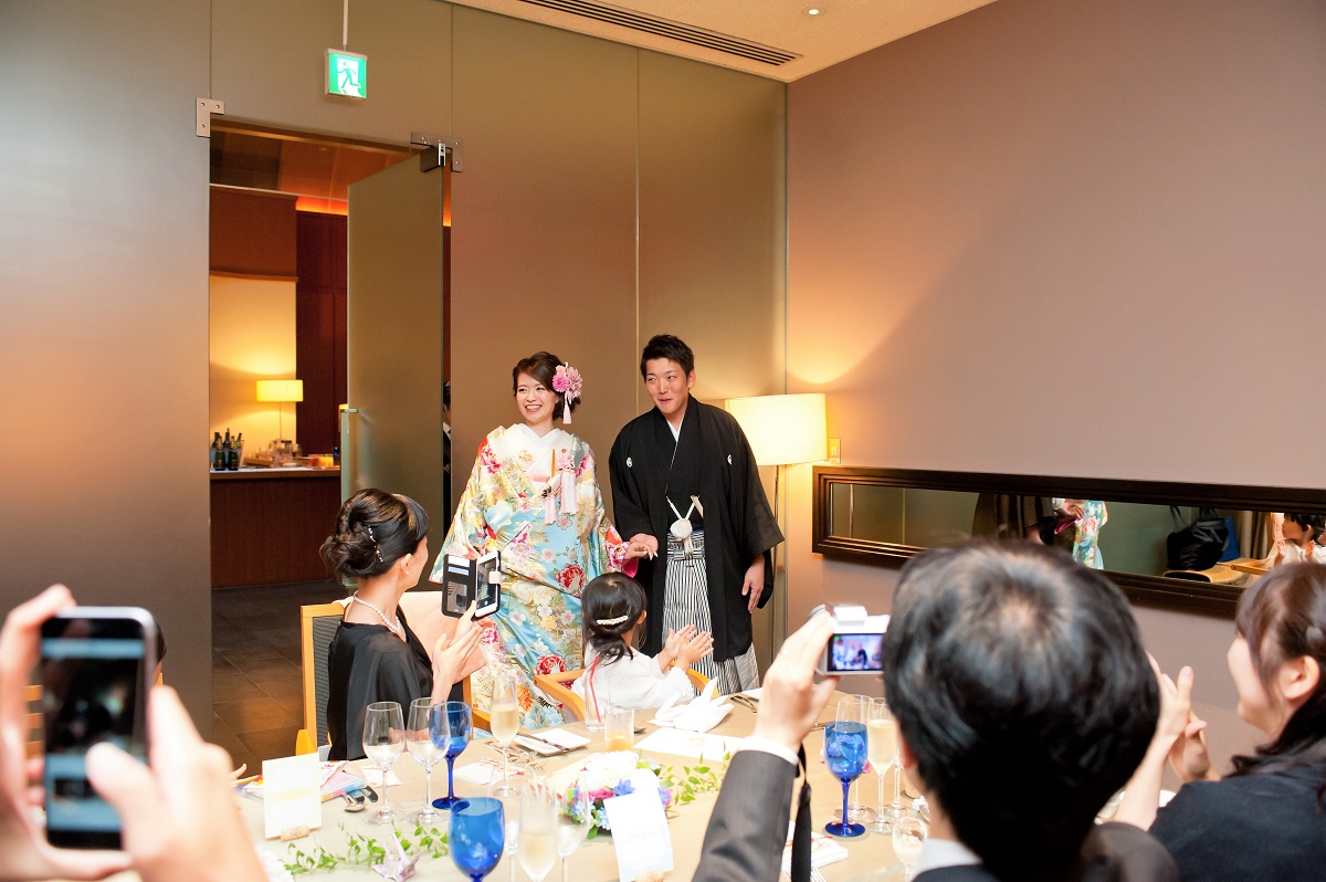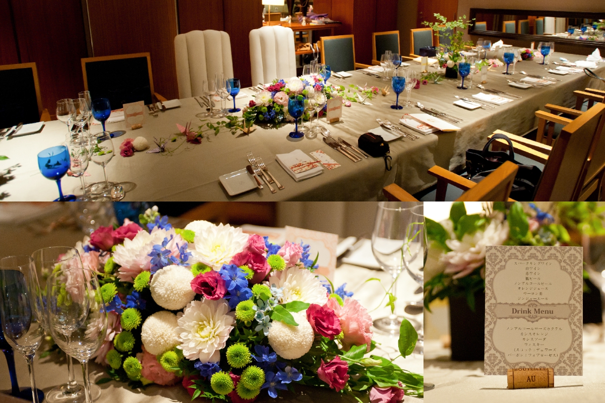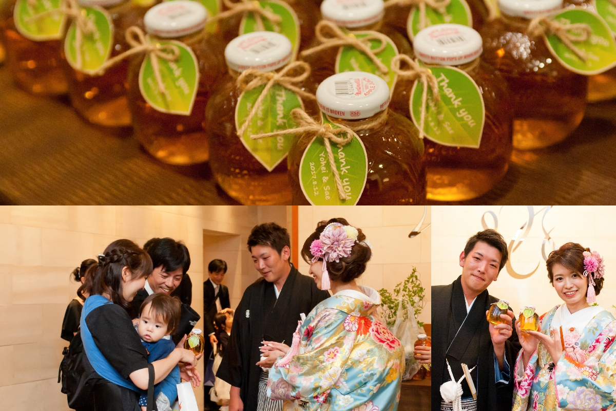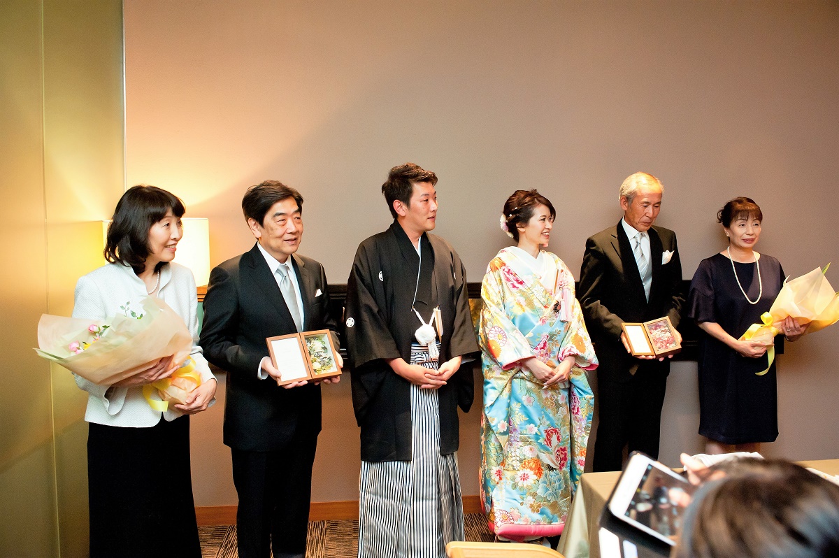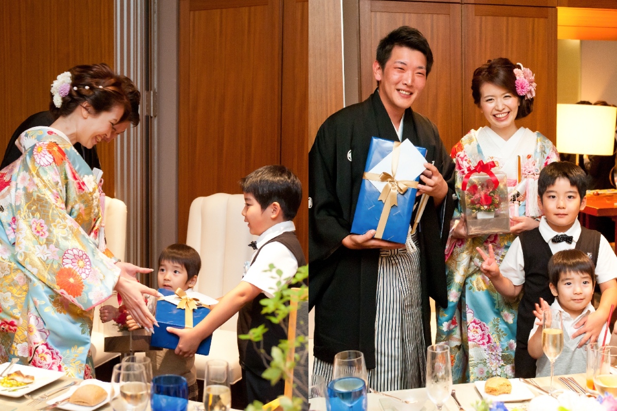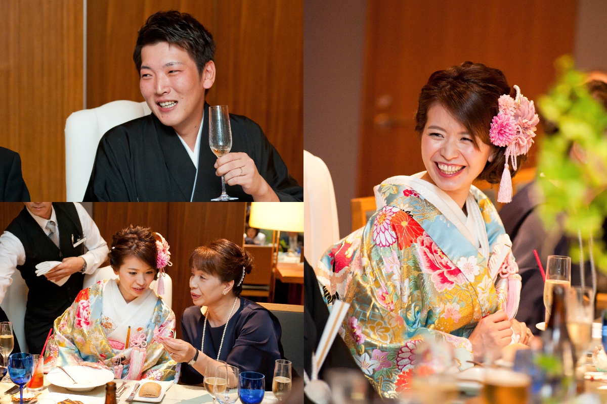 少人数での披露宴でしたが、ケーキ入刀、プロフィールムービーの上映なども行いました。ウエディングケーキ入刀はやりたかったことのうちの一つだったので、プランナーの林田さんにケーキのイメージを伝え、和婚がテーマだったので、飴細工を使って水引を作っていただくことになりました。わたしのつたないイメージを一生懸命形にしてくださり、本当にありがとうございました!おかげで素敵なケーキでファーストバイトができました☆また、新郎にはクレープシュゼットの演出をしてもらい、甘いもの好きの女性陣にはすごく喜んでもらいました。普段料理をしない新郎の姿をみているのはわたし自身とても楽しかったです。また、ブライダルフェアのときにいただいた、ラリアンスのショコラがおいしく、どうしても忘れられなかったため、コーヒーと一緒に追加で出していただいたことも満足しています。本当にありがとうございました!