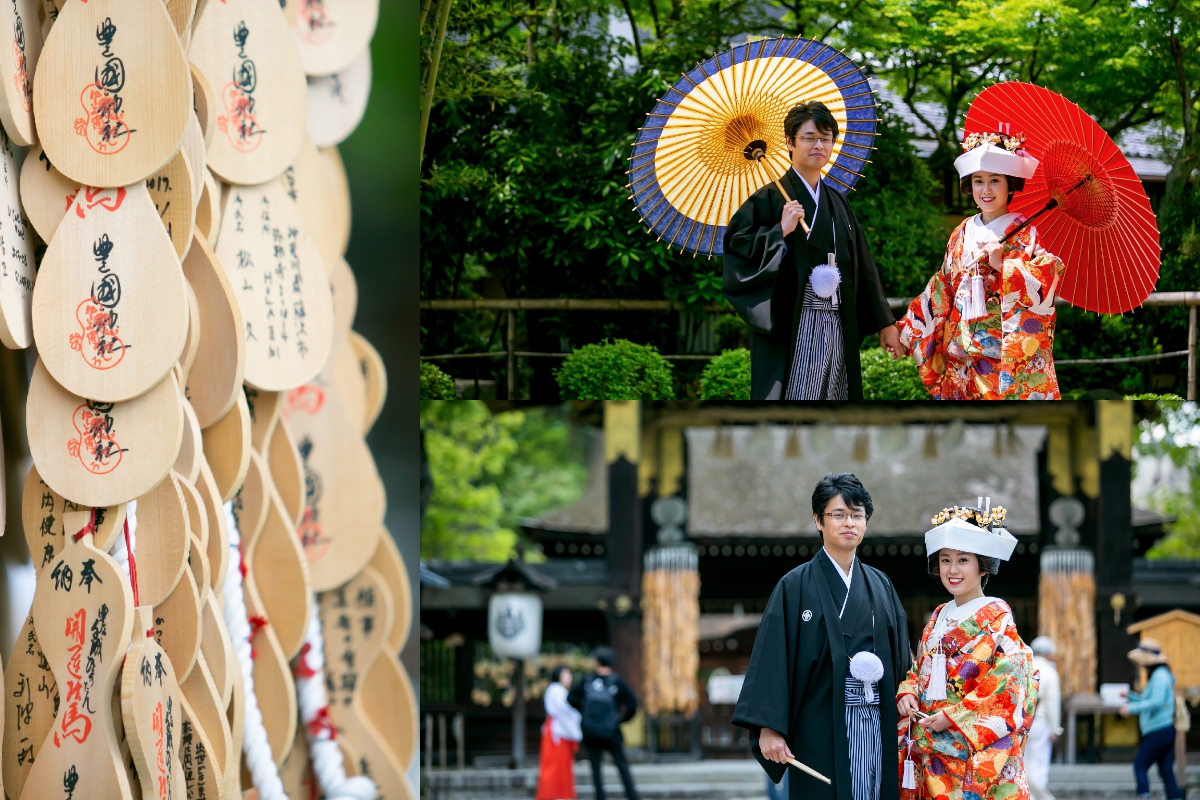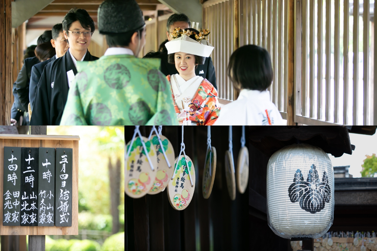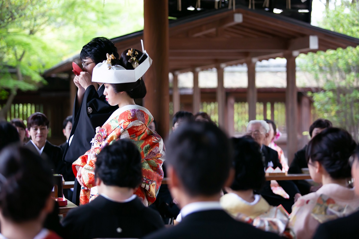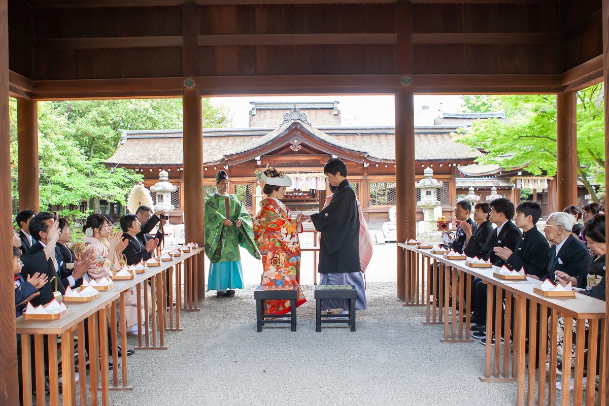 神前式を行った豊国神社は、豊臣秀吉を祀っており、「出世」の神様という事で2人と親族の立身出世を祈念して選びました。また、親族に高齢の者がいたので立地も重視しており、京都駅から近く、交通の便が良いところも決めてになりました。