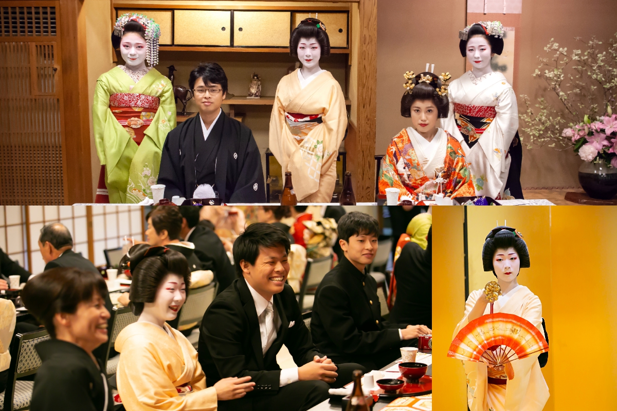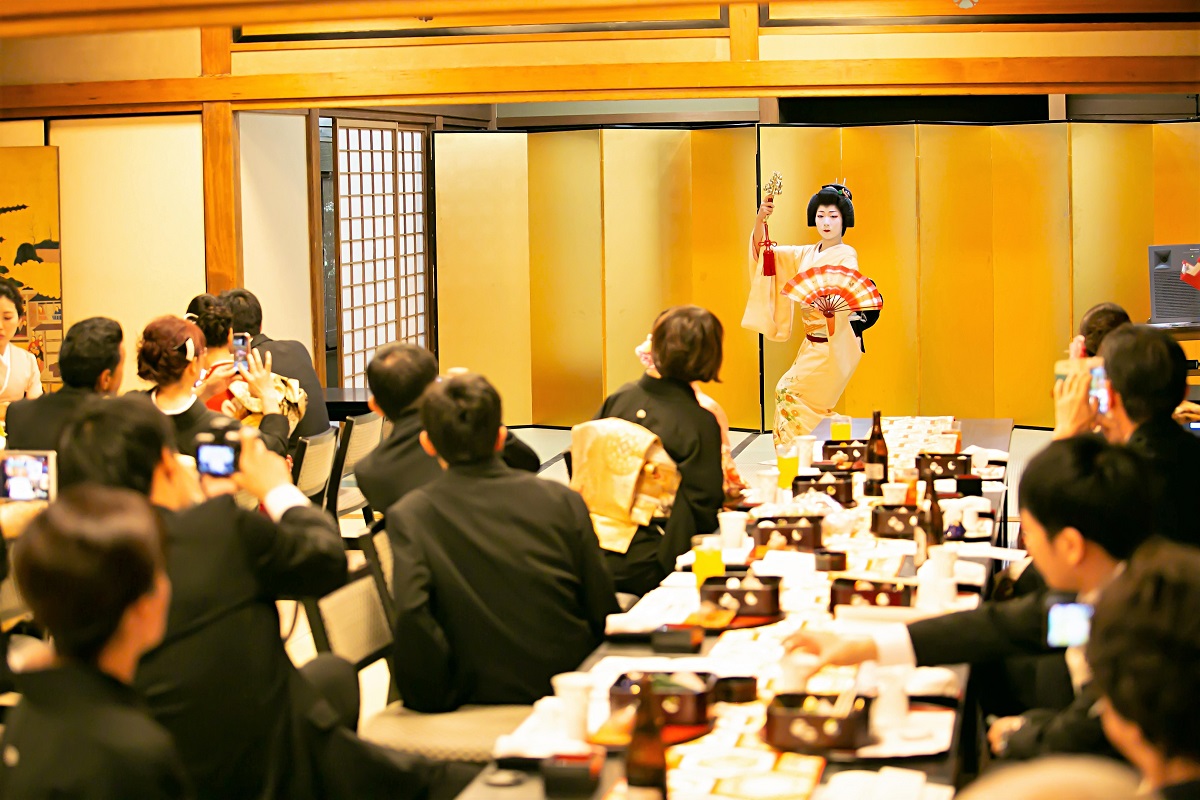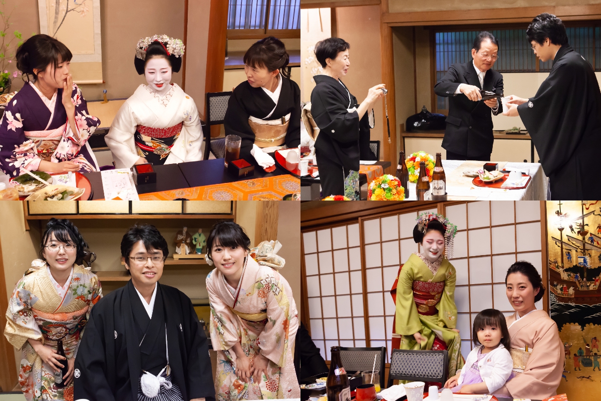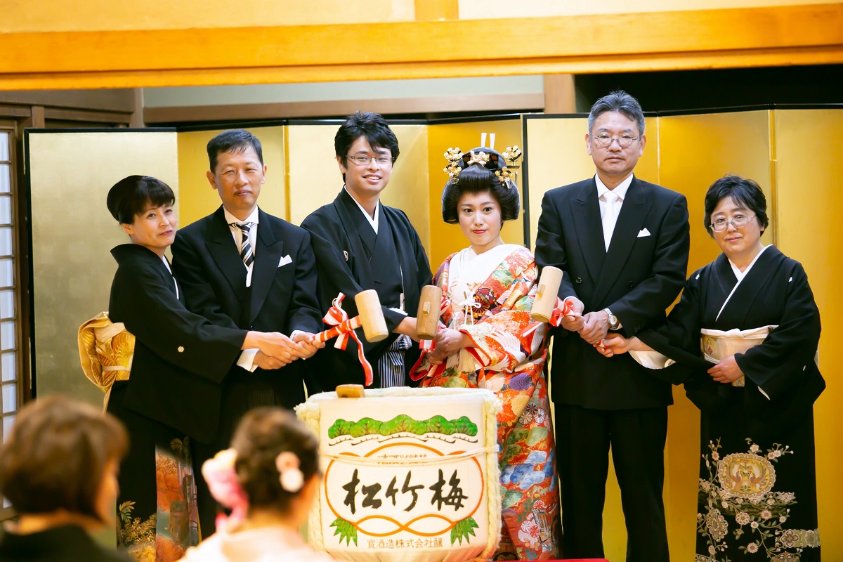 結婚式がゴールデンウィーク中である事から、列席者に楽しんでもらう事を第一に考えました。披露宴のイベントとしては、新郎新婦と双方両親との鏡開きを行った他、芸舞妓さんの舞とお酌、両親に新郎新婦の生まれ年のワインを記念品として渡しました。また、2人の出会いのきっかけが、山仕事サークルであった事から、親しくしている京都の木工作家さんに、京都の杉でフォトフレームを作っていただき、ギフトとして列席者に手渡しました。