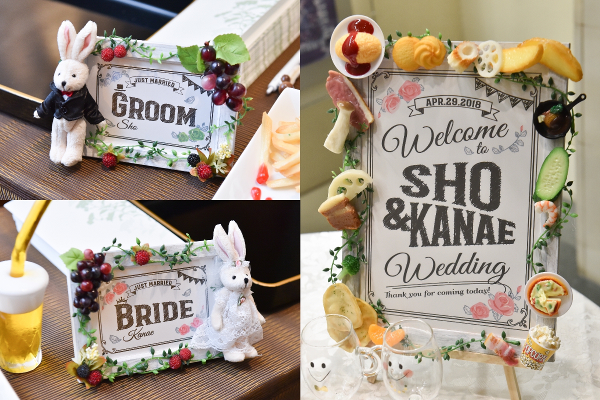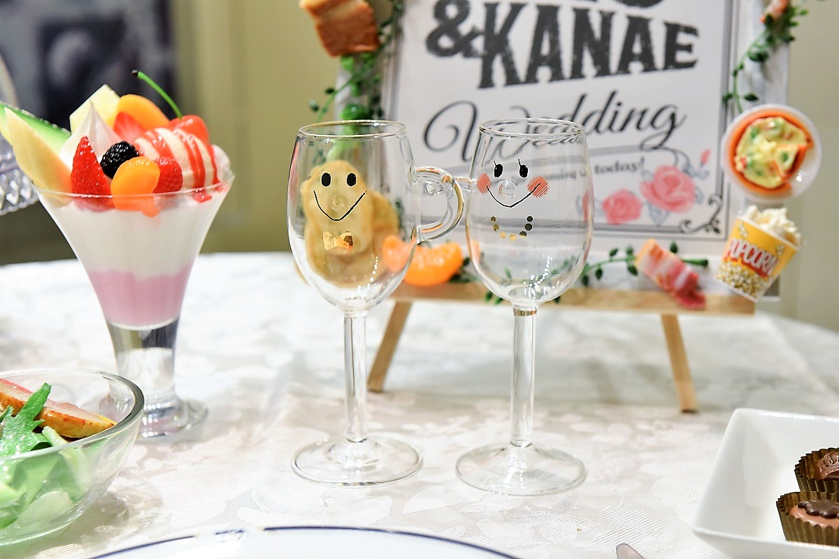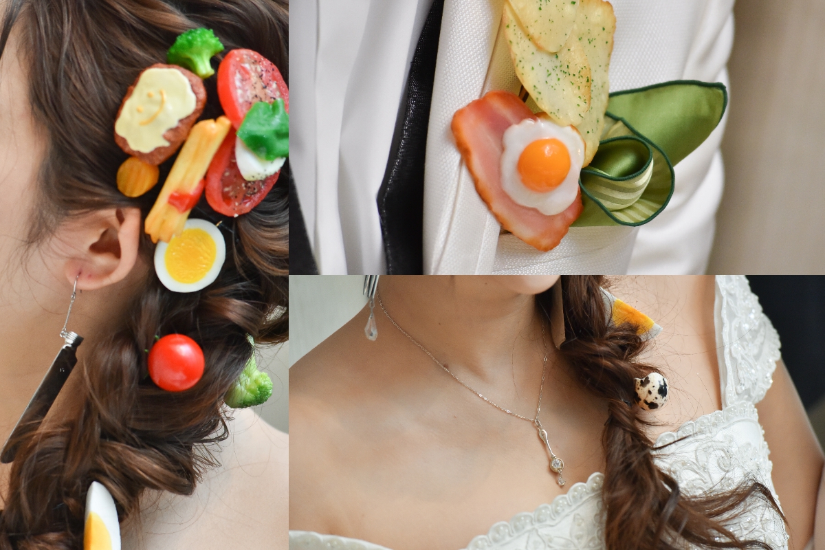 当初から結婚式に「来て頂く」という想いがあり、出来るだけおもてなししたいと考えていました。ですので余興などは友人などに頼まず自分たちでと思っていました。そこで、会場の見学でクレープシュゼットの余興が出来ることが分かり取り入れました!結果、盛り上がってくれて良かったです!結婚式が終わってから披露宴に移る際に2階の階段から降りていく形を取ったのも特別感があり好評でした!テーマである「食べ物」を意識して、入口のウェルカムスペースに新婦の趣味で集めた食品サンプルを飾り、ウェディングケーキも大きなオムライスの形のケーキにしてもらい、ケチャップに見立てたイチゴソースをかけたり、お色直しの時にはドレスは変えずに髪の毛に食品サンプルを付けて再登場しました!頭に食品サンプルが付いてるのがインパクトが大きく、友人たちも新婦らしいと言ってくれました(笑)
