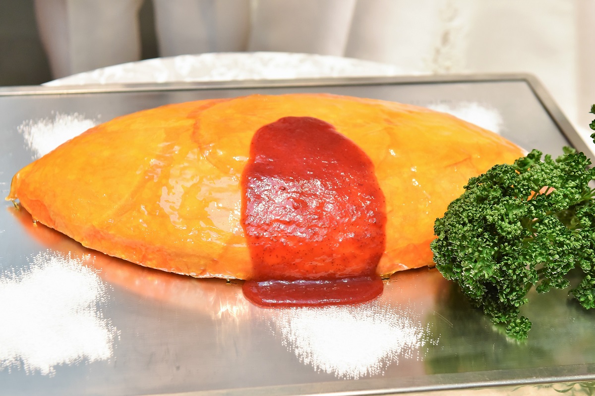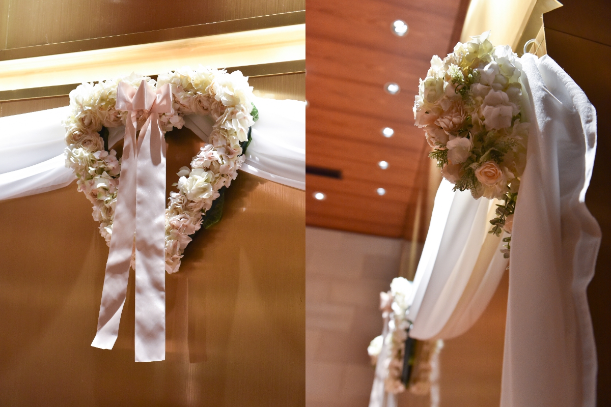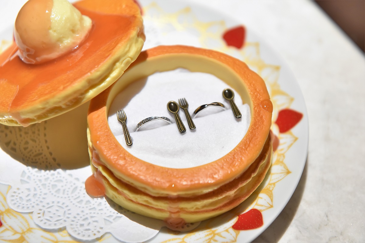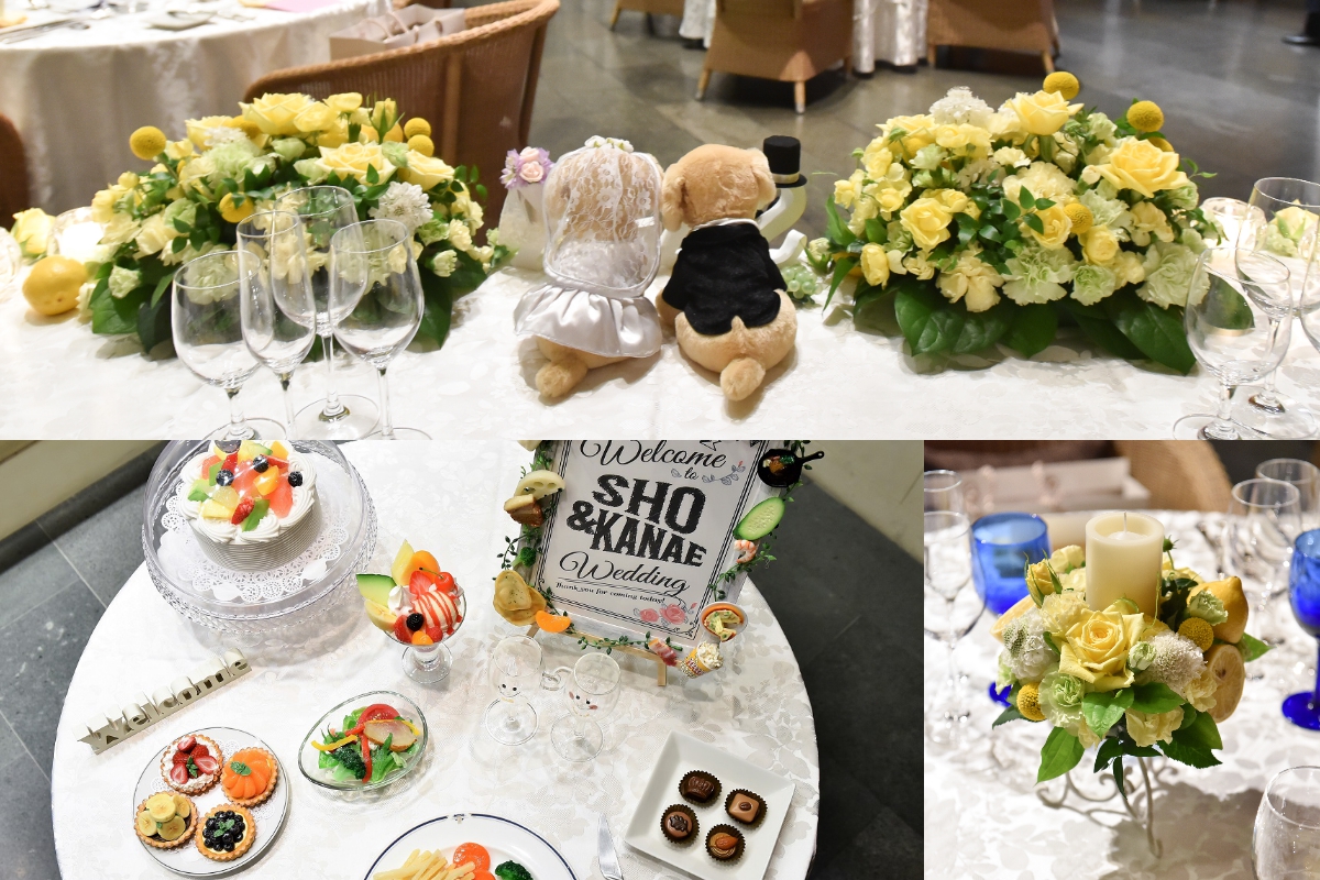 当初から結婚式に「来て頂く」という想いがあり、出来るだけおもてなししたいと考えていました。ですので余興などは友人などに頼まず自分たちでと思っていました。そこで、会場の見学でクレープシュゼットの余興が出来ることが分かり取り入れました!結果、盛り上がってくれて良かったです!結婚式が終わってから披露宴に移る際に2階の階段から降りていく形を取ったのも特別感があり好評でした!テーマである「食べ物」を意識して、入口のウェルカムスペースに新婦の趣味で集めた食品サンプルを飾り、ウェディングケーキも大きなオムライスの形のケーキにしてもらい、ケチャップに見立てたイチゴソースをかけたり、お色直しの時にはドレスは変えずに髪の毛に食品サンプルを付けて再登場しました!頭に食品サンプルが付いてるのがインパクトが大きく、友人たちも新婦らしいと言ってくれました(笑)