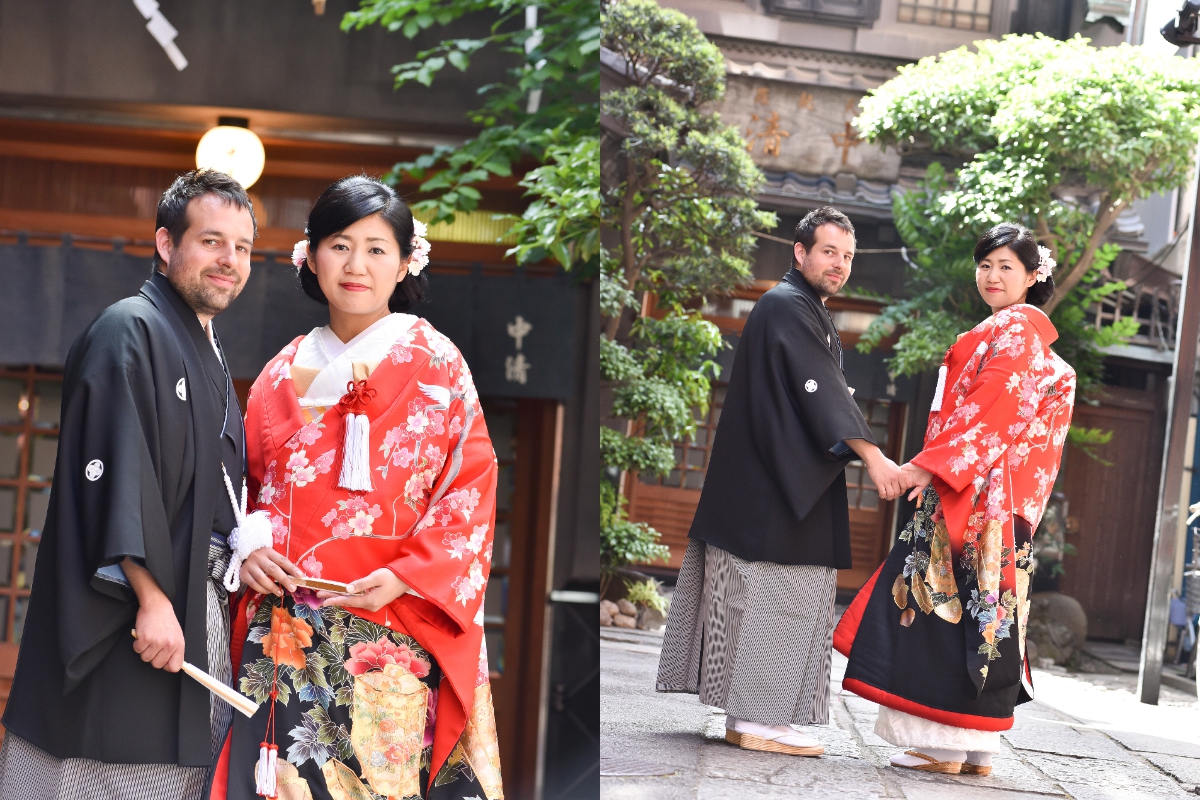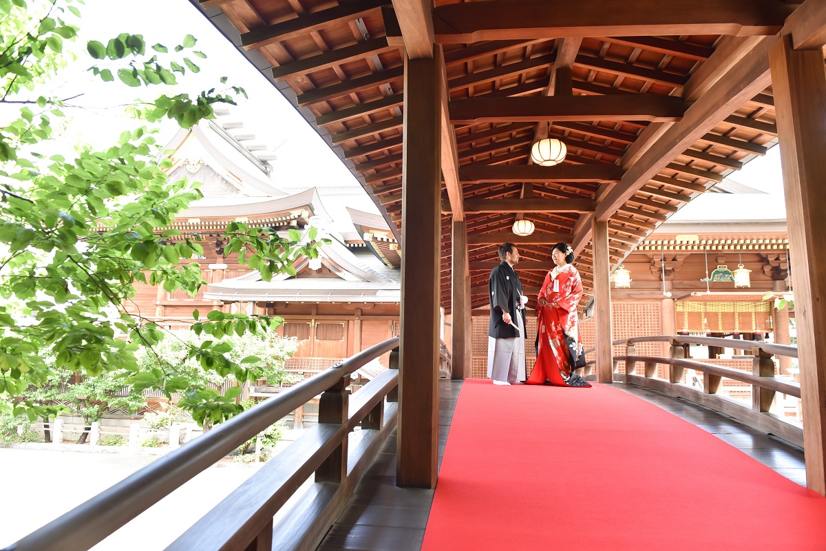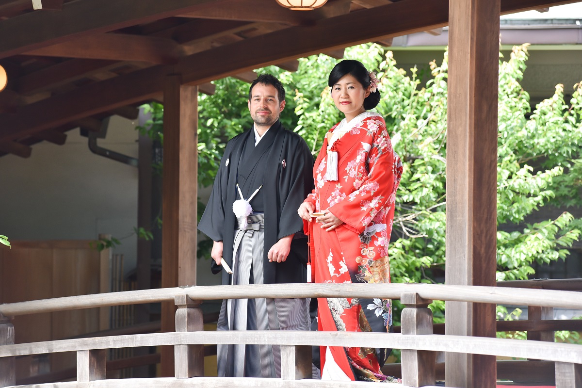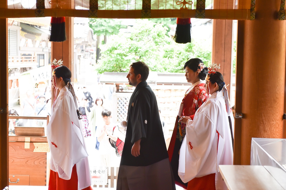 結婚式をしようと決めてから、フランス人の主人と彼の家族に、日本での結婚式はどんなものがしてみたいかを聞いてみたところ、日本の伝統的な形式で挙げたいとのことでした。私自身も和婚ウェディングに参加した事がなく、結婚前に少しだけ京都で暮らしていたので、着物や神前式のお式に憧れが強くなっており、和婚ウェディングにする事にすんなり決まりました。湯島天満宮には、
