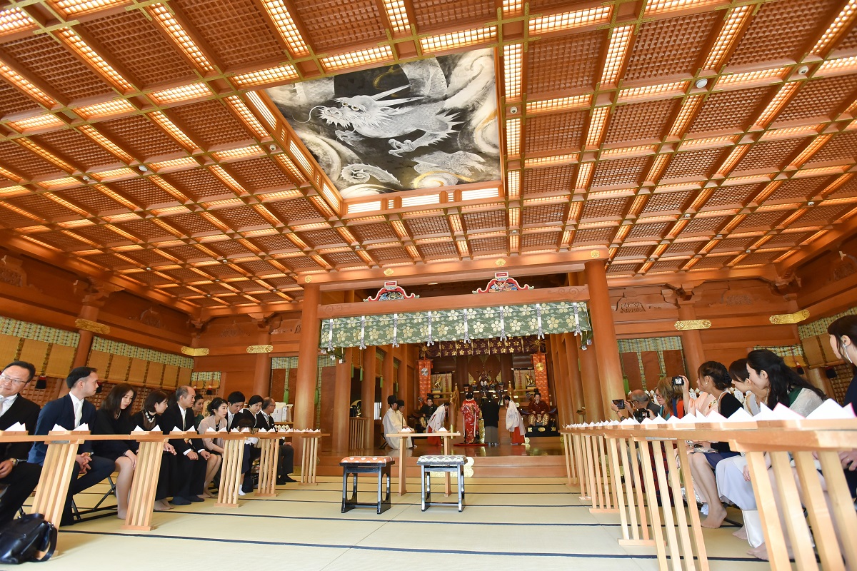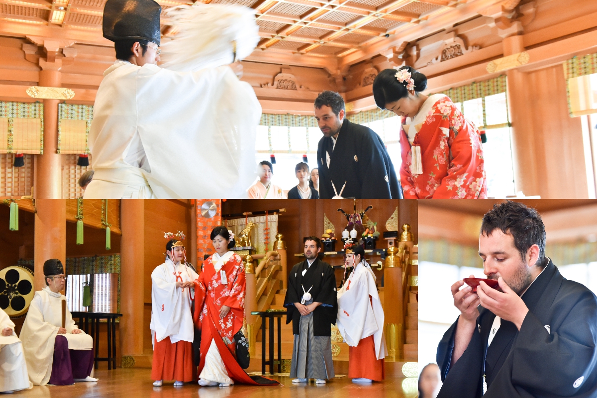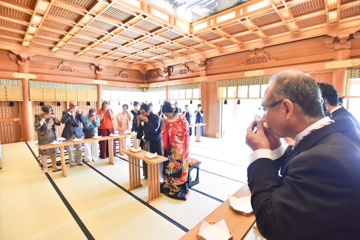 大学受験の合格祈願の時など、家族で何度もお参りに来ていたので、家族にとって親しみのある場所でしたので決めました。実際にお式をしてみて、全体的にとても厳かな雰囲気で、結婚に対して身が引き締まり、2人にとって、とてもよいスタートになったと思います。雅楽の演奏や巫女さんの舞などもあり、フランスの家族もとても感動してくれました。
