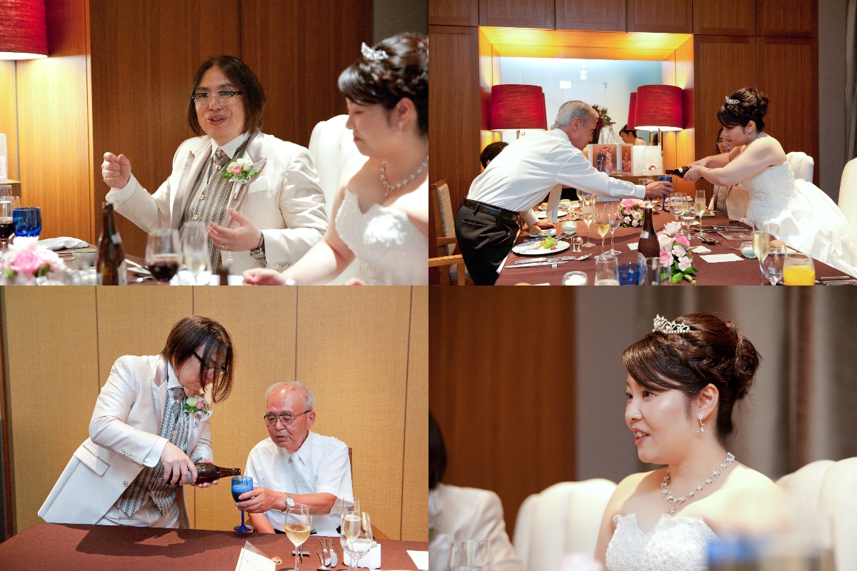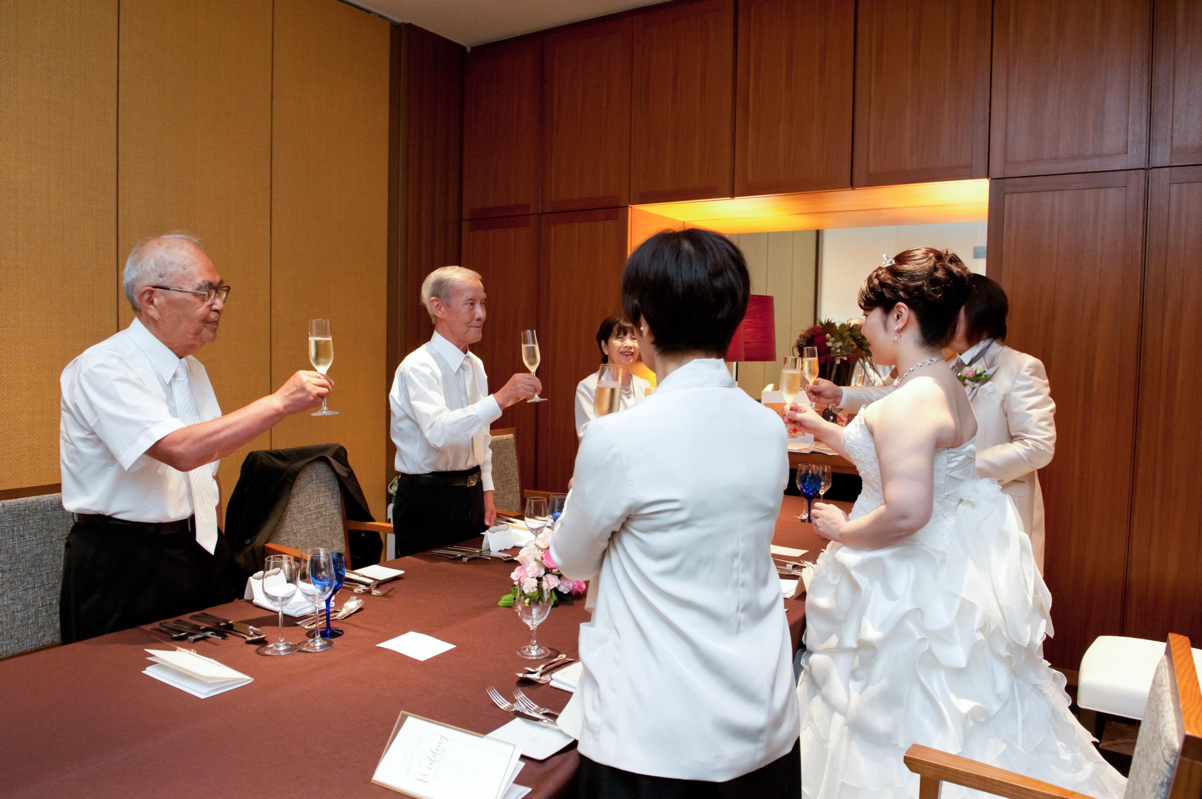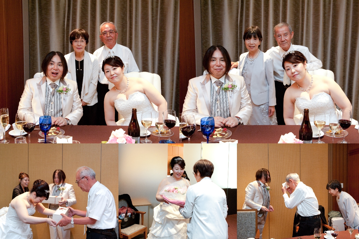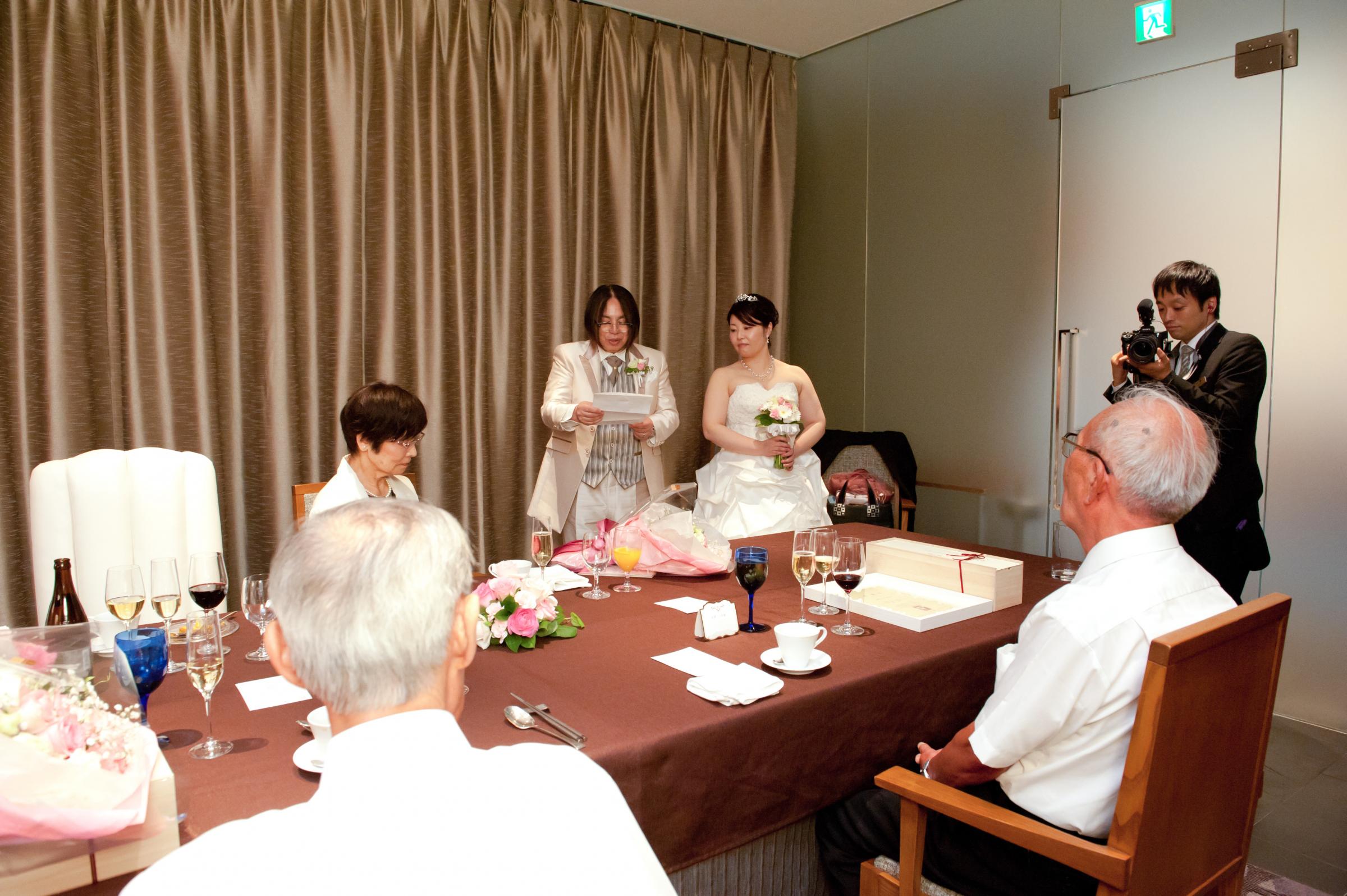 会食は新郎がそれぞれのご両親を紹介する感じで、ゆっくり両家の会話とともにおいしい食事を楽しませていただき、両親も満足そうでとっても良かったです。最後に新郎は花束と感謝の手紙、新婦は手作りした額装の感謝状と花束を両親に贈ることができました。