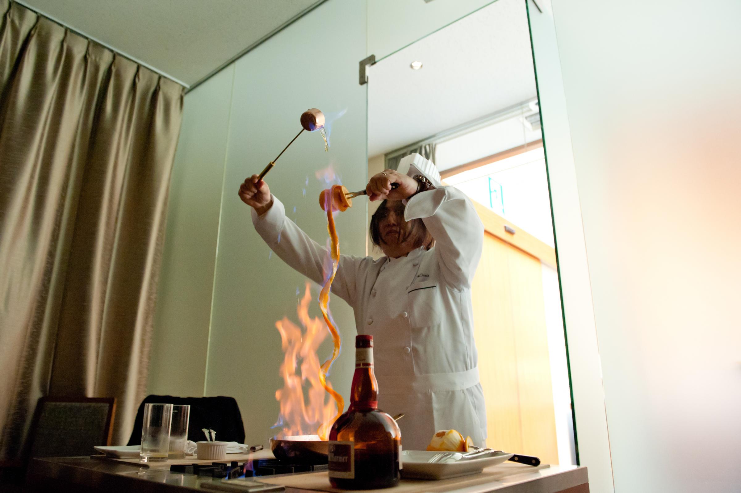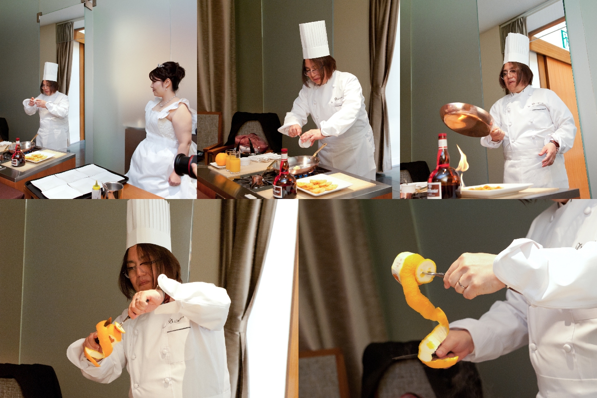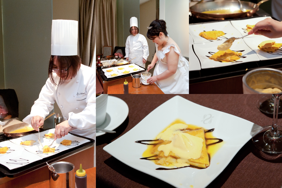 シンプルな披露会食で両親にゆっくりおいしいお料理を楽しんでもらえればよかったのですが、一つだけなにか演出しようということで、クレープシュゼットのデザート作成に挑戦しました。オレンジの皮を薄く長くむいて、それに火のついたブランデーをクレープに流こむという、ちょっと緊張もしましたが、美味しくできてとっても良かったと思います。