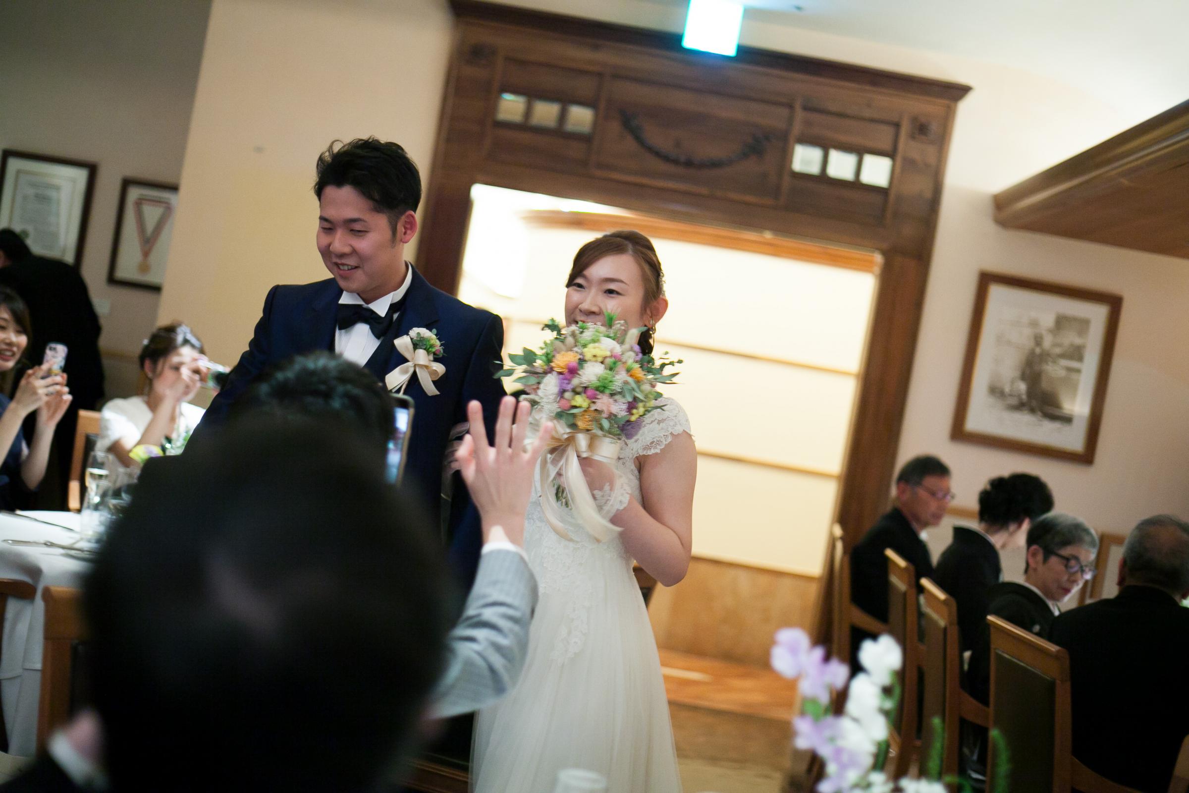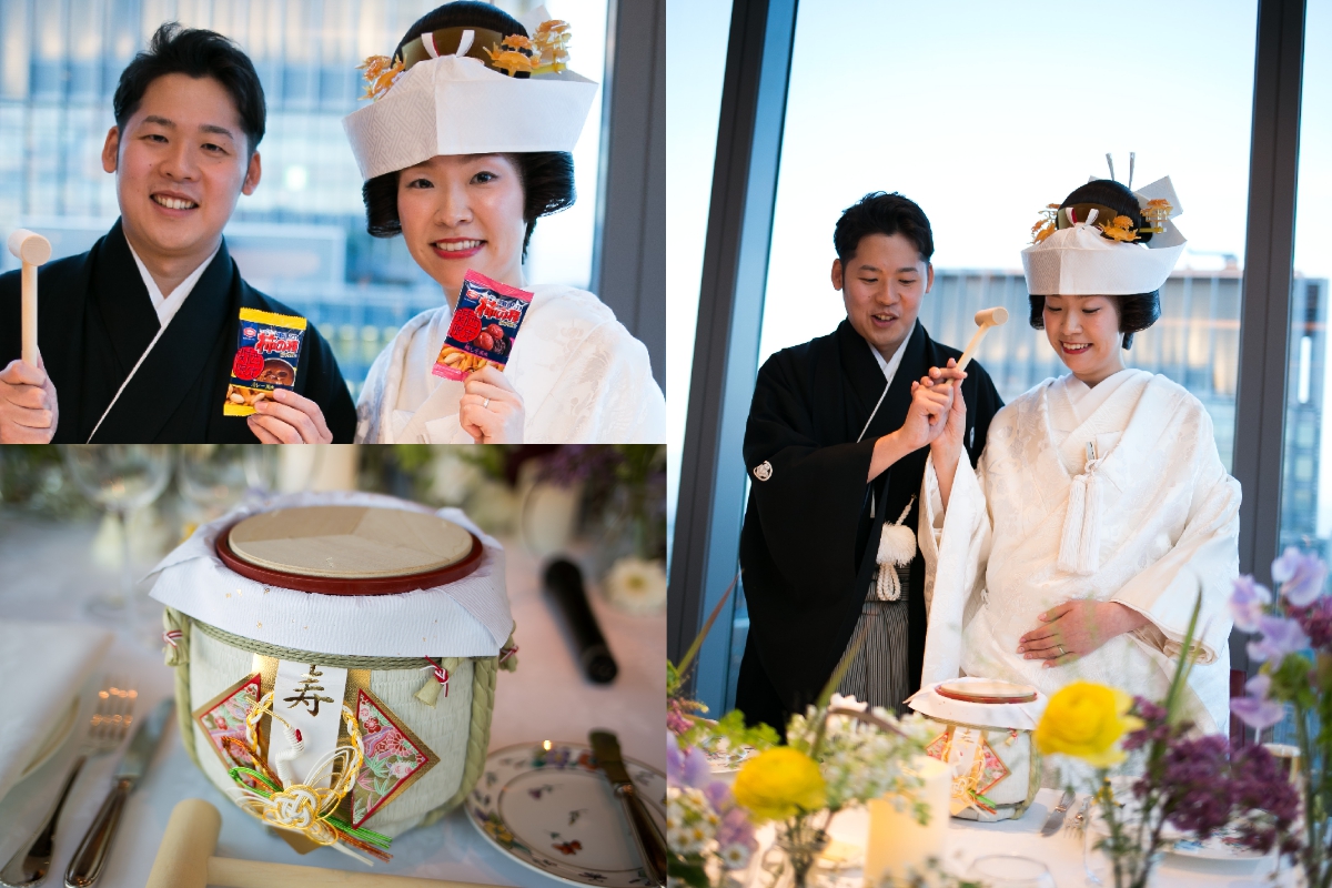 私たちは、特別な演出や余興は特に入れず、来てくれたゲストとひとりひとりと目を合わせお話をする時間や、写真を撮る時間をたくさん作りました。唯一、取り入れた演出であるミニ鏡開きは、ゲストの方も参加できて,今までにあまりない演出で楽しかったとゲストからも好評でした。また,お花などの装飾やブーケもキラキラしたものが苦手だった為、ナチュラルなものをお願いしました。特にブーケは、ドレスに合うようなものをお願いしていたのですが、当日本物を見た時に、イメージ通りでとても感動しました。ブリーザードフラワーを中心に作っていただいた為、枯れることなく、今でもお部屋に飾ってあります。