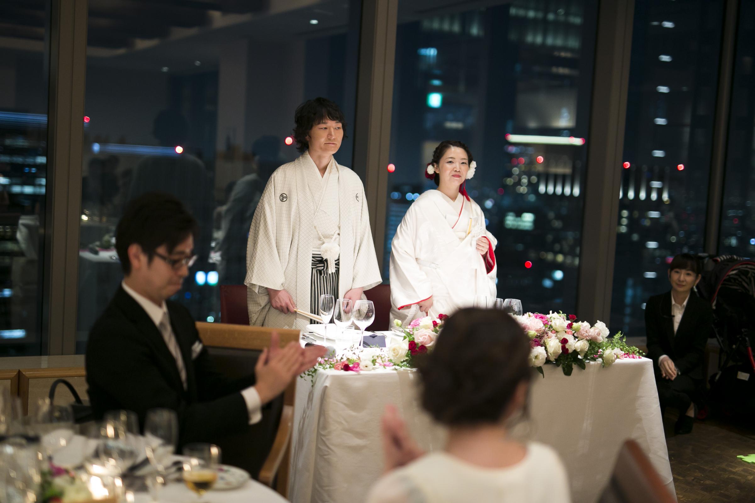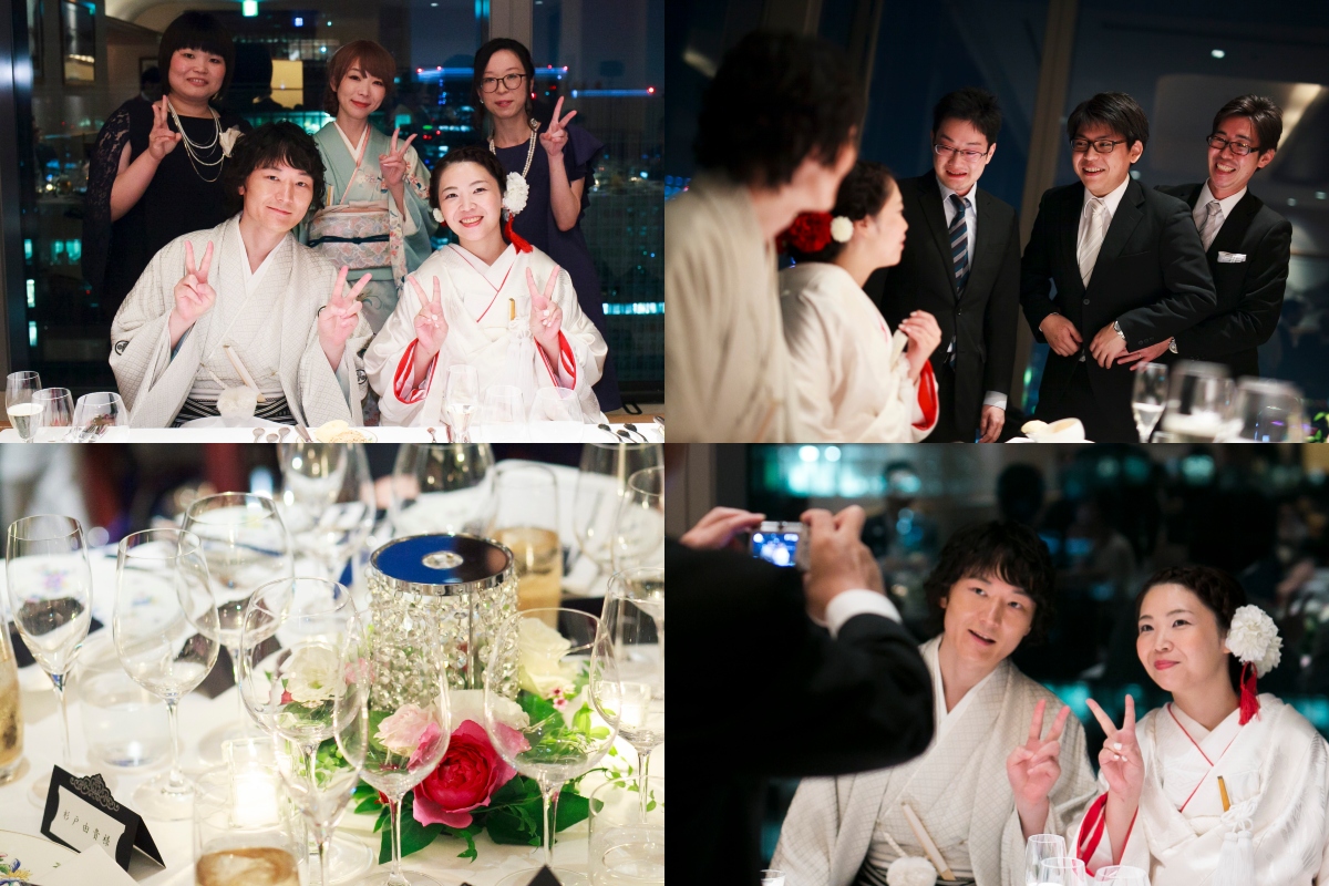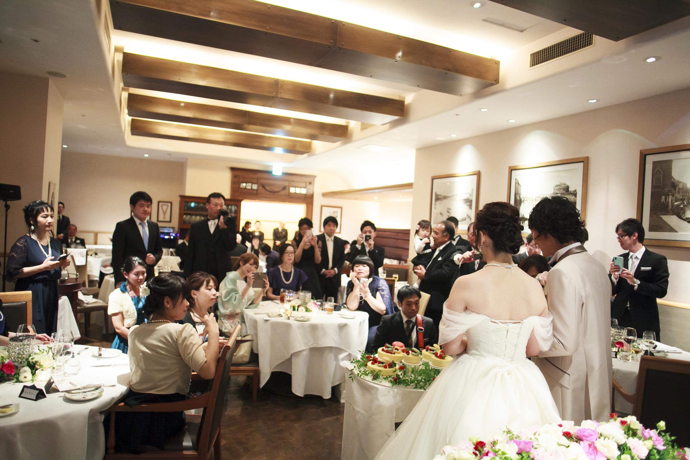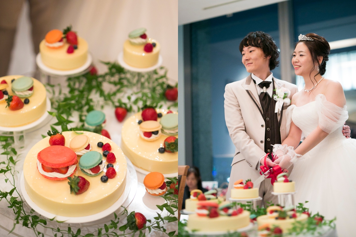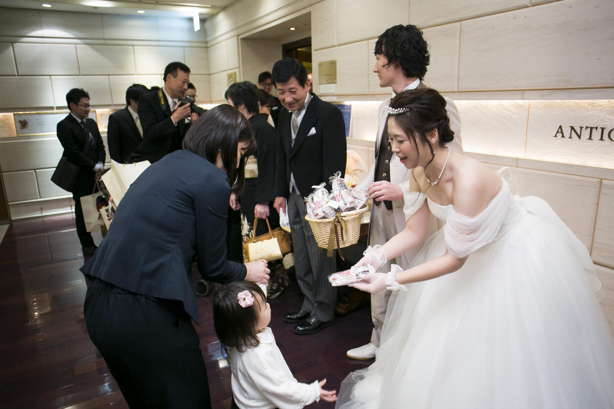 自分が美味しいと思ったものをゲストに贈りたかったので、引菓子と縁起物にはこだわりました。三越伊勢丹で取り扱っている商品は引き出物にできるということだったので、好きなお店のバームクーヘンと鯛茶漬けを選ぶことができました。また、2次会は行わない予定だったので、ゲストへプレゼントを渡せるような余興がしたいと考えていました。プランナーの近藤さんから、クイズのご提案頂き、新郎新婦にまつわるクイズをだそうと即決しました。中座前にクイズを行ったことで、話題提供ができ各テーブルで盛り上がったようでした。プレゼントはお気に入りのお店の焼き菓子と学生時代にアルバイトをしていた老舗和菓子店の小型羊羹をギフトラッピングして、テーブルラウンドのときに一人一人にありがとうの気持ちを伝えながら渡しました。プレゼントの持ち込み料がかからなかったので、とても助かりました。