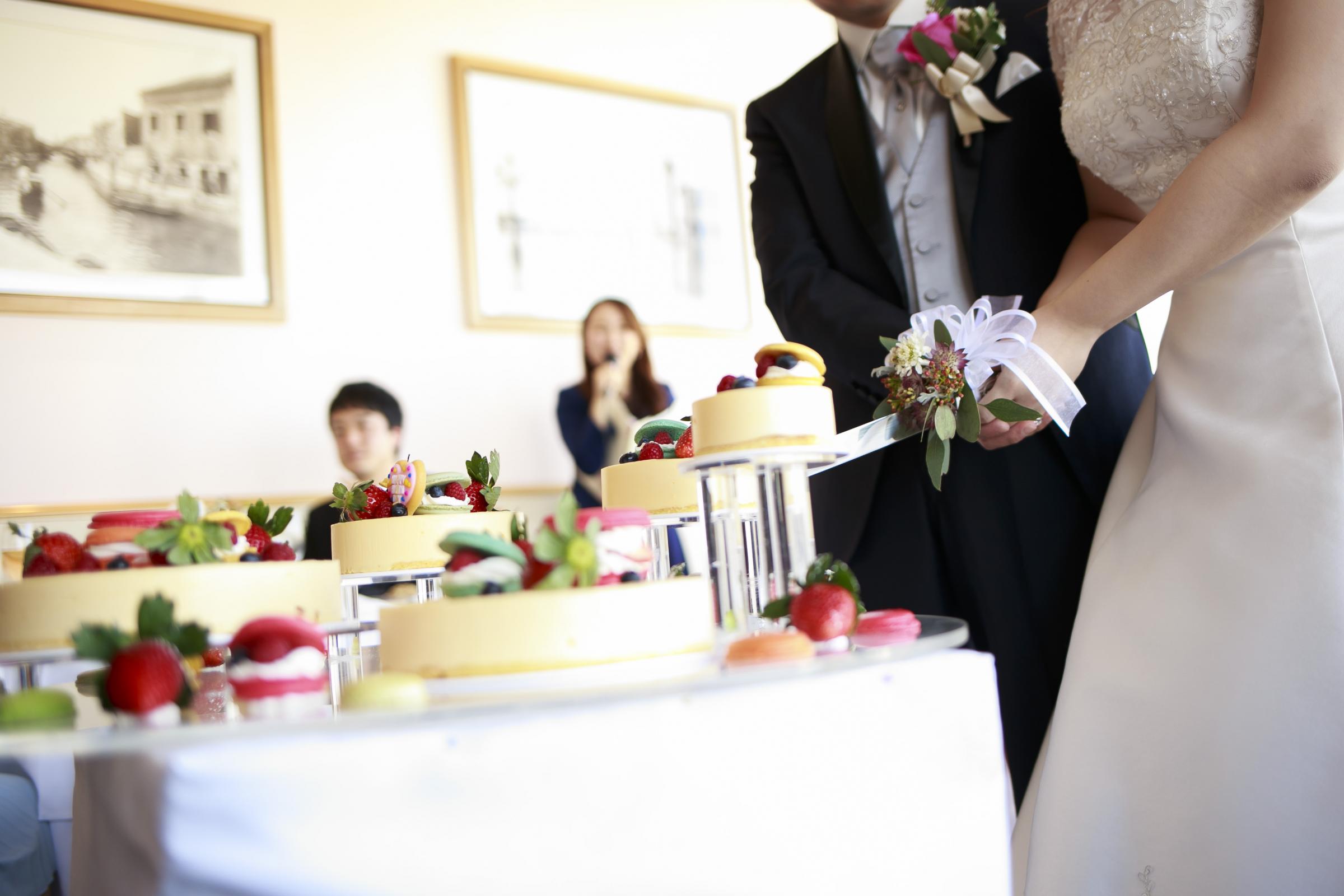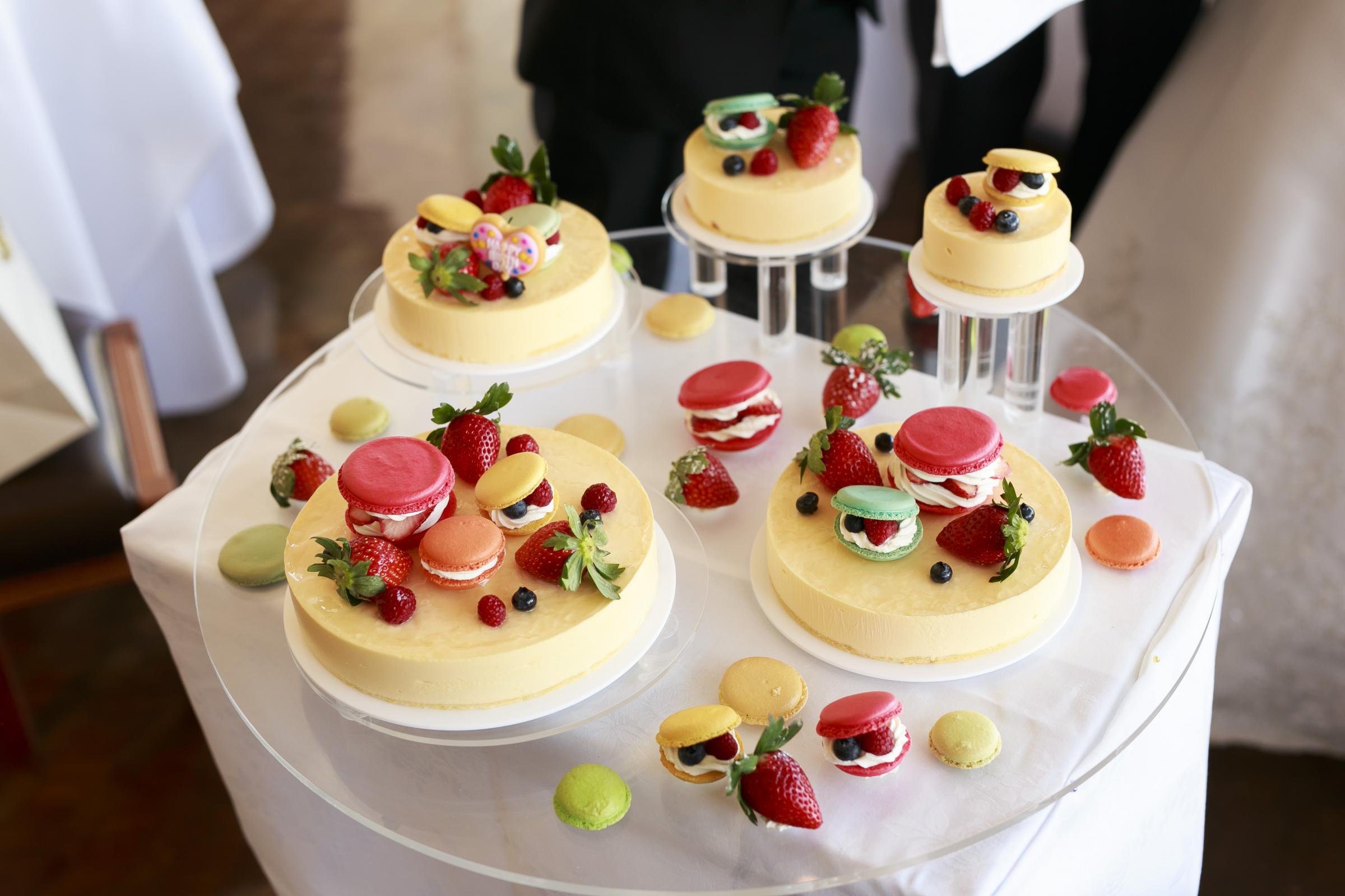 スプマンテのムースというちょっと変わったウェディングケーキも、見た目もきれいで、かつとても美味しかったのでゲストからは好評でした。マカロンのファーストバイトも少し照れましたがやってよかったです。