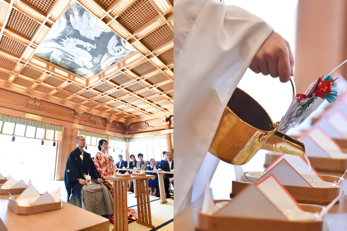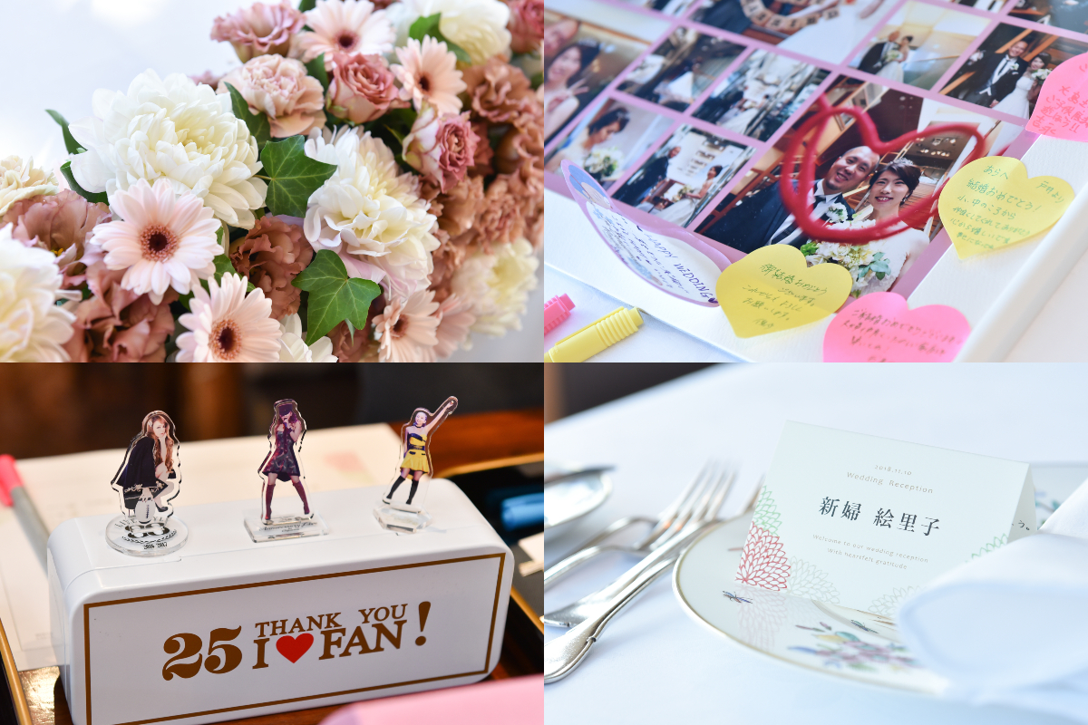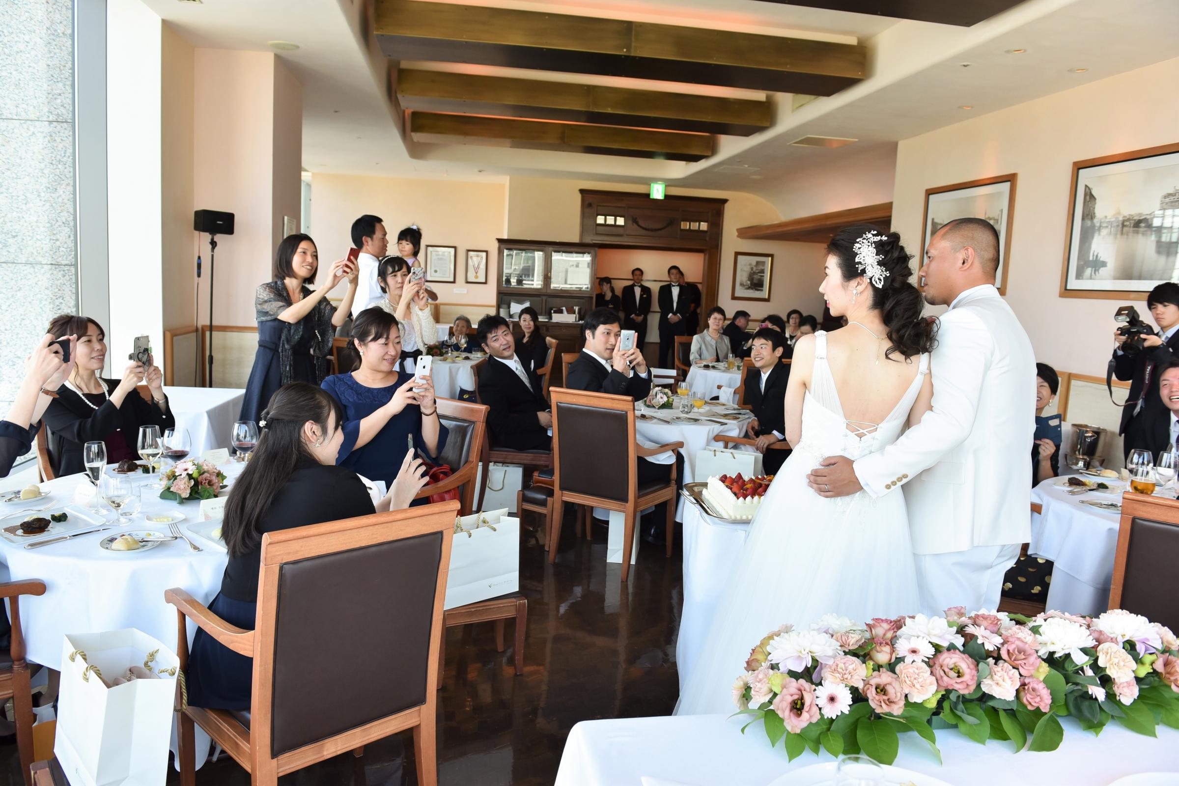 招待する方は親族中心だったため、大げさな演出や余興はあまりやりたくないとふたりで考えていました。その代わりにテーブルラウンドの時間を多めに取っていただき皆さんと写真とたくさん撮りたいとプランナーの原様に伝え、ケーキ入刀後のファーストバイトは見飽きている人が多いかなと思い、母たちへのラストバイトとサンクスバイトを選びました。また神前式だとバージンロードを父と歩くということが出来ないのでお色直し後に父と一緒に再入場し腕を組んで歩く演出が出来てよかったです!父も当日は感慨深そうにぐっときていた様子でした。またサプライズで新郎宛に事前に書いた手紙を司会の方に読んでいただきたいと相談していたのですが、当日無事驚いてくれたようで良かったです。夫婦間で披露宴中のサプライズはゲストには受けが良くないだろうかとも悩みましたが新婦側の友達が特に盛り上がって拍手を送ってくれたようで安心しました。