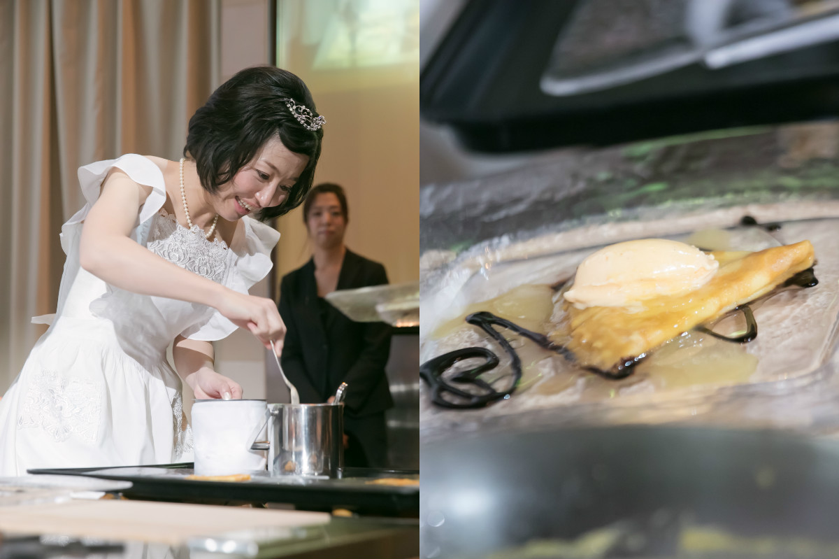 演出については、プランナーの方から提案をいただきながら、クレープシュゼットなど自分たちが希望