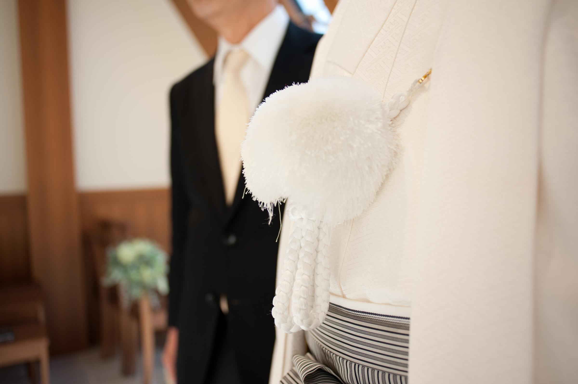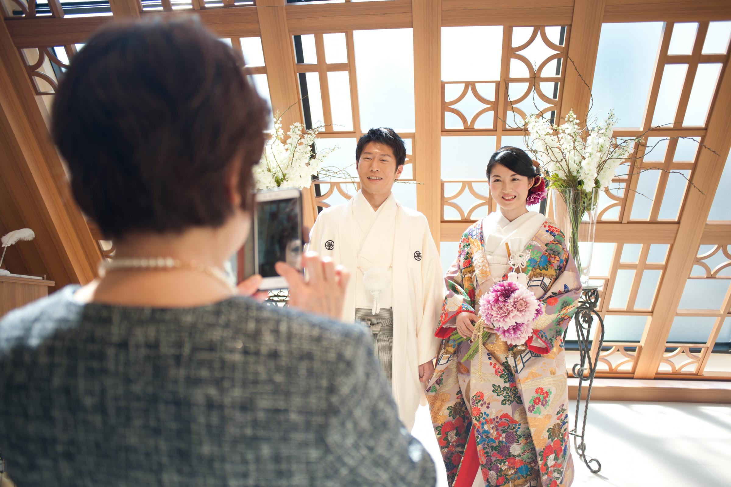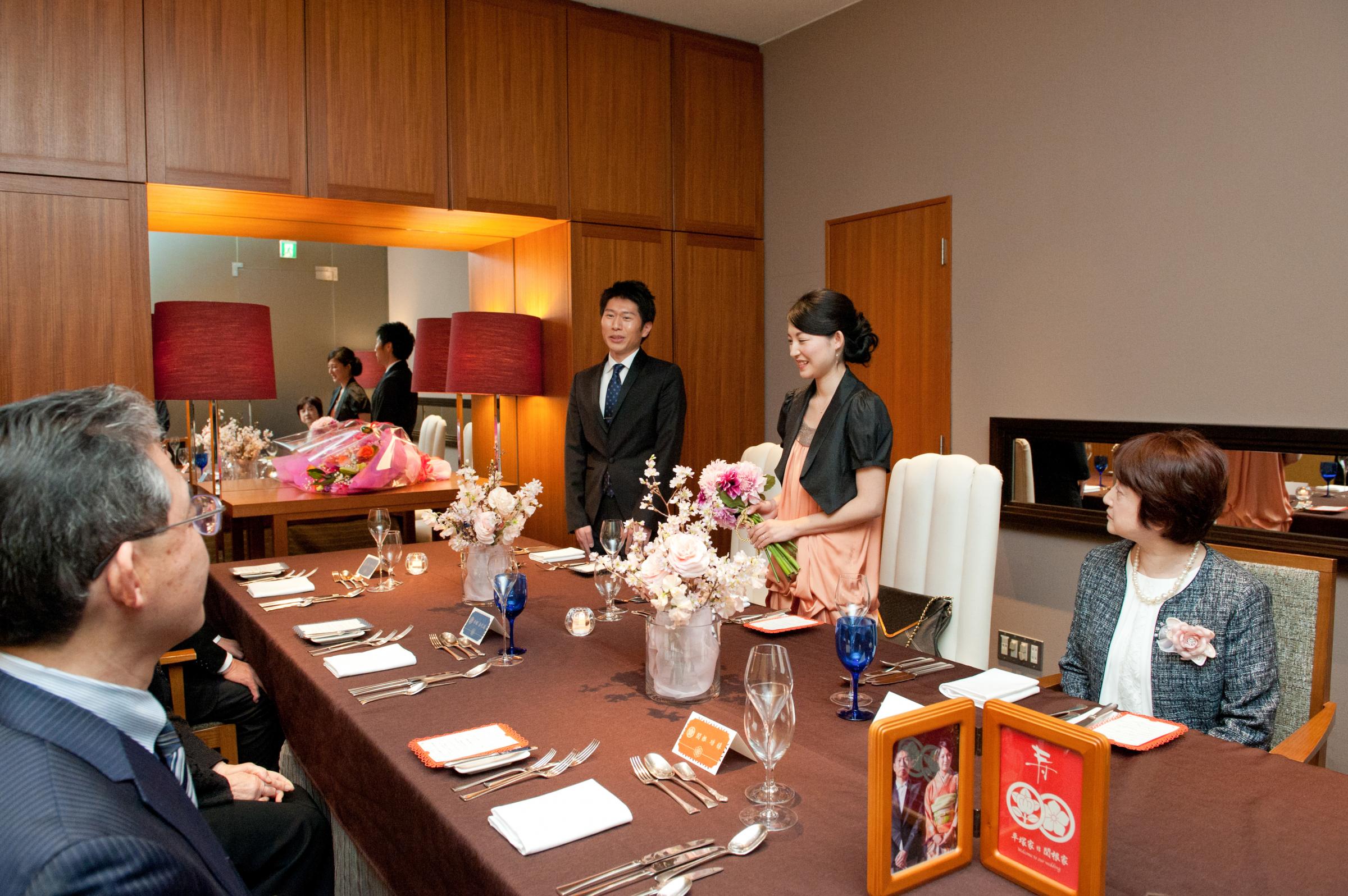 私たちはフォトウエディングを和装で行い、食事会を肩ひじ張らないパーティドレスに着替えて行いました。フォトウェディングでは新郎の着物に自家の家紋を入れ、代々伝わる家族の繋がりを感じられる様にしました。食事会は家族初の顔合わせという事もあり、アットホームな雰囲気を出したかったので、会話が増えるようなアルバムをつくり、席次表・メニュー表なども自前で用意して、楽しんで食事出来るよう工夫しました。また、私たちのテーマが『結』であったので、家族と家族が繋がる特別な時間にしたく、席次表やウエルカムボードを両家の家紋をあしらいデザインしました。