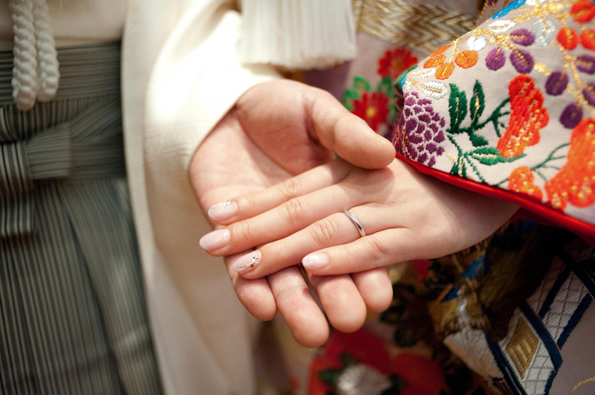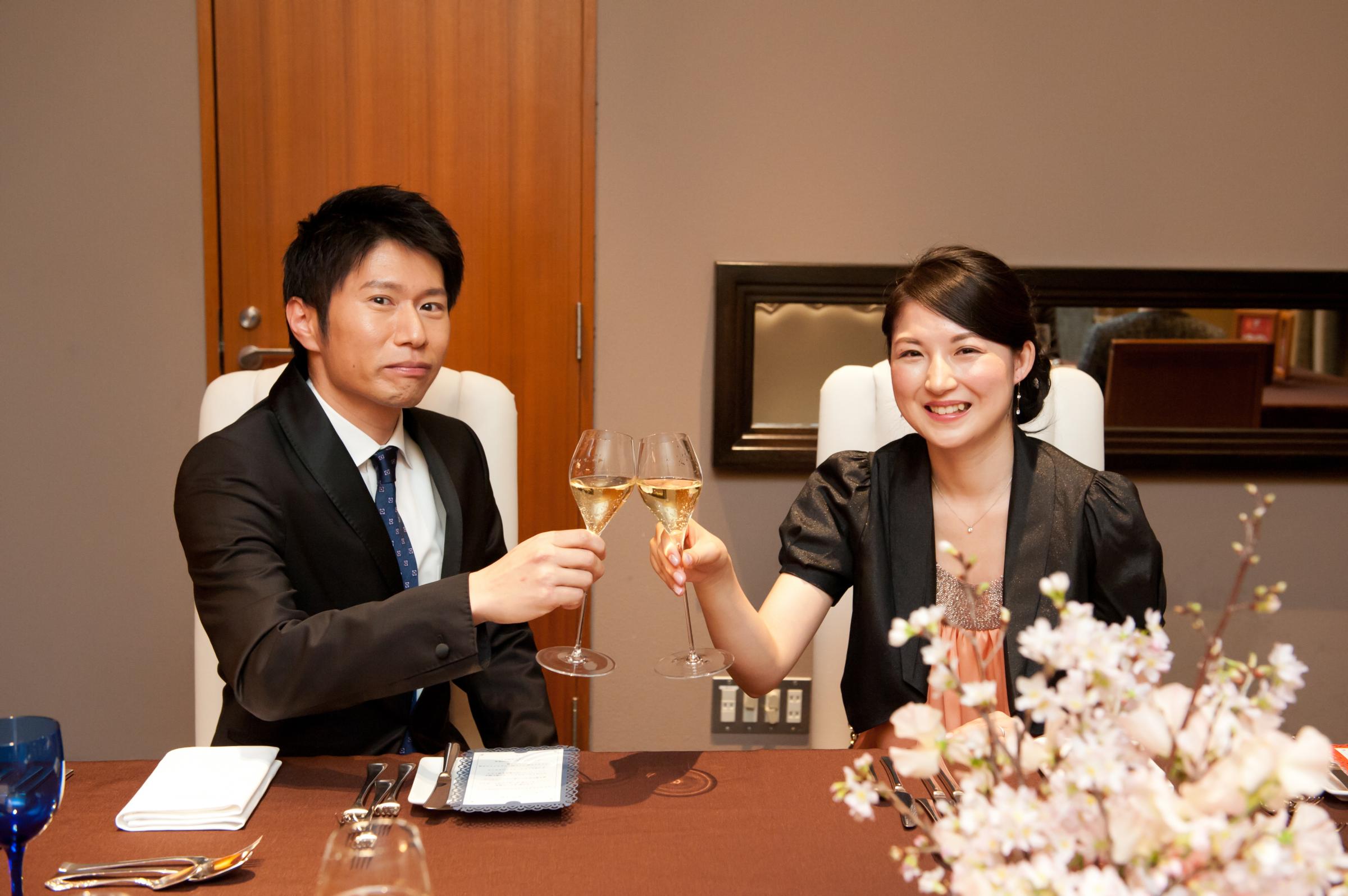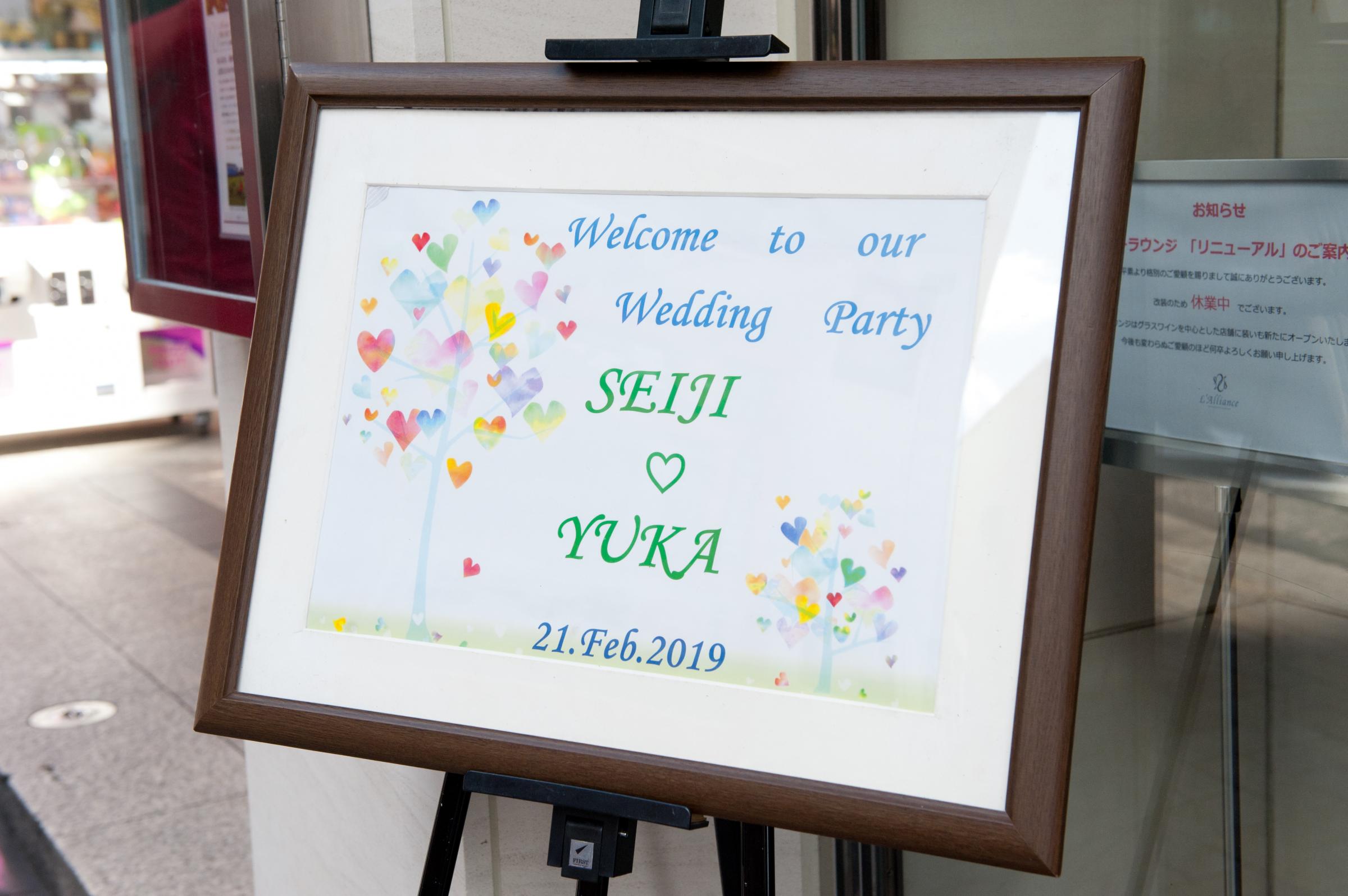 私たちはフォトウエディングを和装で行い、食事会を肩ひじ張らないパーティドレスに着替えて行いました。フォトウェディングでは新郎の着物に自家の家紋を入れ、代々伝わる家族の繋がりを感じられる様にしました。食事会は家族初の顔合わせという事もあり、アットホームな雰囲気を出したかったので、会話が増えるようなアルバムをつくり、席次表・メニュー表なども自前で用意して、楽しんで食事出来るよう工夫しました。また、私たちのテーマが『結』であったので、家族と家族が繋がる特別な時間にしたく、席次表やウエルカムボードを両家の家紋をあしらいデザインしました。