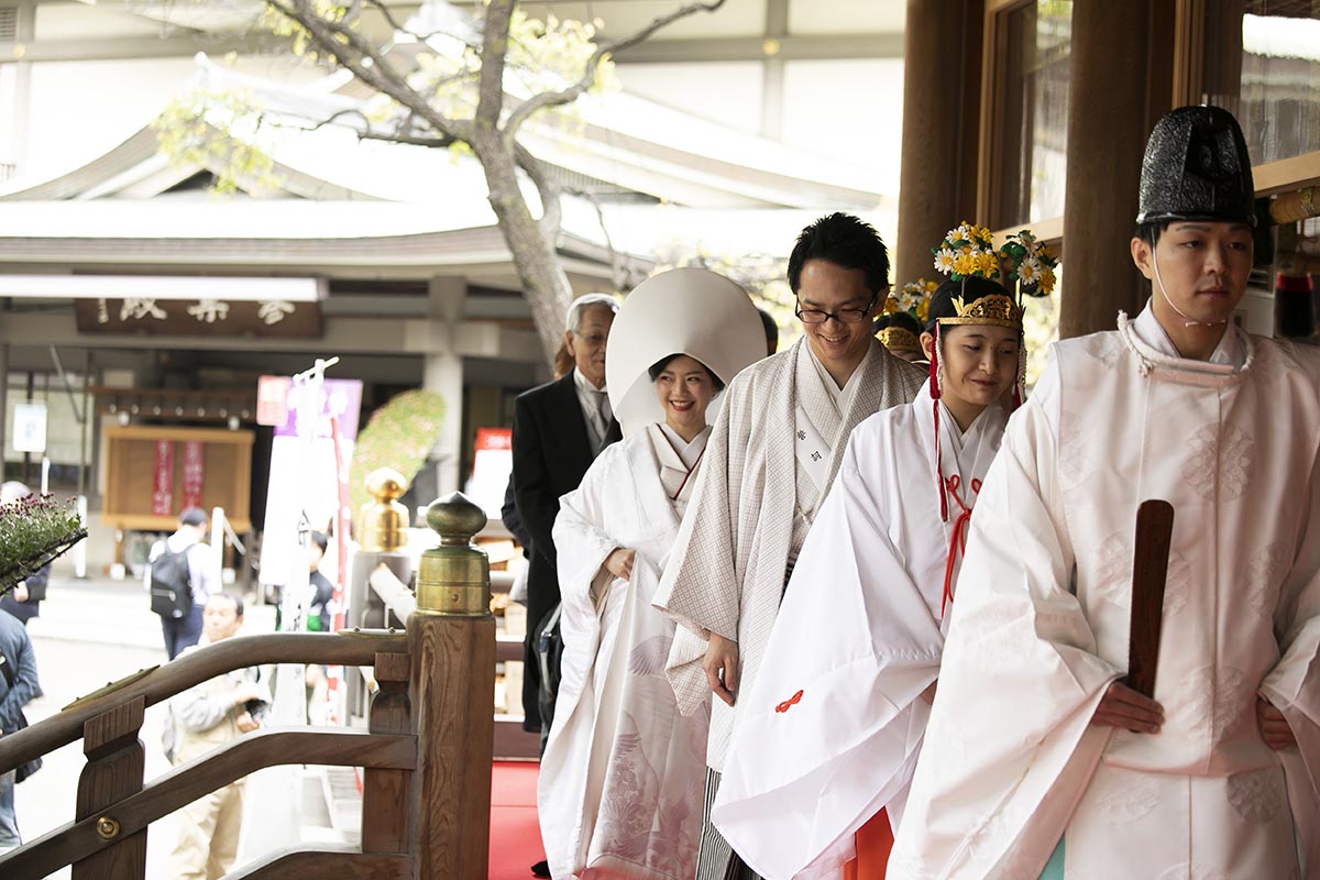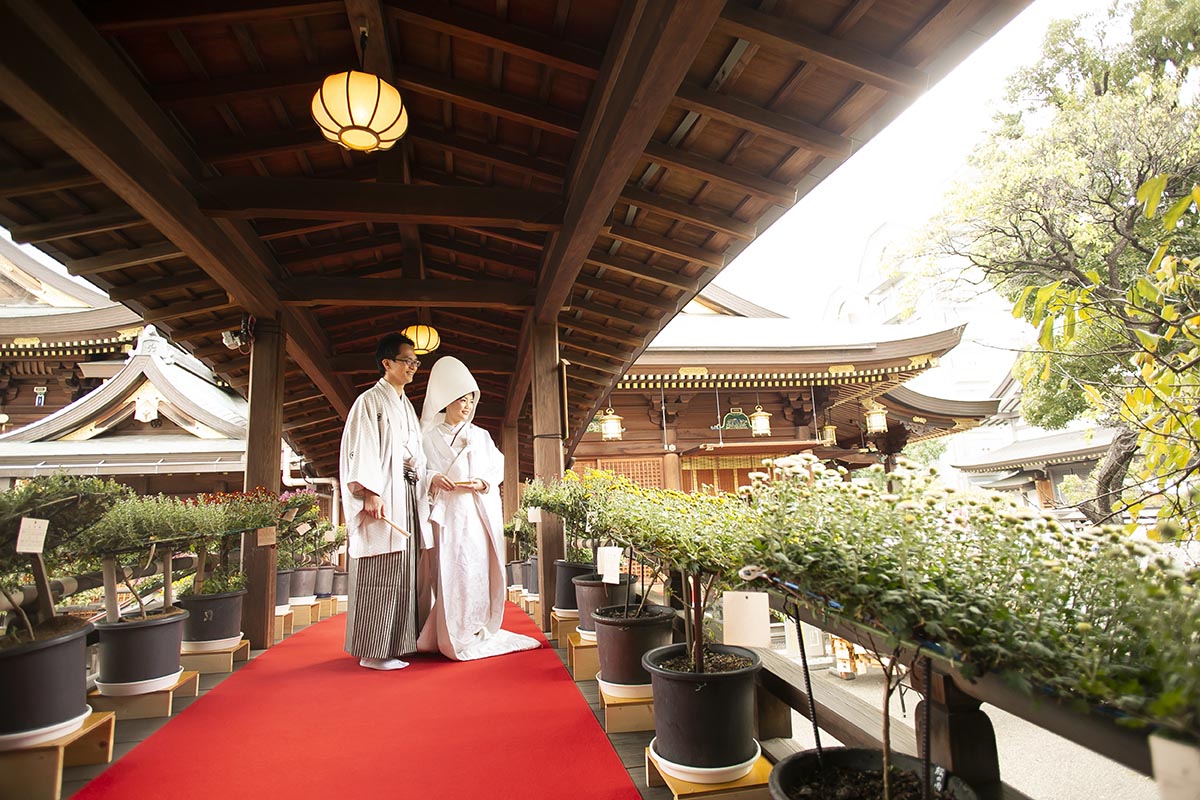 式は、湯島天満宮で行いました。決め手は、①私たちが教員なので「学問の神様」だったこと②太鼓橋があること③お庭がきれいで写真も撮れること④一般の方にも迷惑にならない十分な広さがあること⑤明るいこと⑥ゲストの待合スペースが室内でしっかり確保されていること⑦アクセスしやすく駐車場も近くにあること⑧巫女舞をしてくれることです。