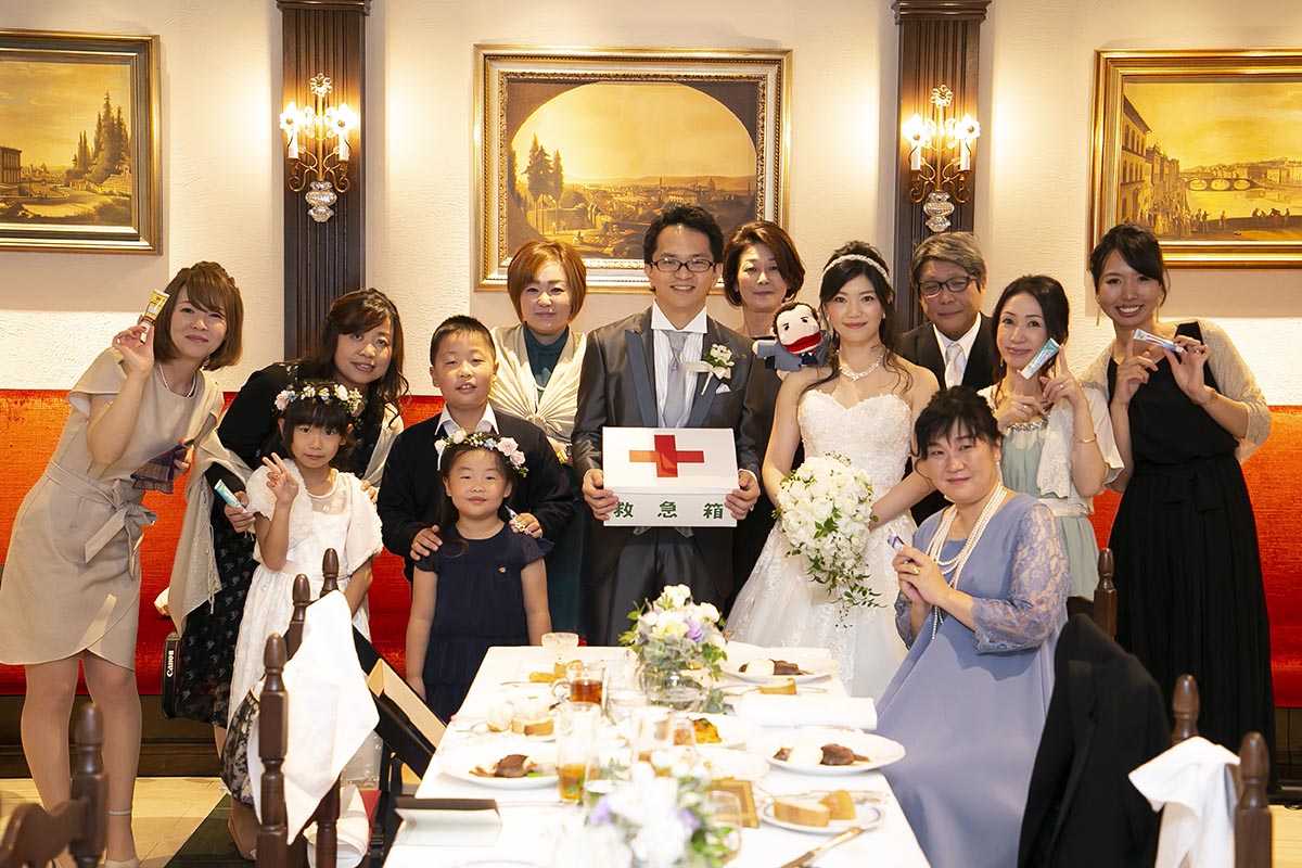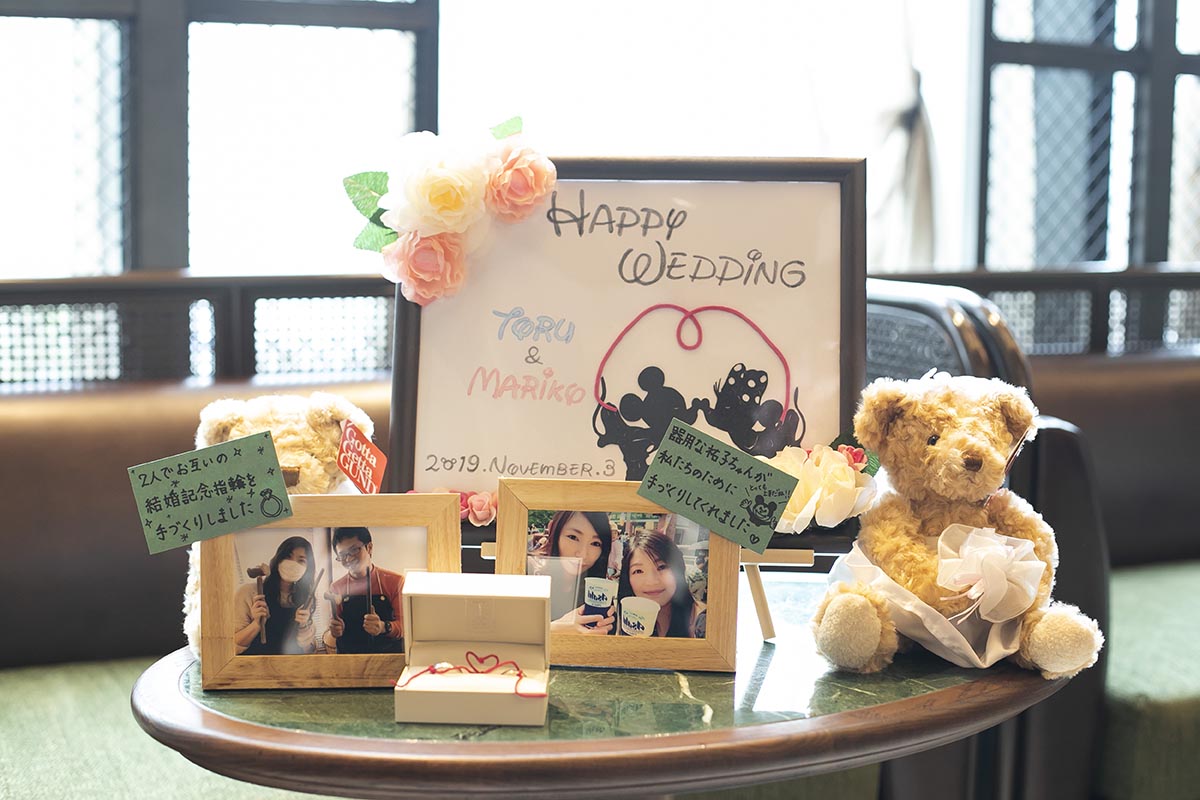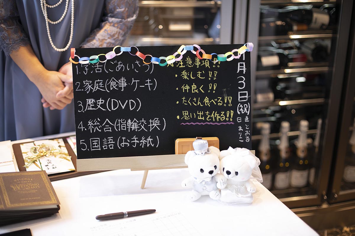 できる限り手作りを心がけました。学校モチーフのものを多く取り入れ芳名帳は「出席簿」風に、メッセージカードは「通知表」風に、受付後の待ち時間に読んでもらうエピソードを綴ったプリントも作り「学級通信」としました。ウェルカムボードは小さな黒板を作り、時間割のイメージで披露宴の内容を書きました。余興では、プレゼントが当たるくじ引きをしました。保健室をイメージして救急箱を作り、塗り薬風のペンをくじに使いました。披露宴後のプチギフトは、「本日はありがとうございました」とメッセージが書いてある黒板のアイシングクッキーを作りました。陰膳を一席用意しましたが、故人に見立てたパペットを作って家族に渡しました。また、小さな子たちのためにキッズスペースを作ったり、ラストバイト・サンクスバイトや新郎へのギフト、手作りの子育て感謝状、ウエイトベアなどを取り入れ、見どころや感謝の気持ちが伝わるよう心掛けました。