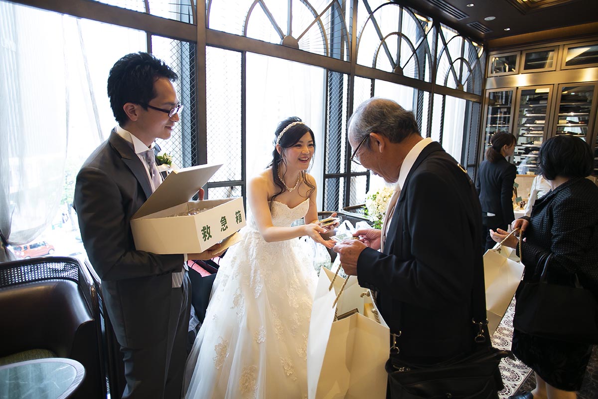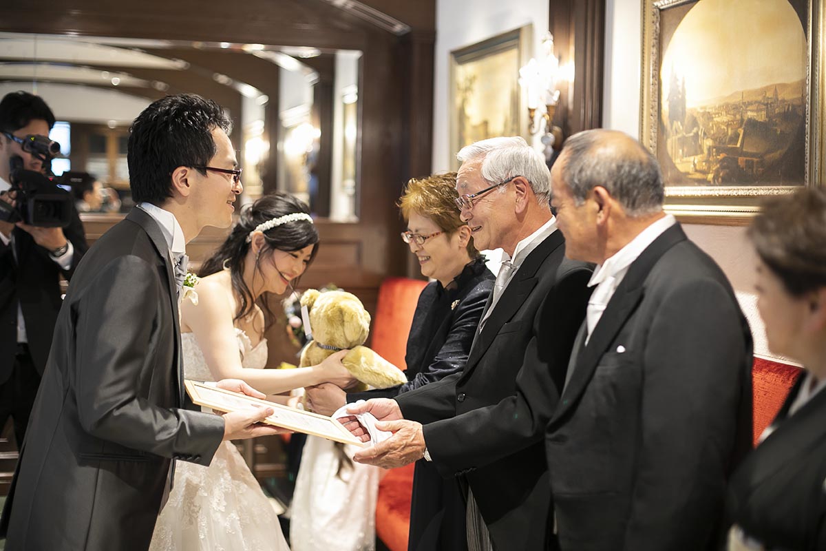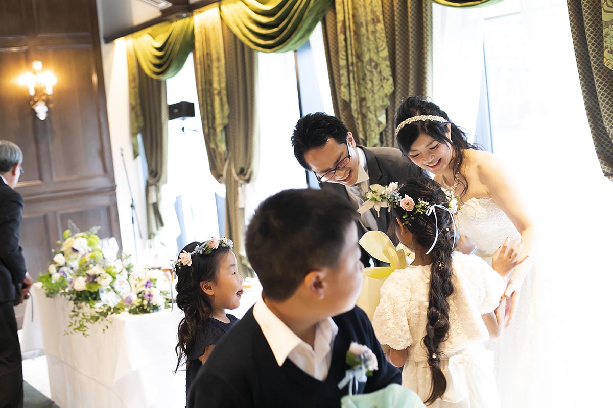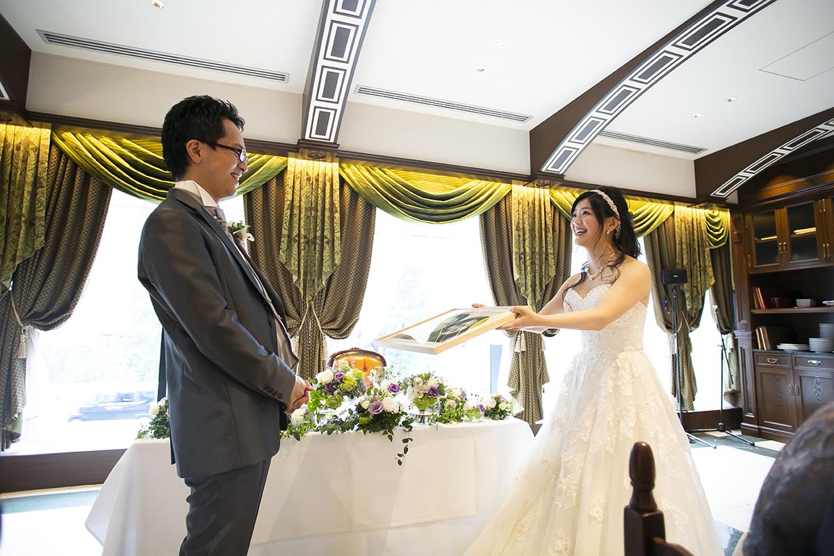 できる限り手作りを心がけました。学校モチーフのものを多く取り入れ芳名帳は「出席簿」風に、メッセージカードは「通知表」風に、受付後の待ち時間に読んでもらうエピソードを綴ったプリントも作り「学級通信」としました。ウェルカムボードは小さな黒板を作り、時間割のイメージで披露宴の内容を書きました。余興では、プレゼントが当たるくじ引きをしました。保健室をイメージして救急箱を作り、塗り薬風のペンをくじに使いました。披露宴後のプチギフトは、「本日はありがとうございました」とメッセージが書いてある黒板のアイシングクッキーを作りました。陰膳を一席用意しましたが、故人に見立てたパペットを作って家族に渡しました。また、小さな子たちのためにキッズスペースを作ったり、ラストバイト・サンクスバイトや新郎へのギフト、手作りの子育て感謝状、ウエイトベアなどを取り入れ、見どころや感謝の気持ちが伝わるよう心掛けました。