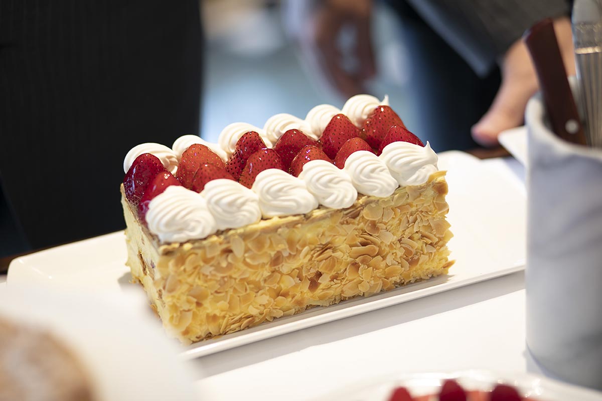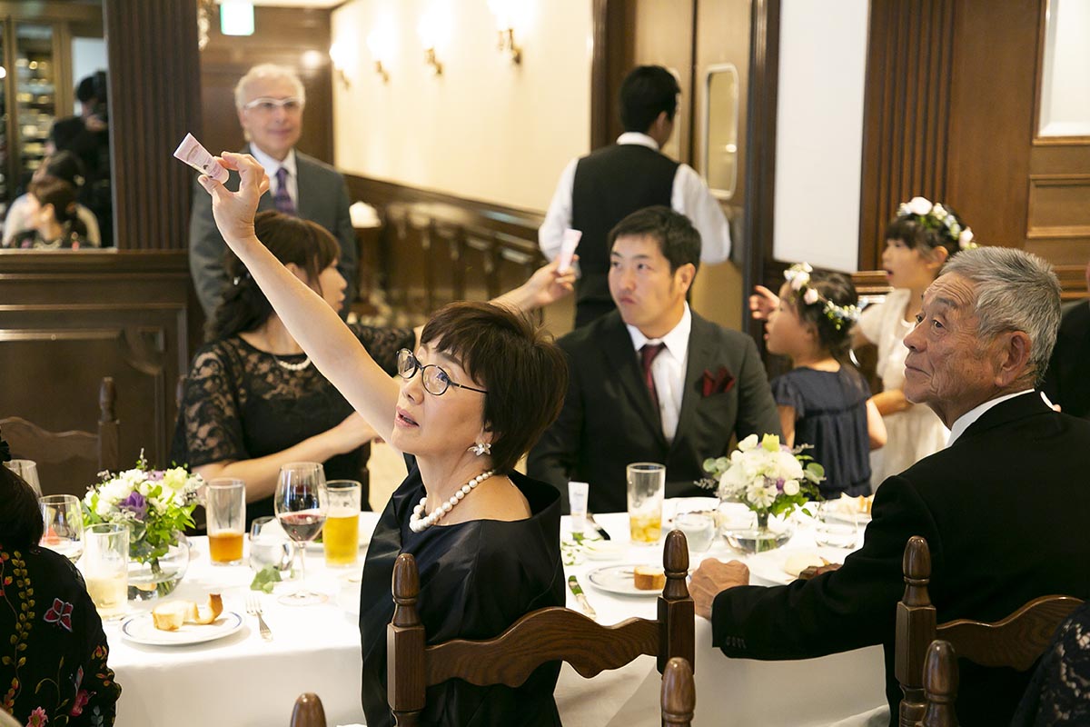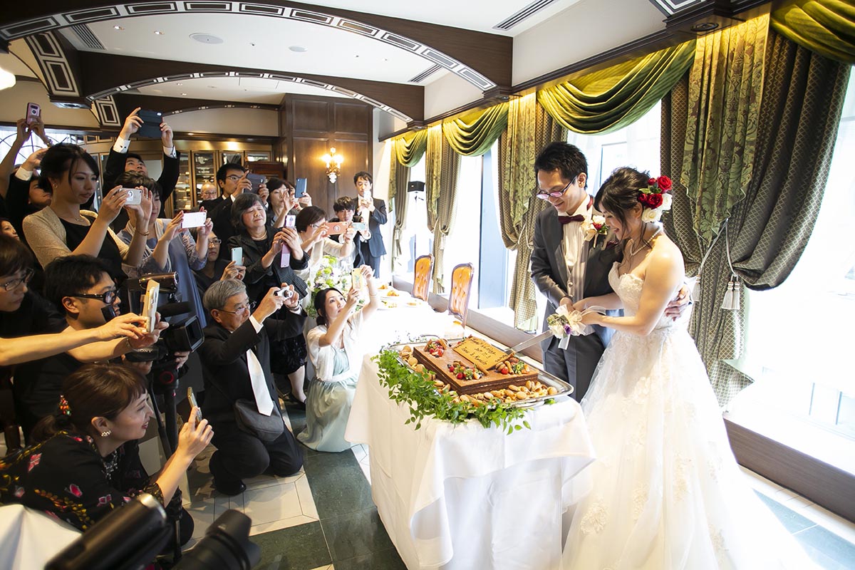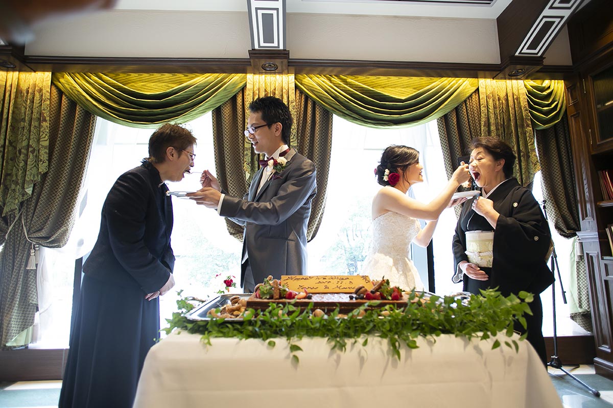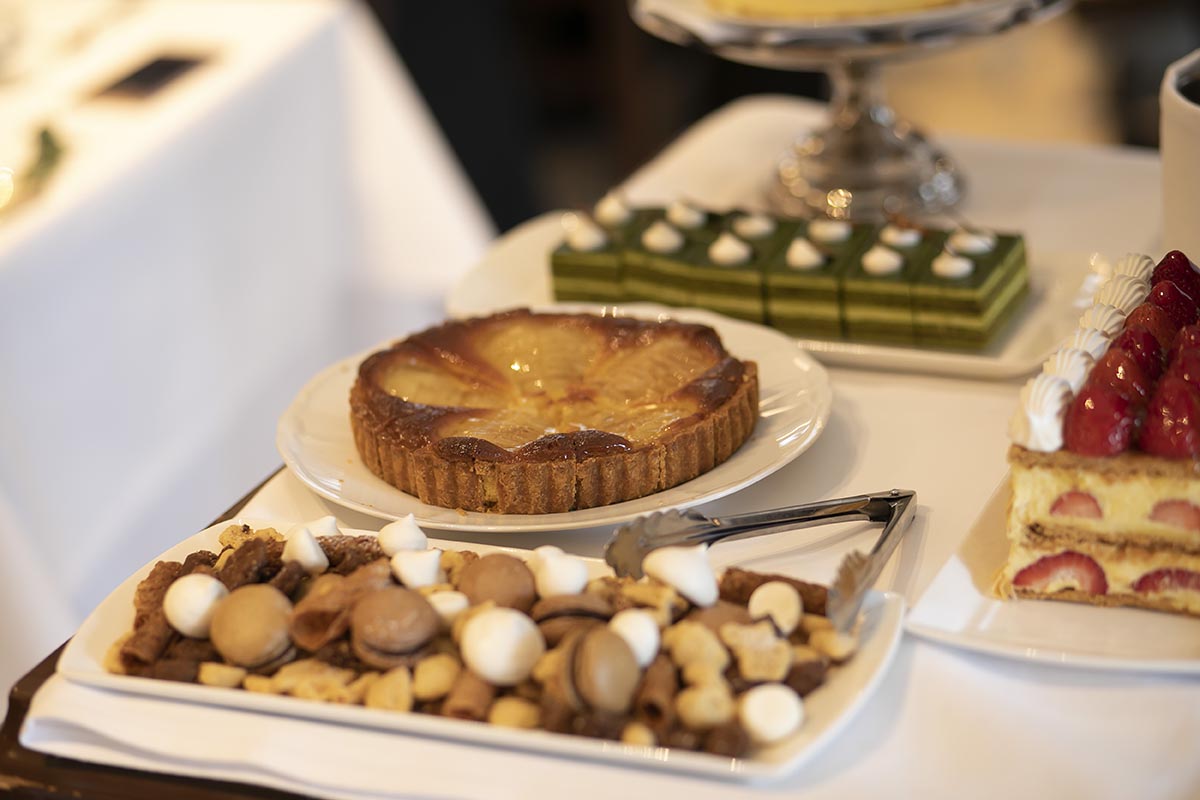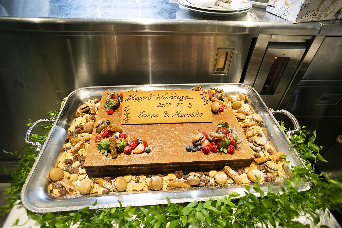 試食に行ったときにデザートで出していただいたガトーショコラがとてもおいしかったのですが、当日は違うケーキになるということだったので、無理を言ってガトーショコラでウエディングケーキを作っていただきました。また、試食に行った際にスイーツが数種類ワゴンサービスでサーブされているのを見て、これも無理を言って当日もしていただきました。お料理のボリュームもしっかりしているので、スイーツが多すぎたかなと思いましたが、みなさんたくさん召し上がってくださいました。席を立って自分で取りに行くのではなく、席までワゴンが来てサーブしてくださったので、手に取りやすかったのだと思います。