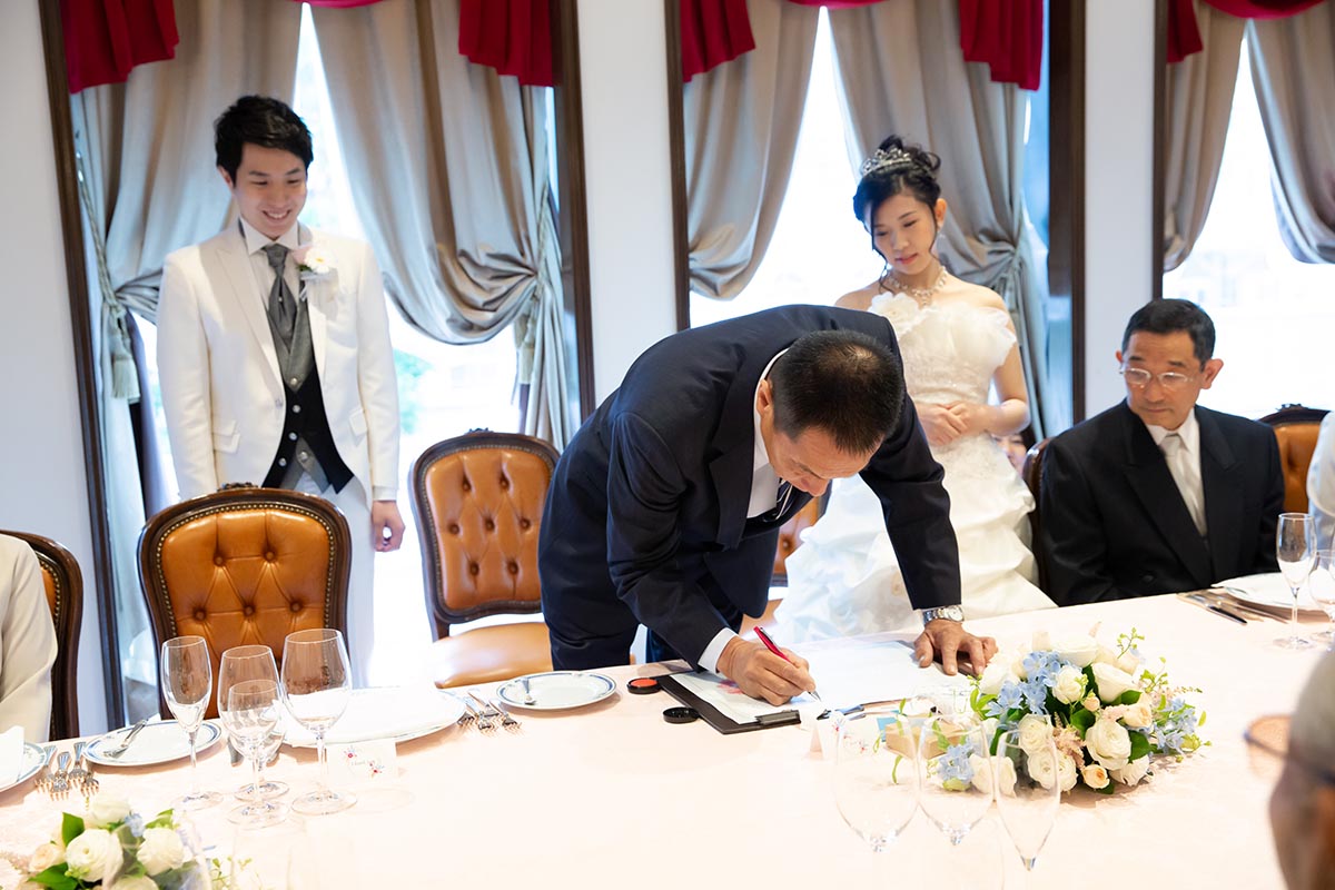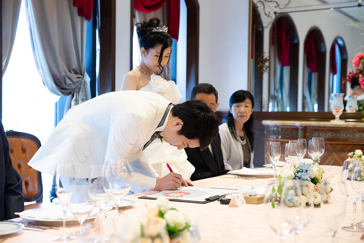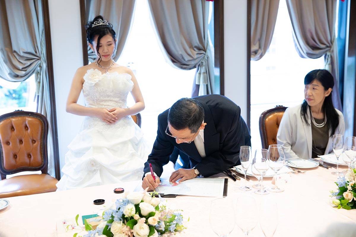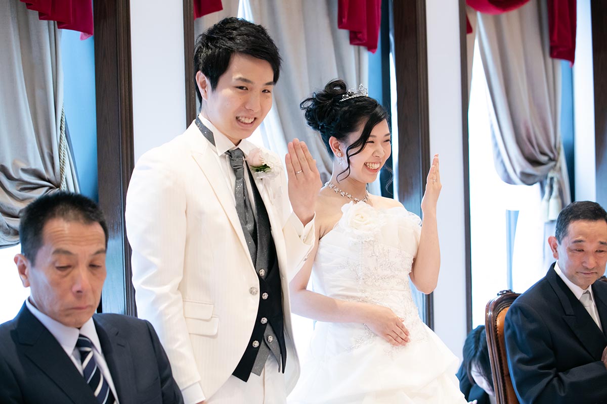 今回のポイントは、料理とウェディングドレスでした。妊娠7ヶ月目という事もありドレスの着用は難しいと思っていましたが、少し大きめのサイズで用意して頂き無事に着ることができました!サイズの都合上選べる範囲は狭くなってしまいましたが、その中から私のイメージに沿った3着をスタッフの方があげて下さりました。どれも素敵なドレスで甲乙つけがたかったのでそれぞれ試着して旦那と決めました。妊婦にも関わらず夢のウェディングドレスを着られたことに感謝しています。しかし、妊婦がドレスとヒールでいることは負担もあり、さらにゲストに90近い祖父母がいることなどから、長時間の式というのが難しかったため流れはシンプルなものにしました。時間を優先し、旦那と相談し削れるところは削っていったためこだわった演出などはありません。その甲斐あって、当日はとてもスムーズに進み、体調も崩すことなく無事に婚姻式を終えることが出来ました。