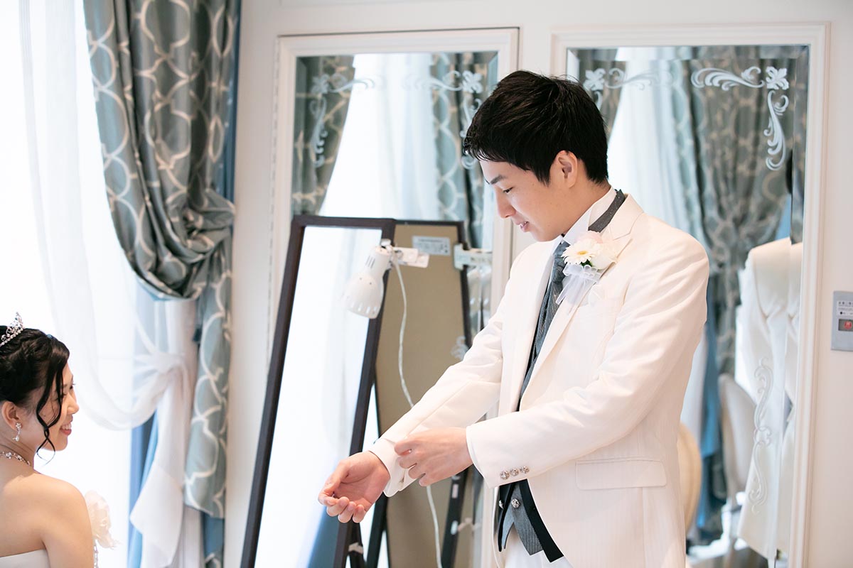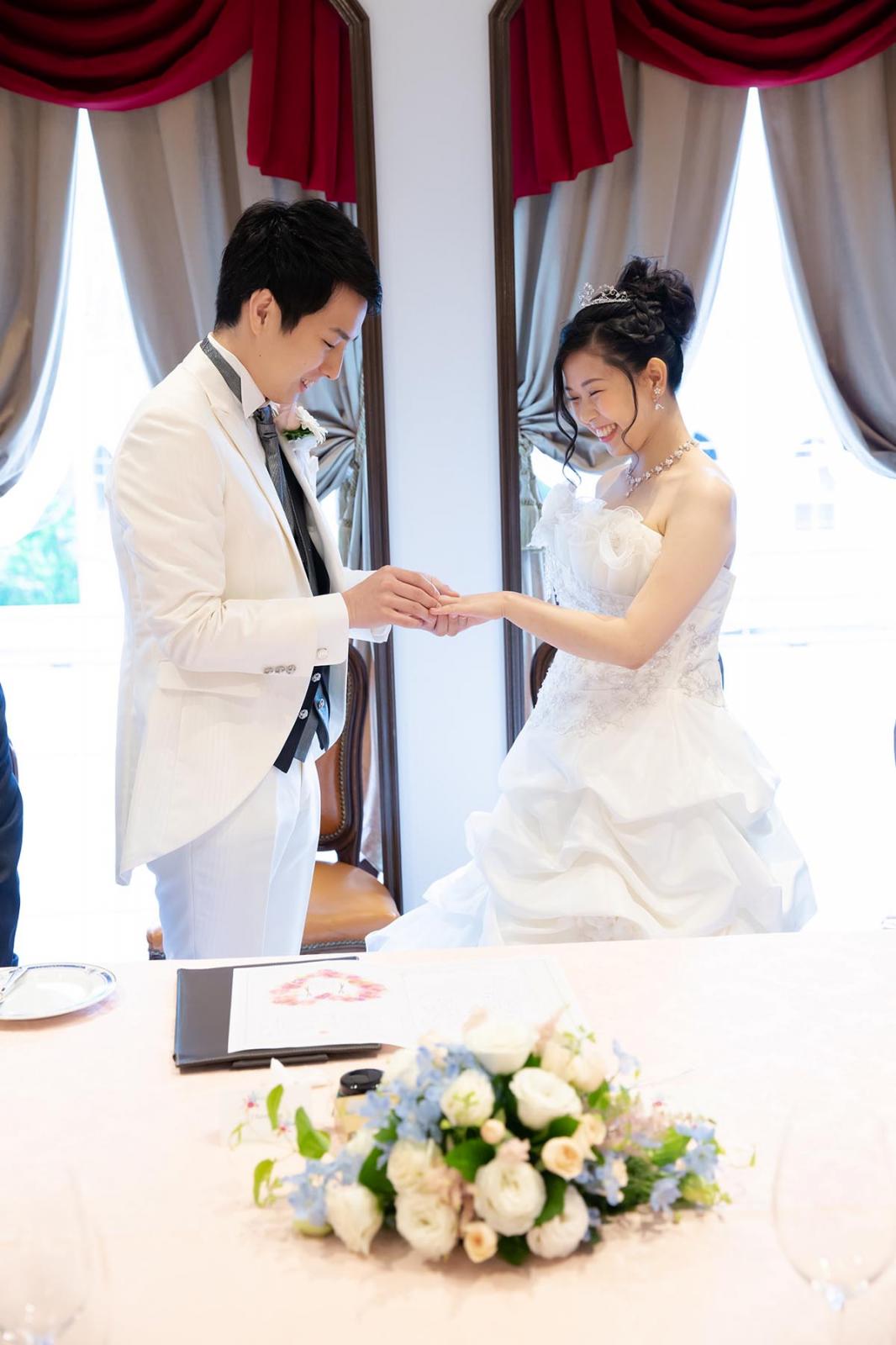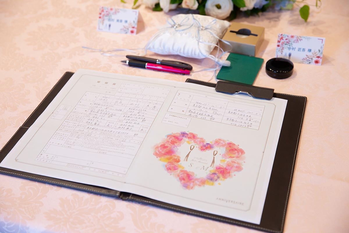 今回のポイントは、料理とウェディングドレスでした。妊娠7ヶ月目という事もありドレスの着用は難しいと思っていましたが、少し大きめのサイズで用意して頂き無事に着ることができました!サイズの都合上選べる範囲は狭くなってしまいましたが、その中から私のイメージに沿った3着をスタッフの方があげて下さりました。どれも素敵なドレスで甲乙つけがたかったのでそれぞれ試着して旦那と決めました。妊婦にも関わらず夢のウェディングドレスを着られたことに感謝しています。しかし、妊婦がドレスとヒールでいることは負担もあり、さらにゲストに90近い祖父母がいることなどから、長時間の式というのが難しかったため流れはシンプルなものにしました。時間を優先し、旦那と相談し削れるところは削っていったためこだわった演出などはありません。その甲斐あって、当日はとてもスムーズに進み、体調も崩すことなく無事に婚姻式を終えることが出来ました。