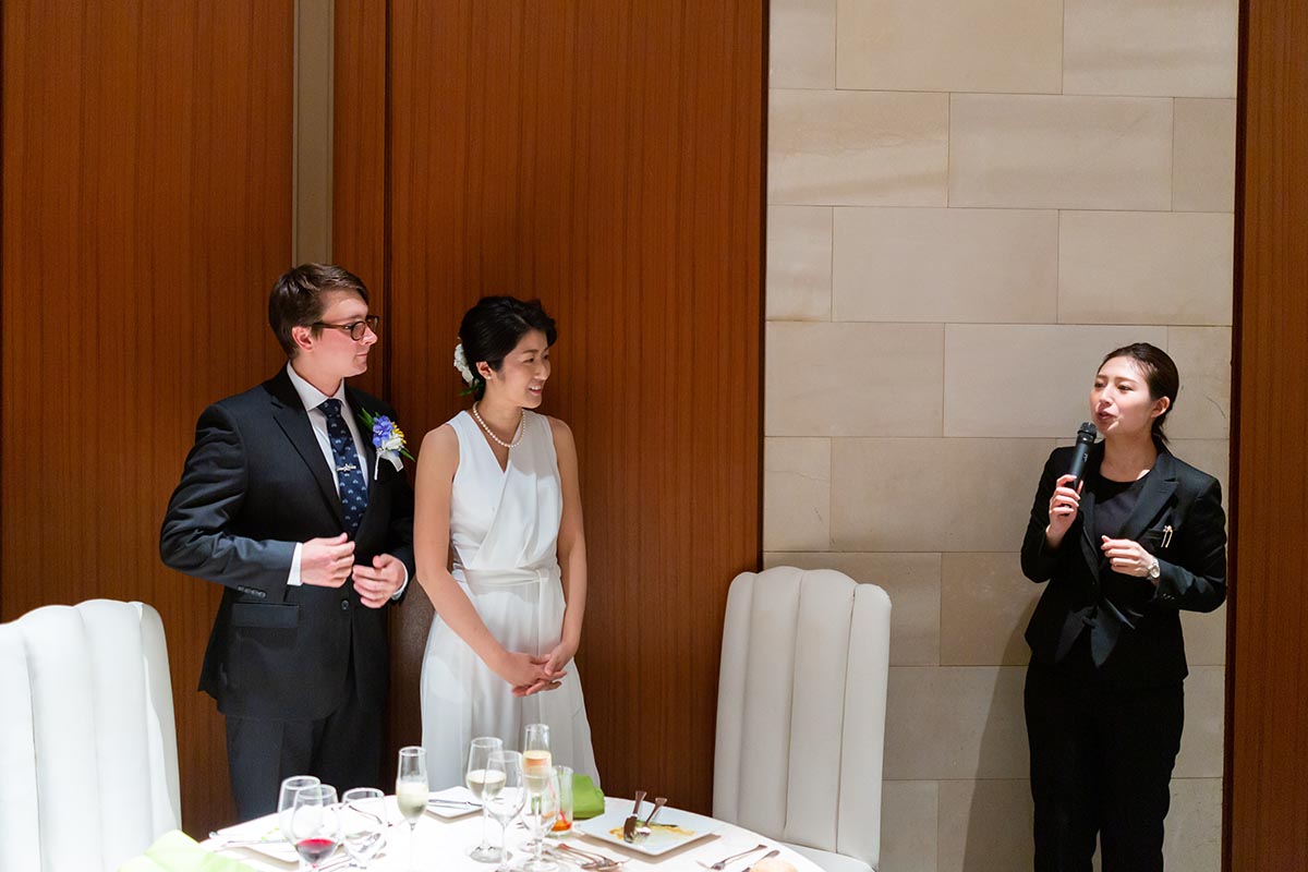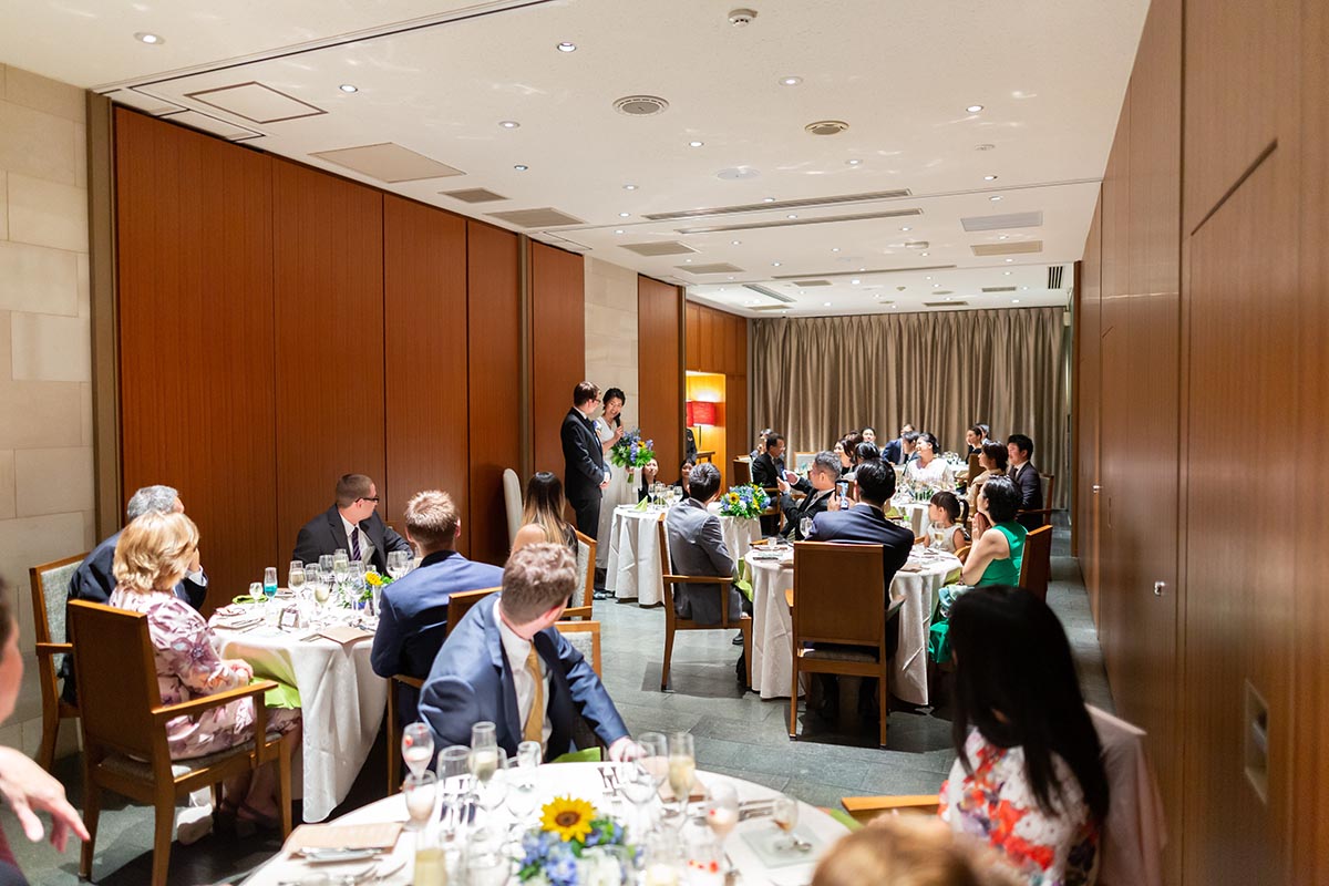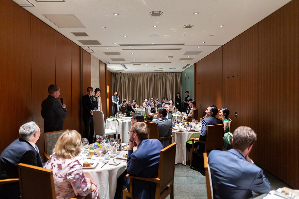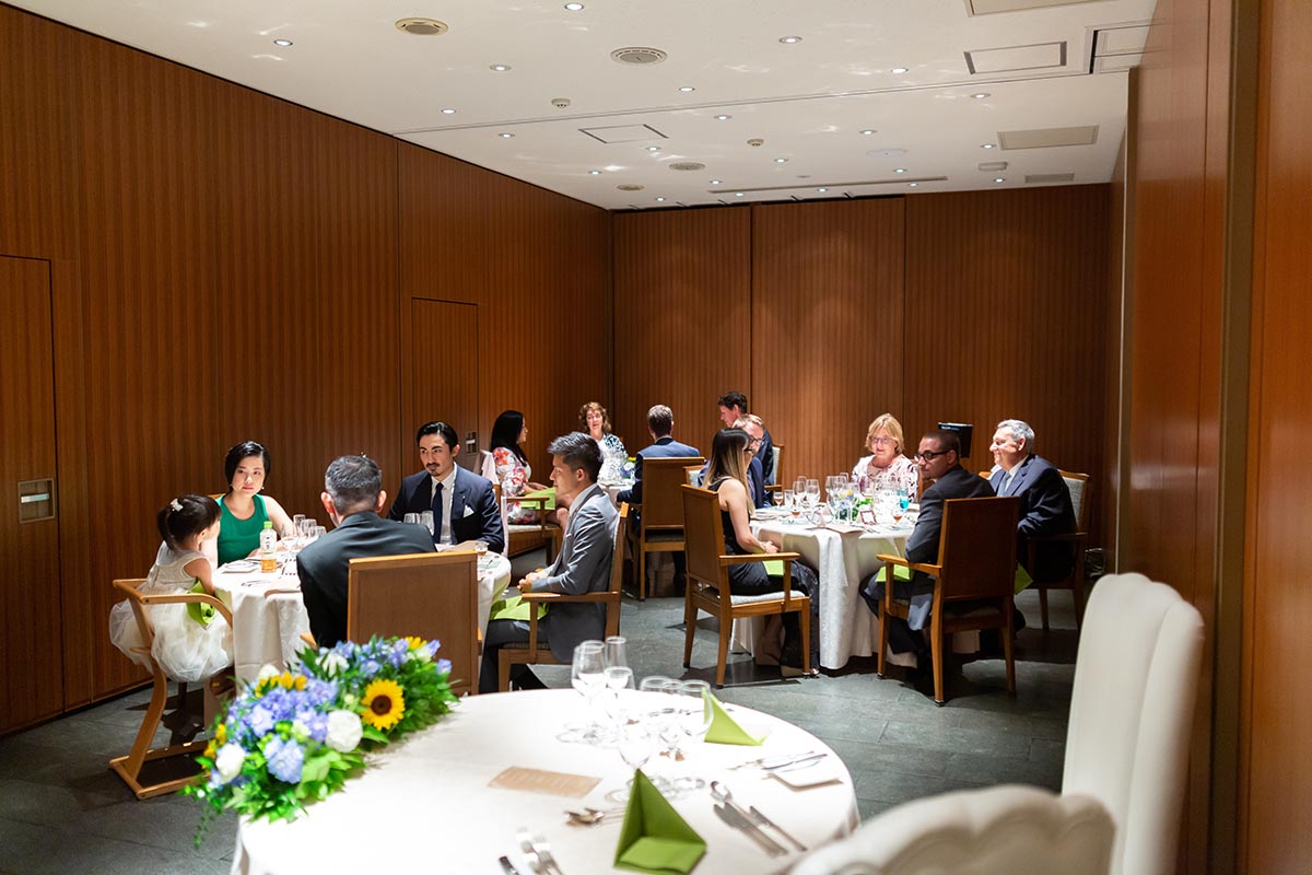 レストランでのお食事ということもあり、お料理は日本人・外国人問わずとても好評でした。フレンチジャパニーズというユニークなコースをお願いしたのですが、見た目も味もとても素晴らしかったです。また子供用のメニューやアレルギーのある方への別メニューなども柔軟に対応していただき、参加してくれた皆が楽しめる食事内容でした。今回ケーキカットはしなかったのですが、デザートも洗練されていてとても満足のいく内容でした。