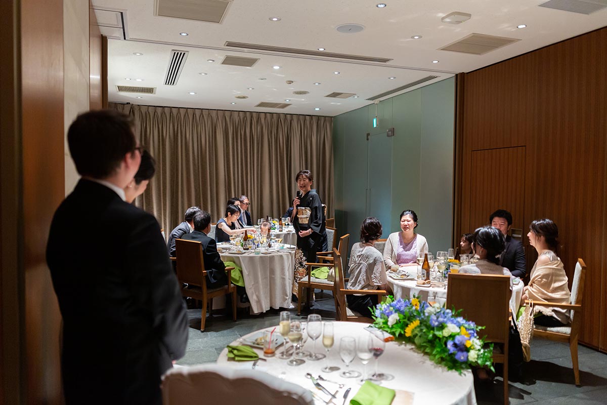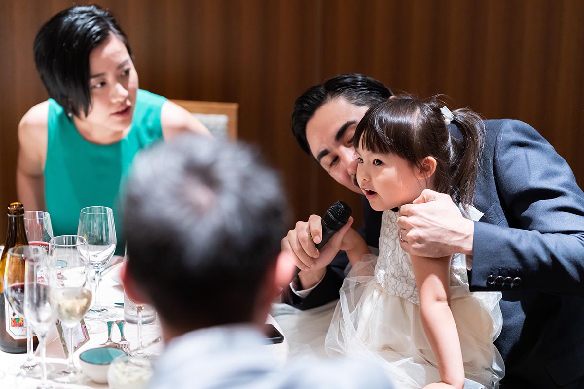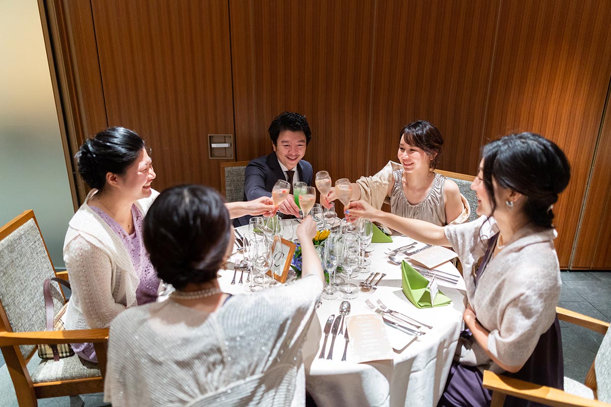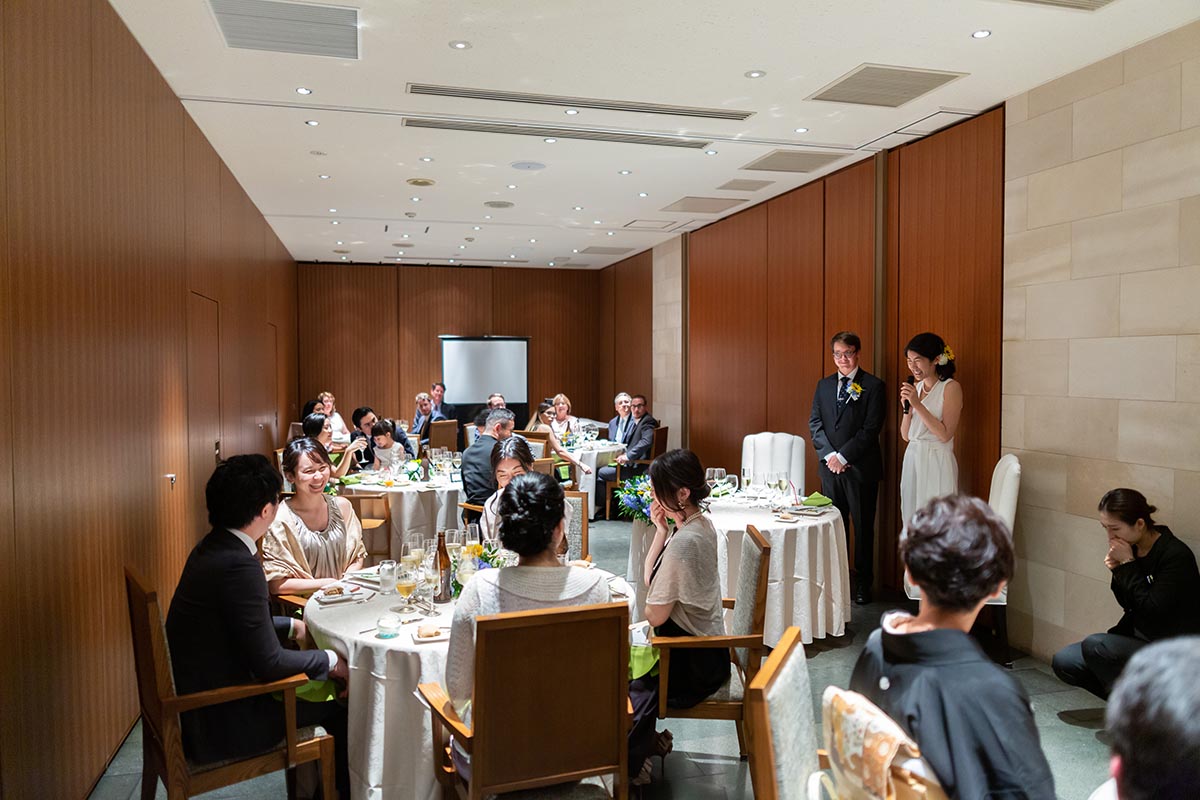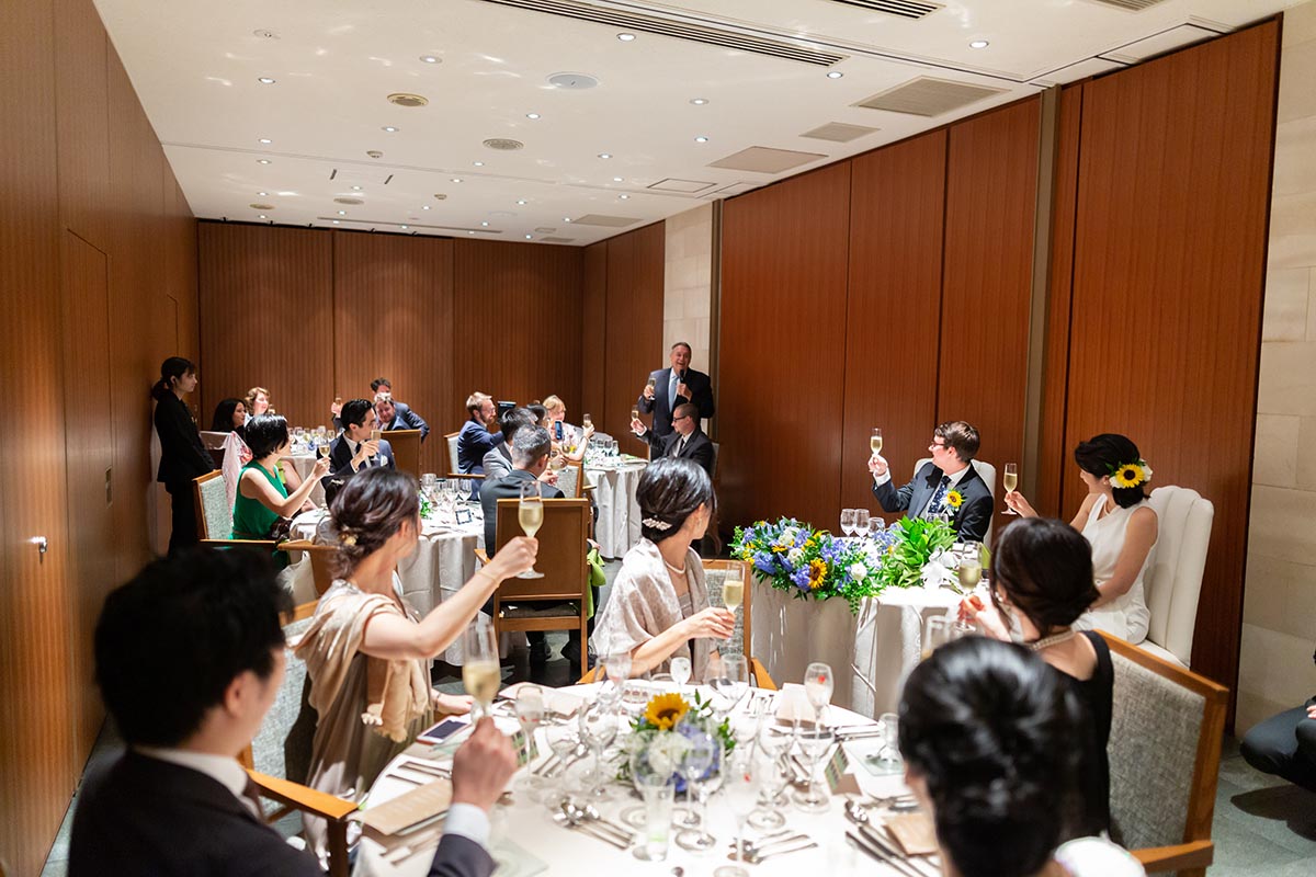レストランでのお食事ということもあり、お料理は日本人・外国人問わずとても好評でした。フレンチジャパニーズというユニークなコースをお願いしたのですが、見た目も味もとても素晴らしかったです。また子供用のメニューやアレルギーのある方への別メニューなども柔軟に対応していただき、参加してくれた皆が楽しめる食事内容でした。今回ケーキカットはしなかったのですが、デザートも洗練されていてとても満足のいく内容でした。