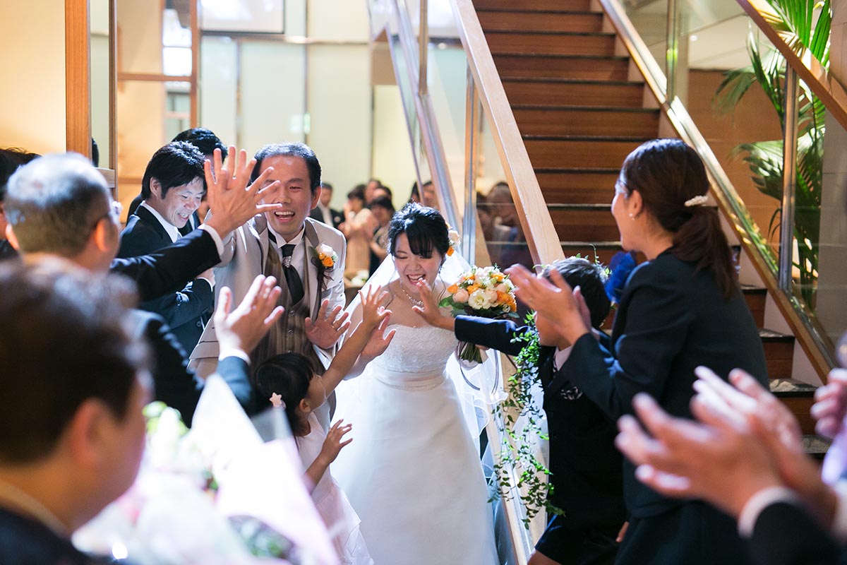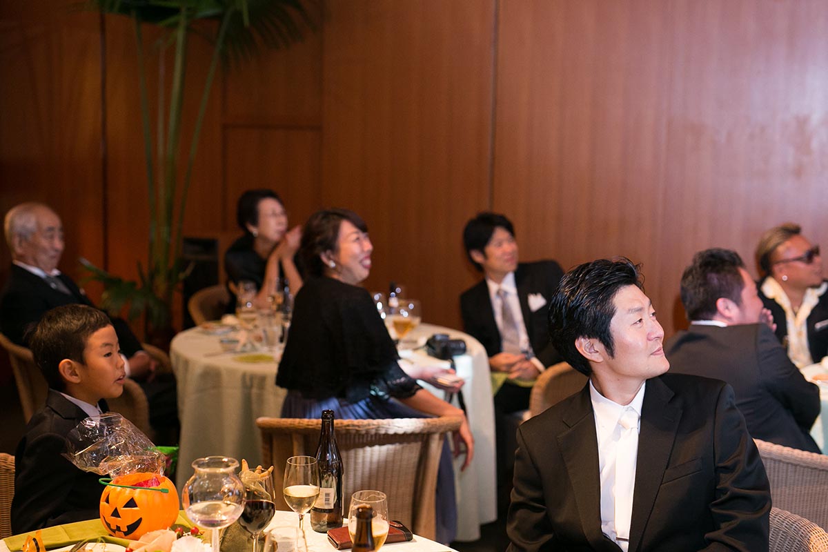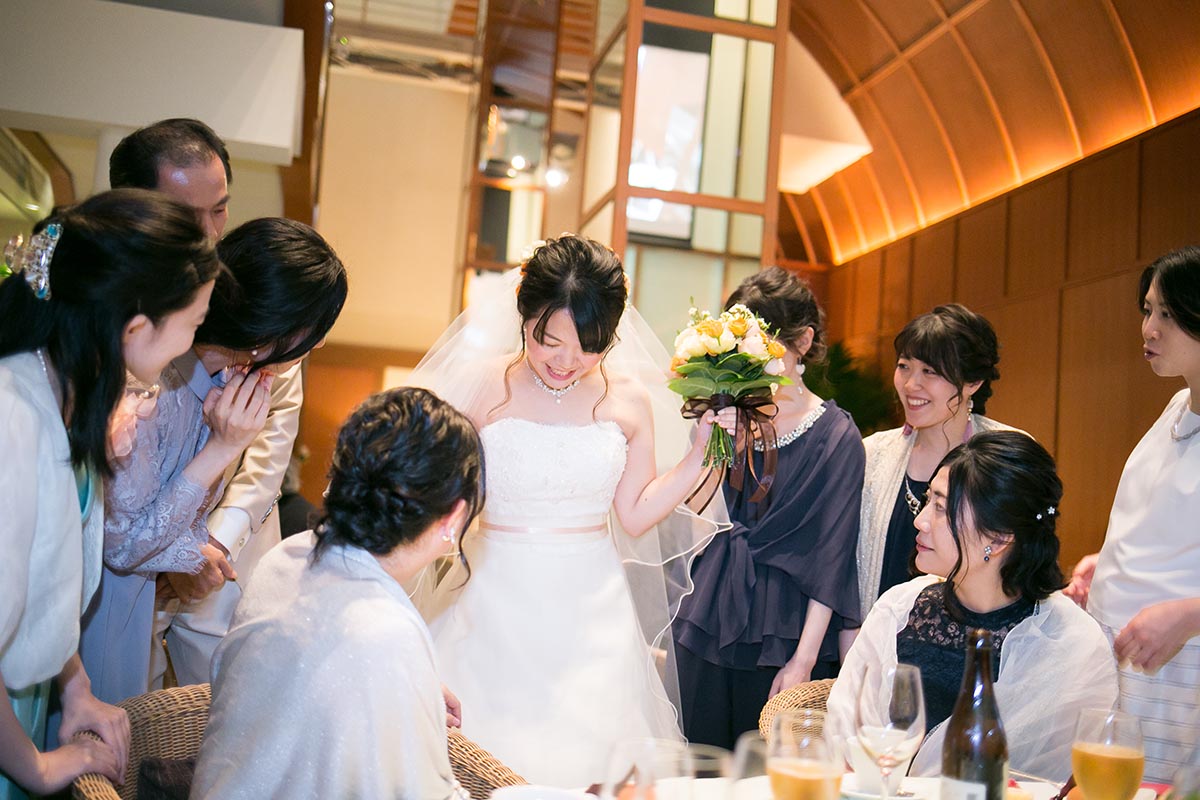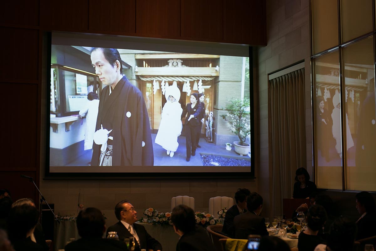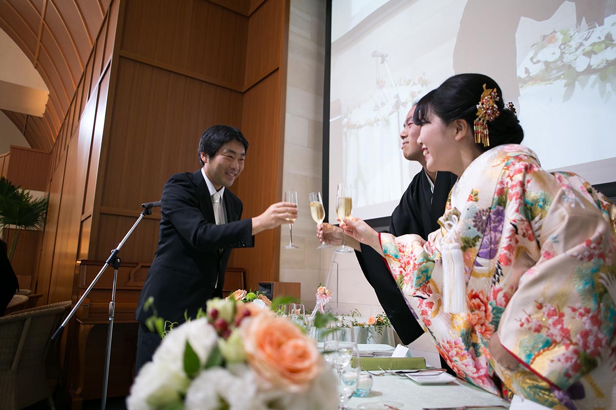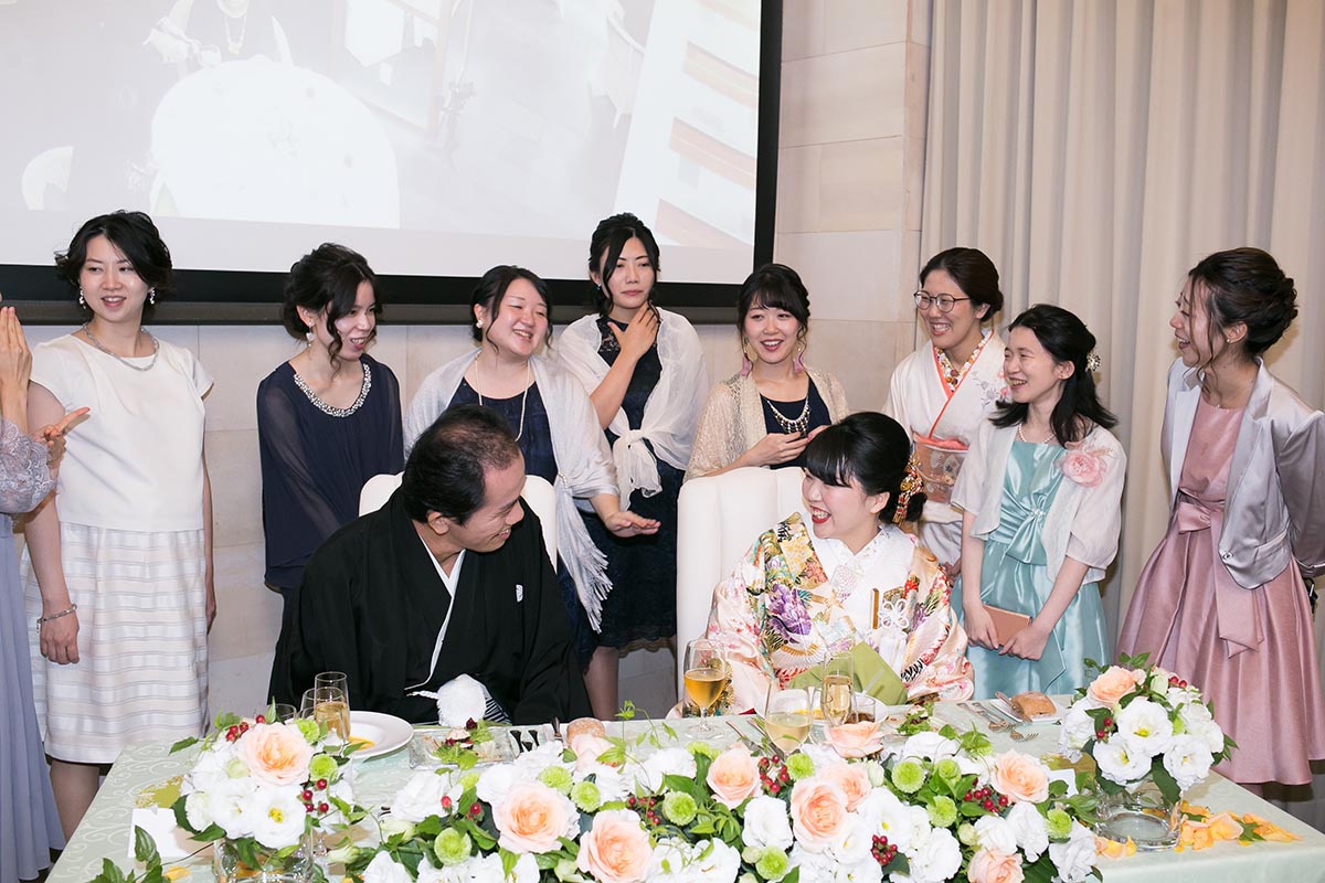 「ゲストの方々と話す時間をたくさん作りたい」というのが一番のこだわりでした。自分が結婚式にゲストとして参列したときに、久々に会えてもあまり話せなかったなと思うことがあったので、できれば一人一人と話す時間を取りたいと考えていました。そのため披露宴の開始前にご挨拶する時間を設けてもらったり、テーブルラウンドの時間を長めにとってもらいました。午前中に神社でお式、午後から披露宴というスケジュールだったのですが、披露宴から参加される方々にも神社での挙式の様子をお伝えしたいということで、当日編集の映像をお色直しの時間に流してもらいました。これが好評で、「晴れ姿きれいだね」と喜んでいただけました。イベントは最小限にしましたが、フラウリーはゲストの方にも参加して楽しんでいただけるかな、ということで取り入れました。会場が暗転し、花びらを入れて光り出した瞬間、わぁと歓声があがり、楽しんでいただけました。