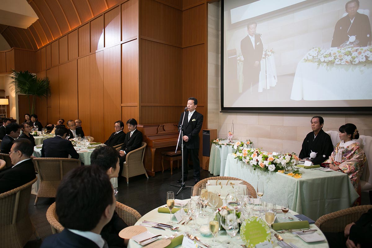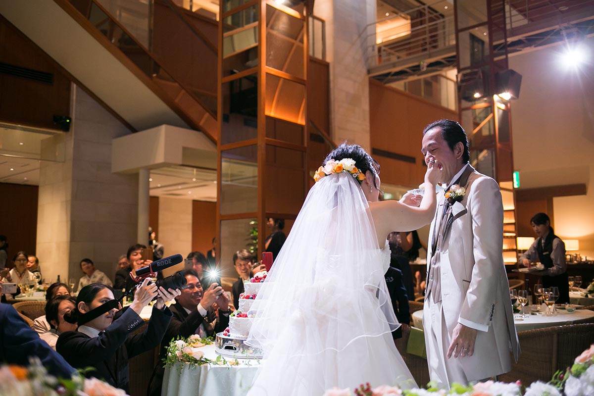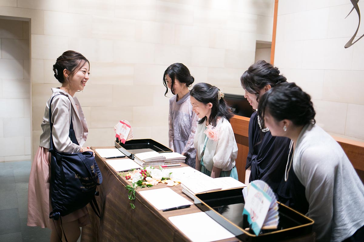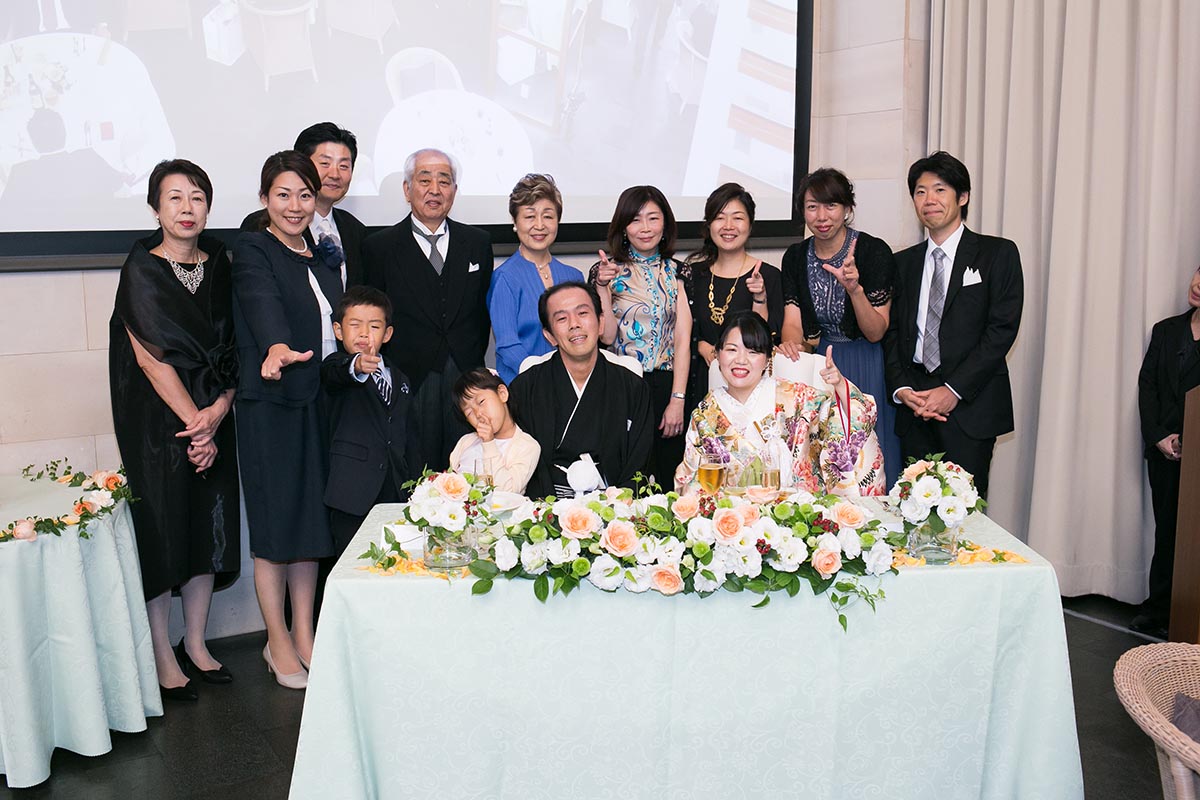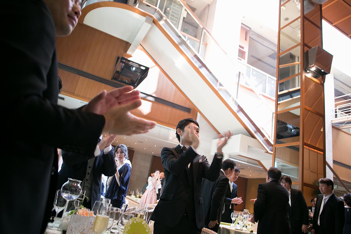 「ゲストの方々と話す時間をたくさん作りたい」というのが一番のこだわりでした。自分が結婚式にゲストとして参列したときに、久々に会えてもあまり話せなかったなと思うことがあったので、できれば一人一人と話す時間を取りたいと考えていました。そのため披露宴の開始前にご挨拶する時間を設けてもらったり、テーブルラウンドの時間を長めにとってもらいました。午前中に神社でお式、午後から披露宴というスケジュールだったのですが、披露宴から参加される方々にも神社での挙式の様子をお伝えしたいということで、当日編集の映像をお色直しの時間に流してもらいました。これが好評で、「晴れ姿きれいだね」と喜んでいただけました。イベントは最小限にしましたが、フラウリーはゲストの方にも参加して楽しんでいただけるかな、ということで取り入れました。会場が暗転し、花びらを入れて光り出した瞬間、わぁと歓声があがり、楽しんでいただけました。