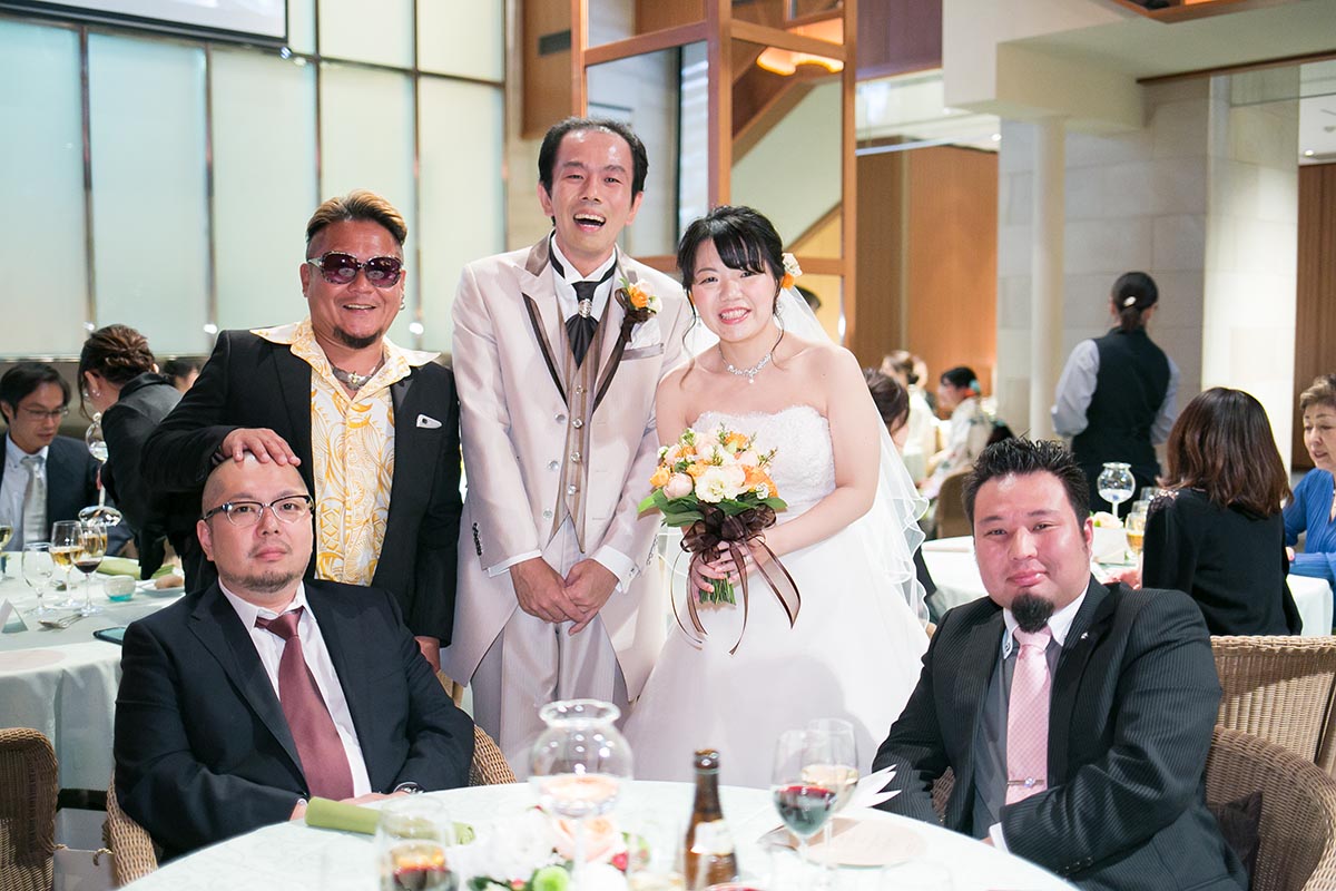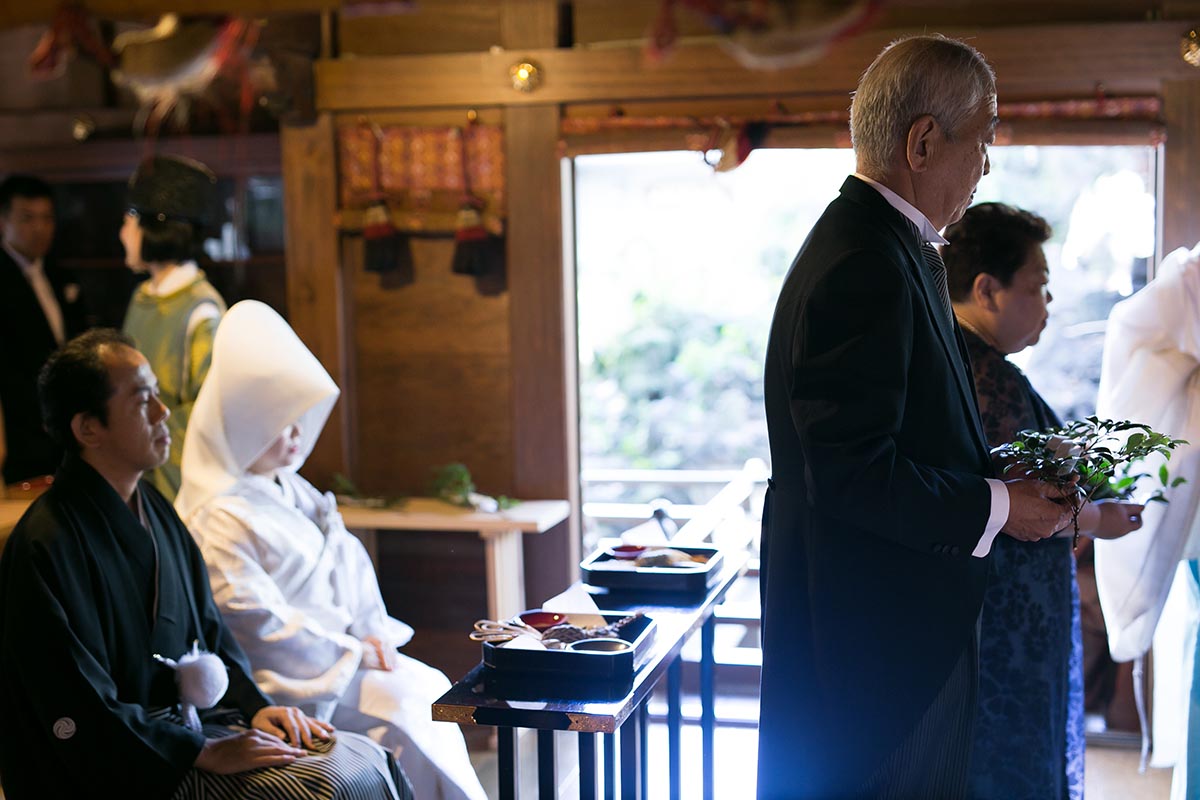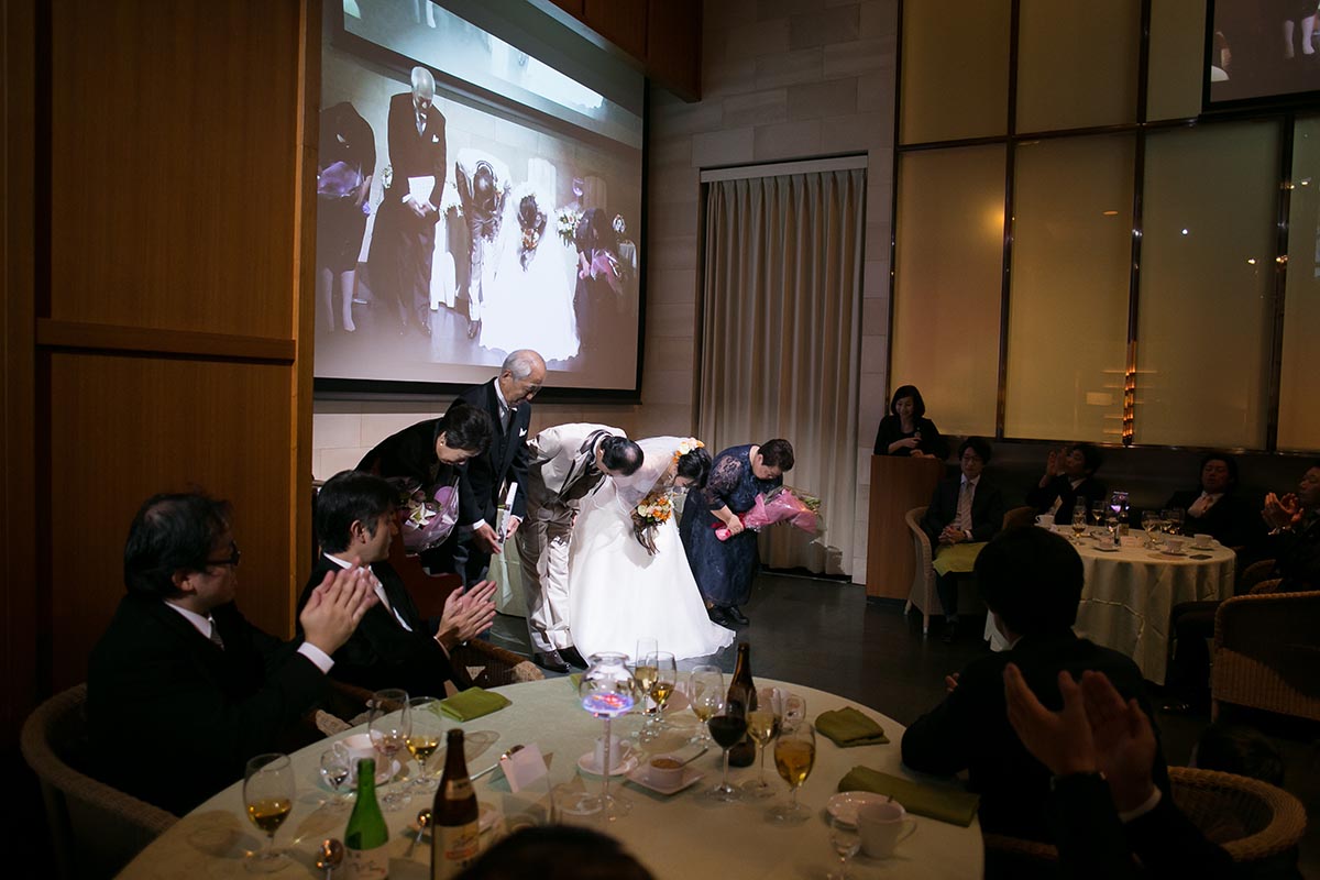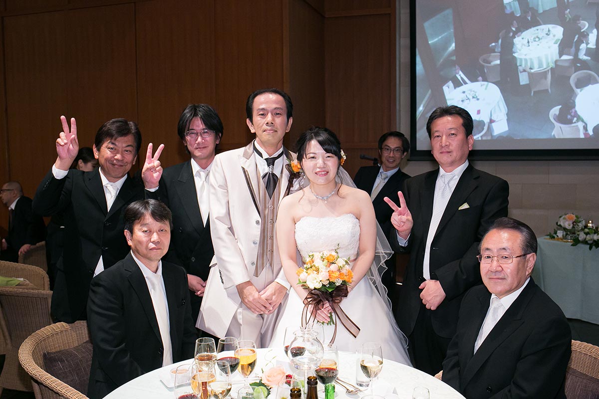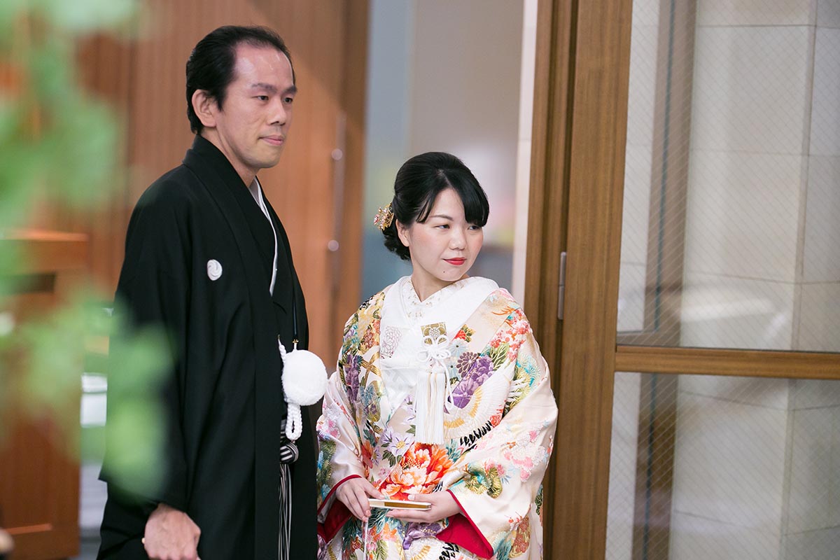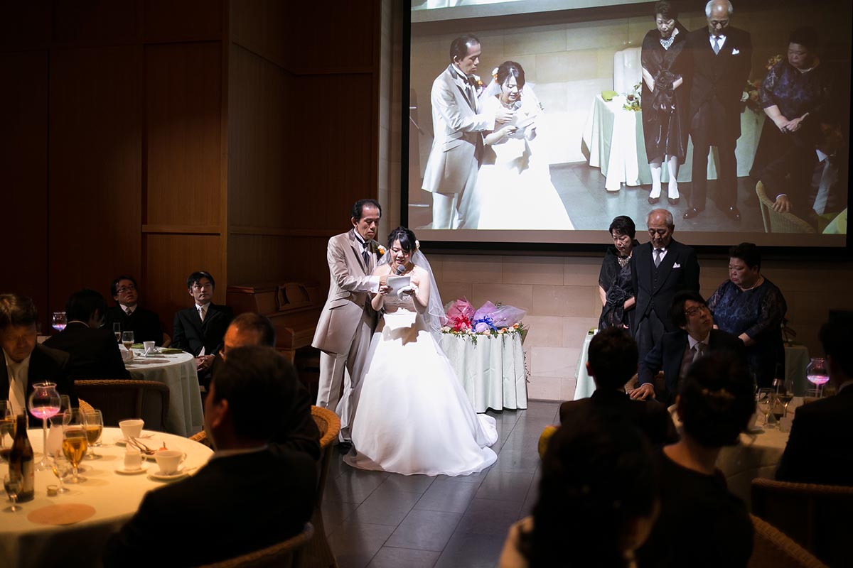 「ゲストの方々と話す時間をたくさん作りたい」というのが一番のこだわりでした。自分が結婚式にゲストとして参列したときに、久々に会えてもあまり話せなかったなと思うことがあったので、できれば一人一人と話す時間を取りたいと考えていました。そのため披露宴の開始前にご挨拶する時間を設けてもらったり、テーブルラウンドの時間を長めにとってもらいました。午前中に神社でお式、午後から披露宴というスケジュールだったのですが、披露宴から参加される方々にも神社での挙式の様子をお伝えしたいということで、当日編集の映像をお色直しの時間に流してもらいました。これが好評で、「晴れ姿きれいだね」と喜んでいただけました。イベントは最小限にしましたが、フラウリーはゲストの方にも参加して楽しんでいただけるかな、ということで取り入れました。会場が暗転し、花びらを入れて光り出した瞬間、わぁと歓声があがり、楽しんでいただけました。